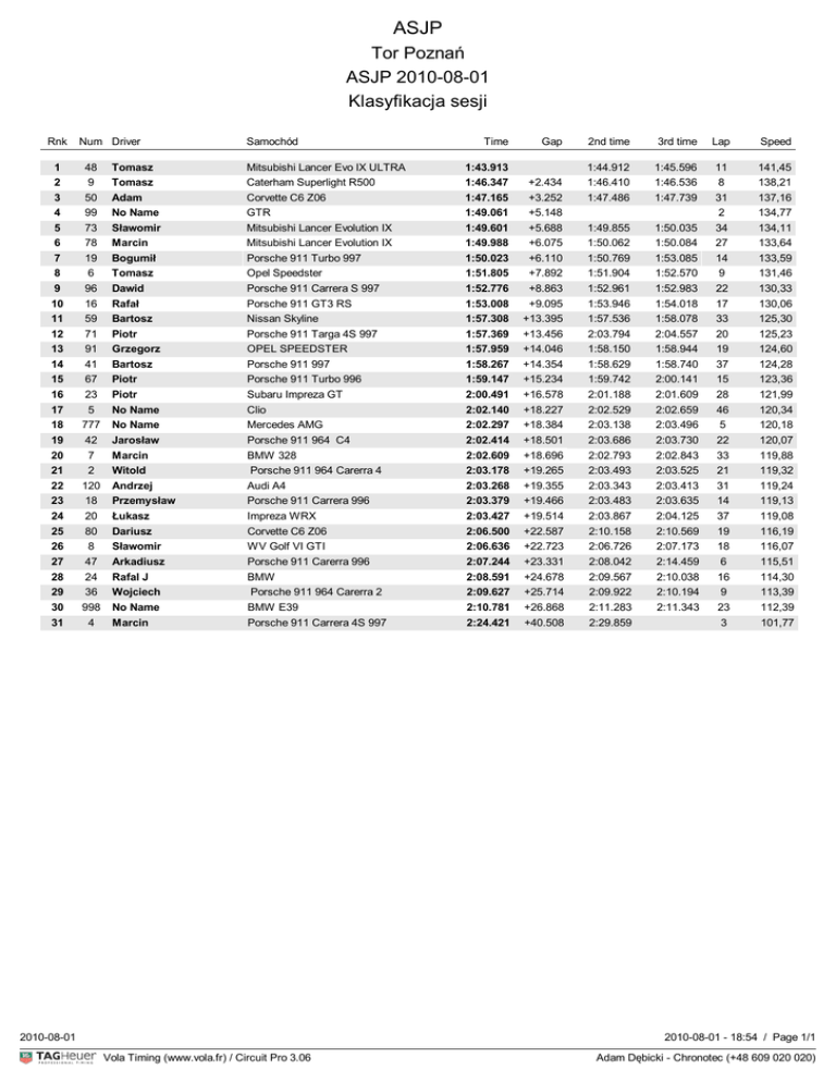 ASJP Tor Poznań ASJP 2010-08-01 Klasyfikacja sesji Rnk 1 2 3 4 5 6 7 8 9 10 11 12 13 14 15 16 17 18 19 20 21 22 23 24 25 26 27 28 29 30 31 Num Driver Samochód 48 9 50 99 73 78 19 6 96 16 59 71 91 41 67 23 5 777 42 7 2 120 18 20 80 8 47 24 36 998 4 Mitsubishi Lancer Evo IX ULTRA Caterham Superlight R500 Corvette C6 Z06 GTR Mitsubishi Lancer Evolution IX Mitsubishi Lancer Evolution IX Porsche 911 Turbo 997 Opel Speedster Porsche 911 Carrera S 997 Porsche 911 GT3 RS Nissan Skyline Porsche 911 Targa 4S 997 OPEL SPEEDSTER Porsche 911 997 Porsche 911 Turbo 996 Subaru Impreza GT Clio Mercedes AMG Porsche 911 964 C4 BMW 328 Porsche 911 964 Carerra 4 Audi A4 Porsche 911 Carrera 996 Impreza WRX Corvette C6 Z06 WV Golf VI GTI Porsche 911 Carerra 996 BMW Porsche 911 964 Carerra 2 BMW E39 Porsche 911 Carrera 4S 997 Tomasz Tomasz Adam No Name Sławomir Marcin Bogumił Tomasz Dawid Rafał Bartosz Piotr Grzegorz Bartosz Piotr Piotr No Name No Name Jarosław Marcin Witold Andrzej Przemysław Łukasz Dariusz Sławomir Arkadiusz Rafal J Wojciech No Name Marcin 2010-08-01 Vola Timing (www.vola.fr) / Circuit Pro 3.06 Time Gap 1:43.913 1:46.347 1:47.165 1:49.061 1:49.601 1:49.988 1:50.023 1:51.805 1:52.776 1:53.008 1:57.308 1:57.369 1:57.959 1:58.267 1:59.147 2:00.491 2:02.140 2:02.297 2:02.414 2:02.609 2:03.178 2:03.268 2:03.379 2:03.427 2:06.500 2:06.636 2:07.244 2:08.591 2:09.627 2:10.781 2:24.421 +2.434 +3.252 +5.148 +5.688 +6.075 +6.110 +7.892 +8.863 +9.095 +13.395 +13.456 +14.046 +14.354 +15.234 +16.578 +18.227 +18.384 +18.501 +18.696 +19.265 +19.355 +19.466 +19.514 +22.587 +22.723 +23.331 +24.678 +25.714 +26.868 +40.508 2nd time 3rd time Lap Speed 1:44.912 1:46.410 1:47.486 1:45.596 1:46.536 1:47.739 1:49.855 1:50.062 1:50.769 1:51.904 1:52.961 1:53.946 1:57.536 2:03.794 1:58.150 1:58.629 1:59.742 2:01.188 2:02.529 2:03.138 2:03.686 2:02.793 2:03.493 2:03.343 2:03.483 2:03.867 2:10.158 2:06.726 2:08.042 2:09.567 2:09.922 2:11.283 2:29.859 1:50.035 1:50.084 1:53.085 1:52.570 1:52.983 1:54.018 1:58.078 2:04.557 1:58.944 1:58.740 2:00.141 2:01.609 2:02.659 2:03.496 2:03.730 2:02.843 2:03.525 2:03.413 2:03.635 2:04.125 2:10.569 2:07.173 2:14.459 2:10.038 2:10.194 2:11.343 11 8 31 2 34 27 14 9 22 17 33 20 19 37 15 28 46 5 22 33 21 31 14 37 19 18 6 16 9 23 3 141,45 138,21 137,16 134,77 134,11 133,64 133,59 131,46 130,33 130,06 125,30 125,23 124,60 124,28 123,36 121,99 120,34 120,18 120,07 119,88 119,32 119,24 119,13 119,08 116,19 116,07 115,51 114,30 113,39 112,39 101,77 2010-08-01 - 18:54 / Page 1/1 VolaSoftControlPdf Adam Dębicki - Chronotec (+48 609 020 020)