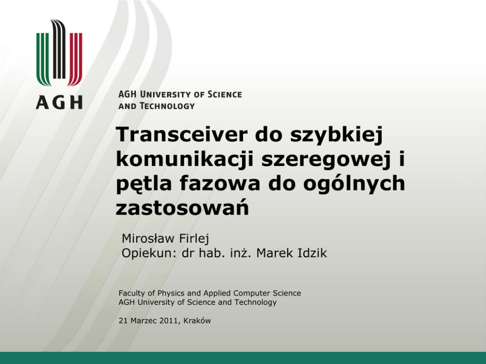 Transceiver do szybkiej komunikacji szeregowej i pętla fazowa do ogólnych zastosowań Mirosław Firlej Opiekun: dr hab. inż. Marek Idzik Faculty of Physics and Applied Computer Science AGH University of Science and Technology 21 Marzec 2011, Kraków Plan prezentacji • • • • • • • • Założenia i cele projektu Architektura i projekt transceiver'a Stanowisko pomiarowe Pomiary transceiver'a – Zakres częstotliwości pracy PLL i CDR – Efektywność transmisji danych Drugi prototyp pętli fazowej – projekt i pomiary Wstępne testy transmisji kablowej Podsumowanie Plany na przyszłość Możliwe zastosowania • Możliwe zastosowania – Szybka transmisja danych z detektora świetlności w ILC (International Linear Collider) – Serializacja i transmisja danych z wielokanałowych przetworników analogowocyfrowych (ADC) – Pomiary czasowe dla eksperymentów fizyki wysokich energii z wykorzystaniem układów PLL lub DLL Założenia projektu transceiver'a • Wydajny odczyt danych z detektora świetlności (LumiCal) w ILC • Maksymalna szybkość pracy w technologii AMS 0.35 μm • Szeroki zakres częstotliwości transmisji • Pętla fazowa ogólnego przeznaczenia możliwa do zastosowania także w innych układach Detektor Prototyp transceiver'a AMS 0.35 μm LumiCal -architektura systemu odczytu prototypes designed at AGH-UST in AMS 0.35 μm – Peaking time 60ns – 10 bit, ENOB = 9.3 – CR-RC shaping – 1kHz – 45MHz sample freq. – Variable gain – ~0.8 mW / MHz Bloki transceiver'a • Nadajnik i Odbiornik były głównym zdaniem projektu • Szybkie (~1GHz) szeregowe bufory – LVDS (Low Voltage Differential Signaling) – istniejący projekt • Logika kodująca i dekodująca – zaimplementowana w programie komputerowym Architektura transceiver'a Nadajnik (Tx) Odbiornik (Rx) • Konwerter danych równoległych na postać szeregową • Konwerter danych szeregowych na postać równoległą • Zegar do ~1GHz z pętli fazowej (PLL) • Zegar jest synchronizowany z nadajnikiem za pomocą CDR Pętla fazowa (PLL) jako blok używany do generacji częstotliwości • Pętla fazowa drugiego rodzaju • Oscylator sterowany napięciem (VCO) • Cztery częstotliwości pracy: – 120MHz, 240MHz, 480MHz oraz 960MHz Oscylator (VCO) Układ odzyskiwania zegara i danych (CDR) • Synchronizuje przebieg zegarowy między nadajnikiem i odbiornikiem • Burst mode CDR (dwa dodatkowe VCO sterowane poziomami sygnału danych) • Każda zmiana poziomu danych restartuje przebieg zegarowy z ustaloną fazą • Odzyskiwanie danych – usuwanie szumów i zakłóceń • Logika decyzyjna na przerzutniku D Maski technologiczne transceiver'a • Prototypowy układ zawiera dwa odbiorniki i dwa nadajniki • Jedna para Rx-Tx jest wewnętrznie połączona • Druga para z buforami LVDS wyprowadzona na zewnątrz • Rozmiar Odbiornika: 300 μm x 190 μm • Rozmiar Nadajnika: 260 μm x 160 μm Rdzeń systemu pomiarowego • Szybka pętla transmisji (Virtex 5 efektywności transmisji • FPGA • PC Transceiver Virtex 5) do pomiarów ASIC 8-bitowa magistrala (1 Gb/s = 125 MB/s) z LVDS Virtex 5 wolna transmisja (pakiet danych do 32 kB) • Program w C++ do kodowania, dekodowania i analizy danych • Kodowanie 8b/10b zapewniające danych dla układu CDR wystarczającą liczbę zmian linii Aparatura pomiarowa – podczas testów Pomiary pętli fazowej w trybie 960MHz Częstotliwość pętli przestrajana poprzez zmianę częstotliwości referencyjnej PLL w odbiorniku PLL w nadajniku • 480 ÷ 1072 MHz przy 3.3V VDD • 424 ÷ 1088 MHz przy 3.3V VDD • Częstotliwość pracy od 288MHz (2.0V) do 1128MHz (przy 3.5V) • Częstotliwość pracy od 288MHz (2.0V) do 1136MHz (przy 3.5V) Obie pętle pracują w szerokim zakresie częstotliwości i zasilania Widma częstotliwości wyjściowej pętli fazowej (pierwszy prototyp układu) Widma częstotliwości maksymalnej osiąganej we wszystkich trybach pracy Mierzone za pomocą Agilent 4395A Pomiary układu CDR w trybie 960MHz Widma mierzone za pomocą analizatora Agilent 4395A: • Brak transmisji (CDR nie pracuje) • Transmisja (CDR pracuje normalnie) Transmitter crosstalk via cables • Częstotliwość nadajnika =960MHz • Częstotliwość odbiornika ~965MHz • 5MHz (0.5%) offsetu • CDR nie ma synchronizacji • Częstotliwość odbiornika taka sama jak nadajnika • CDR działa poprawnie Pomiary transmisji danych - wydajność • Pakiet testowy – 32kB losowych danych z kodowaniem 8b/10b Wydajność, tryb 960MHz • Pakiet wysyłany 20 razy (640kB) dla każdej częstotliwości i napięcia zasilania Wydajność, tryb 480MHz • Wydajność 100% – to brak błędu w całym pakiecie 640kB Wydajność transmisji danych... Wydajność, tryb 960MHz Obszar wydajności 100%, tryb 960MHz Obszar wydajności 100% w trybie 960MHz: Prototyp działa w pełni poprawnie w szerokim • Od 640 do 976 MHz przy 3.3V zakresie: napięć • Od 386MHz (przy 2.1V) do 992MHz zasilania i częstotliwości (przy 3.5V) Pobór mocy przez układ transceiver'a • Pierwszy prototyp nie był optymalizowany pod względem poboru prądu (mocy) • Pobór mocy: 45mW przy 960MHz oraz 3.3V zasilania • Po równo ~22.5mW: odbiornik i nadajnik • Oszacowany (bazujący na pomiarach drugiego prototypu PLL) pobór prądu będzie 4 razy mniejszy • Całkowity szacunek poboru mocy w technologii AMS 0.35 μm dla drugiego transceivera: ~6÷8mW nadajnik + ~6÷8mW odbiornik Projekt pętli fazowej o niskim poborze mocy (drugi prototyp) • Pętla fazowa drugiego rodzaju • Oscylator sterowany napięciem • Jeden tryb pracy ~1GHz z szerokim zakresem przestrajania • Częstotliwość wejściowa pomnożona przez 32 • Multipleksowane wyjście LVDS z dzielnika • Buforowane napięcie z filtru dolnoprzepustowego (LPF) • Niski pobór mocy (~4mW) Projekt pętli fazowej - Layout • Założenia: – Maksymalna możliwa częstotliwość pracy w technologii AMS 0.35 μm – Szeroki zakres cz