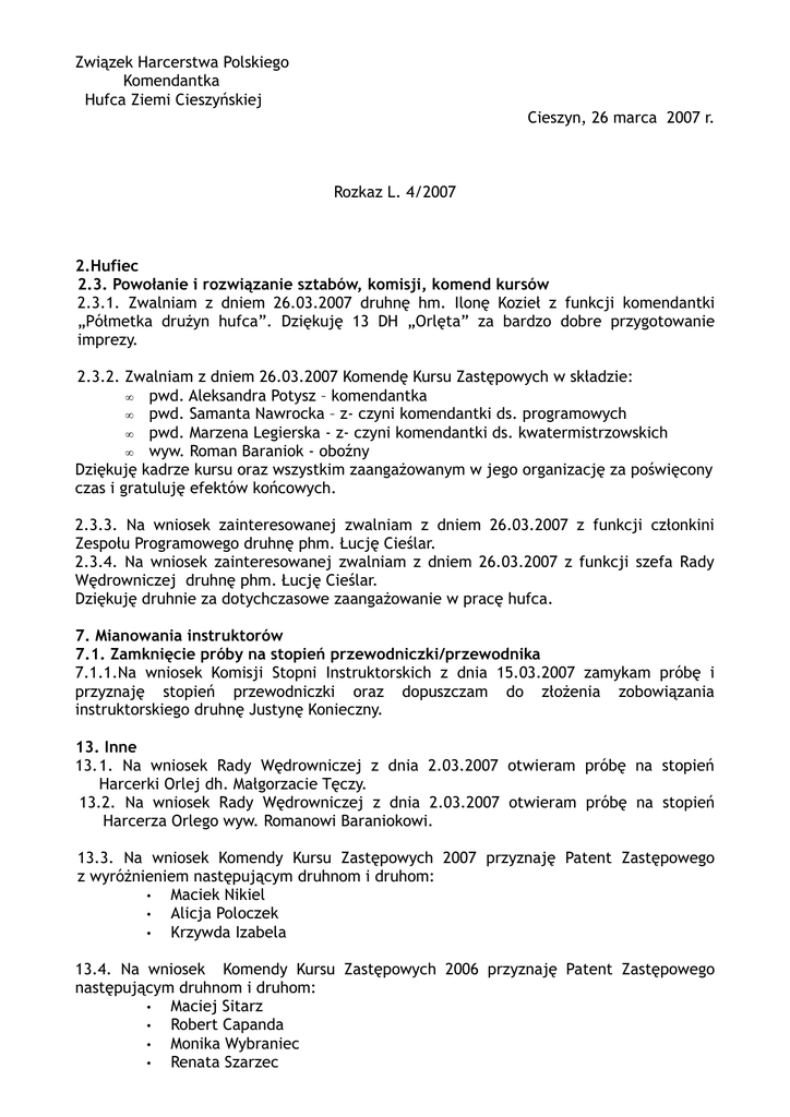 Rozkaz L. 4/2007 - Hufiec Ziemi Cieszyńskiej