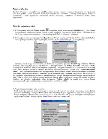 Tabele w Wordzie Tabela w Wordzie to uporządkowany układ komórek w postaci wierszy i kolumn, w które może być wpisywany tekst lub grafika. Każda komórka może być formatowana oddzielnie. Możemy wyrównywać liczby w kolumnach, a także wykonywać sortowanie i proste obliczenia. Dodatkowo w Wordzie można tabele zagnieżdżać.. Techniki wstawiania tabel 1) Wykorzystując polecenie Wstaw tabelę znajdujące się na pasku narzędzi Standardowy. Po wybraniu tego polecenia należy przeciągnąć myszką w dół, określając tym samym liczbę wierszy i kolumn nowej tabeli (na rysunku obok pokazano wybór rozmiaru tabeli 3x4 – 3 wiersze, 4 kolumny). 2) Wybierając z menu rozwijalnego Tabela polecenie Wstaw i następnie Tabelę. Wybór polecenia Tabela z menu górnego dostarcza najwięcej narzędzi, zarówno do tworzenia tabeli jak i jej modyfikacji. Elementy tabeli mogą być usuwane lub dodawane za pomocą poleceń: Usuń/dodaj komórki, wiersze, kolumny, albo mogą być łączone lub dzielone → Scalaj komórki lub Podziel komórki.... W menu Tabela, możemy także zaznaczyć wiersz, kolumnę (lub całą tabelę) i następnie sformatować je niezależnie od pozostałej części tabeli. Możliwe jest także ustalanie dokładnych wymiarów wierszy i kolumn oraz „Autoformatowanie tabeli...”, tzn.: wybranie szablonu tabeli udostępnionego przez program WORD, umożliwiającego dostosowanie jej wyglądu do potrzeb użytkownika. Do tabeli można dostawiać także Nagłówki (takie jak np. nazwy miesięcy, dni tygodnia), które będą powtarzane na każdej następnej stronie. Zaznaczoną tabelę można konwertować na tekst. Tekst w tabeli może być sortowany (polecenie: Sortuj tekst...) malejąco, rosnąco lub według akapitów. Możliwe jest również rozdzielanie tabeli (polecenie: Podziel tabelę) na części oraz pisanie formuł matematycznych w jej komórkach (np. dodaj wartości z komórki A1 i B8). 3) Przekształcając istniejący tekst w tabelę. Jeżeli mamy już napisany tekst można go w prosty sposób zamienić na tabelę wybierając z menu Tabela polecenie Konwertuj i następnie Przekształć tekst na tabelę. Pojawi się pokazane niżej okno dialogowe, w którym podajemy separator tekstu (najczęściej jest to znak tabulatora lub spacja), a następnie inne wymagane opcje (liczbę kolumn i wierszy, sposób dopasowania szerokości kolumn itd.). Ćwiczenie Wpisać poniższy tekst i zamienić go na tabelę wybierając polecenie Konwertuj tekst na tabelę. Jako separator tekstu włączyć inny i wpisać znak spacji. Dodatkowo włączyć opcję Autodopasowanie do zawartości. ABCDE 35645 A B C D E 3 5 6 4 5 4) Poprzez rysowanie tabeli . Ten sposób pozwala na bardzo szybkie budowanie nawet bardzo skomplikowanych tabel. Przypomina rysowanie na papierze milimetrowym. Najpierw rysujemy linie z jednego punktu do drugiego – po przekątnej – definiując tym granice całej tabeli. Następnie rysujemy pozostałe linie tabeli. Początek (określenie wielkości tabeli) I dalej ... Punkt początkowy tabeli Ćwiczenie do samodzielnego wykonania Wykorzystując polecenie Rysuj tabelę utworzyć tabelę pokazaną poniżej. Uwaga: jeżeli uznamy, że narysowana linia jest błędna wystarczy wybrać gumkę usunięcia. i wskazać linie tabeli do Formatowanie tabeli Narzędzia do formatowania tabeli możemy wybrać albo z menu rozwijalnego Tabela albo włączając pasek narzędzi Tabele i krawędzie (z menu Widok Paski narzędzi). Poniżej omówiono krótko ważniejsze polecenia: Rysuje tabelę (włącza / wyłącza polecenie) Wymazuje wskazaną linię tabeli Wybór stylu linii (rozwijalna lista) Wybór grubości linii Wybór koloru linii obramowania Lista rozwijalna Krawędzie i linie Wybór koloru wypełnienia Wstaw tabelę – lista rozwijalna pozwalająca także na wstawienie nowych wierszy (kolumn), oraz sterowanie szerokością kolumn Scala zaznaczone komórki Dzieli zaznaczone komórki Steruje wyrównywaniem tekstu (grafiki) w komórce, zarówno w poziomie jak i w pionie Rozkłada wiersze / kolumny równomiernie (jednakowe wysokości / szerokości) Włącza okno „Autoformatowanie” tabeli Steruje kierunkiem przepływu tekstu w komórce Sortuje zawartość tabeli rosnąco /malejąco Autosumowanie wybranych komórek tabeli Sterować krawędziami i cieniowaniem tabeli (komórek), można także za pomocą polecenia Obramowanie i cieniowanie wywoływanego z menu rozwijalnego Format. Reguły dostosowywania krawędzi są proste. Najpierw wybieramy ogólne ustawienia (z lewej strony okna Obramowanie i cieniowanie Krawędzie): brak, ramka itd., a następnie definiujemy styl + kolor + szerokość linii i w końcu na oknie podglądu wskazujemy, która krawędź ma być rysowana zdefiniowanym stylem. Sterowanie obramowanie i cieniowaniem. W prawym oknie podano przykład zdefiniowanego stylu. Krawędzie zewnętrzne są rysowane linią potrójną pogrubioną, poziome linie siatki linią podwójną a pionowe potrójną (niżej wygląd końcowy tabeli) W celu specjalnego wyróżnienia tylko jednej komórki (lub wiersza czy też kolumny) należy najpierw ją zaznaczyć, a dopiero później wywołać polecenie dotyczące krawędzi i cieniowania. Ćwiczenie do samodzielnej realizacji Utworzyć i sformatować tabelę jak na poniższym rysunku. Na zakończenie zapisać dokument na dyskietce. Należy wykorzystać polecenia dotyczące scalania komórek oraz zmiany szerokości i wysokości komórek. Edycja całej tabeli i jej elementów Utworzyć tabelę 3x3 i umieścić kursor w dowolnym miejscu w środku tabeli (w przeciwnym wypadku polecenie Właściwości tabeli będzie niedostępne). Wywołać z menu Tabela polecenie właściwości tabeli – rysunek poniżej: Okno dialogowe Właściwości tabeli W pierwszym oknie można sterować położeniem tabeli względem marginesów pionowych i tekstu. Włączamy opcję Wyśrodkuj (identyczny efekt uzyskujemy po zaznaczeniu tabeli i wybraniu jednego z przy