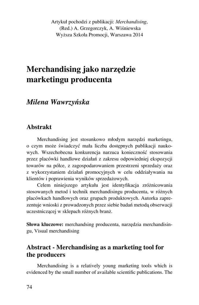 Artykuł pochodzi z publikacji: Merchandising, (Red.) A. Grzegorczyk, A. Wiśniewska Wyższa Szkoła Promocji, Warszawa 2014 Merchandising jako narzędzie marketingu producenta Milena Wawrzyńska Abstrakt Merchandising jest stosunkowo młodym narzędzi marketingu, o czym może świadczyć mała liczba dostępnych publikacji naukowych. Wszechobecna konkurencja narzuca konieczność stosowania przez placówki handlowe działań z zakresu odpowiedniej ekspozycji towarów na półce, z zagospodarowaniem przestrzeni sprzedaży oraz z wykorzystaniem działań promocyjnych w celu oddziaływania na klientów i poprawienia wyników sprzedażowych. Celem niniejszego artykułu jest identyfikacja zróżnicowania stosowanych metod i technik merchandisingu producenta, w różnych placówkach handlowych oraz grupach produktowych. Autorka zaprezentuje wnioski z prowadzonych przez siebie badań metodą obserwacji uczestniczącej w sklepach różnych branż. Słowa kluczowe: merchandsing producenta, narzędzia merchandisingu, Visual merchandising Abstract - Merchandising as a marketing tool for the producers Merchandising is a relatively young marketing tools which is evidenced by the small number of available scientific publications. The 74 omnipresent competition necessitates the use by retailers of activities in the field of adequate exposure of the goods on the shelf, with the development of the sales and use promotional activities to impact on customers and improve sales results. The purpose of this article is to identify the diversity of methods and techniques of producers’ merchandising, in a variety of retail outlets and product groups. The author will present the findings of their own research using participant observation in stores in various industries. Keywords: merchandsing producer, tools, merchandising, visual merchandising 1. Wstęp – istota merchandsingu producenta Merchandising producenta jest metodą aktywizacji sprzedaży realizowaną przy udziale przedstawicieli handlowych nazywanych merchandiserami. Zadaniem merchandisera jest uczynić produkty bardziej widocznymi, dostępnymi dla konsumentów ze względu na atrakcyjny sposób ekspozycji i dogodną lokalizację. Kolejna z proponowanych definicji merchandisingu producenta mówi, że jest zbiór działań reklamowych prowadzonych w obszarze punktu sprzedażowego, swoim zasięgiem obejmujących efektywną ekspozycję, umiejscowienie oferowanych towarów w sklepie oraz reklamę sklepową. Główny zakres działań merchandisingu producenta obejmuje sprawowanie opieki nad właściwym sposobem eksponowania oferowanych przez producenta produktów w punktach sprzedażowych. Dbałość o regularność dostaw towarów do punktów sklepowych i stałe kontrolowanie zaopatrzenia półki sklepowej. Udostępnienie przez producenta bezpłatnych materiałów reklamowych. Ważnym jest również podnoszenie poziomu lojalności wśród konsumentów.1 Różnorodne formy promocji umiejscowione w punkcie sprzedażowym mają za zadanie przede wszystkim skutecznie komunikować odbiorcę z danym punktem sprzedażowym, jak również budować wśród klientów lojalność wobec danej marki. Sampling oraz degustacje są skutecznym narzędziem promocji, które służy zwłaszcza w aktywizowaniu sprzedaży produktów FMCG. L. Witek, Merchandising w małych i dużych firmach handlowych, S. H. Beck, Warszawa 2007, s. 4. 1 75 Najistotniejszą cechą, wspomnianych form promocji jest przyciągnięcie uwagi potencjalnych nabywców, co przyczynia się do wytworzenia w nich impulsu zakupowego, jak również rozpowszechnianiu nowych produktów i ich aktywizacji sprzedaży. Materiały POS są fizycznymi nośnikami przekazu reklamowego z reguły umieszczanymi w punkcie sprzedażowym. Podstawową funkcją jest zwiększenie sprzedaży prezentowanego produktu oraz przybliżenie nabywcom nawiązanie relacji z daną marką. Ambient media, wspiera swoimi działaniami podstawową kampanię reklamą, przez jest co powoduje szybsze jej zauważenie i zapamiętanie przez odbiorców.2 2. Metodka badania Badanie zostało przeprowadzone w ramach projektu „Merchandising, jako narzędzie marketingu”.3 Badaniem metodą obserwacji objęte zostały wybrane detaliczne punkty sprzedaży. Ankieterzy dokonywali obserwacji i ocen, zaznaczając je odpowiednio w kwestionariuszu. Każda z wizyt studyjnych trwała kilka godzin, w zależności od powierzchni sklepu i zakresu oferowanego w nim asortymentu. Wyniki badania zostały zebrane w postaci arkusza i poddane analizie. Badanie miało charakter konfirmacyjny. Uzyskane wyniki nie były analizowane ilościowo. Celem badaczy była jakościowa ocena zgodności lub jej braku, z teorią, by ustalić które z popularyzowanych w literaturze technik mają swoje odzwierciedlenie w praktyce i czy wszystkie techniki stosowane w praktyce są opisane w teorii. 3. Wnioski z badań Wspomniane wcześnie j w niniejszym artykule formy promocji występują we wszystkich rodzajach placówek handlowych: wielko=, średnio- oraz małopowierzchniowych. Zasadność stosowania tej formy promocji jest rezultatem niskich kosztów różnorodnych postaci, jak również długością czasu przez, który mogą być wykorzystywane. L. Witek, Merchandising w małych i dużych firmach handlowych, S. H. Beck, Warszawa 2007, s. 114. 3 „Merchandising, jako narzędzie marketingu”, projekt badawczy przeprowadzony przez zespół badawczy Wyższej Szkoły Promocji w Warszawie pod kierownictwem prof. nadzw. WSP dr. hab. Adama Grzegorczyka 2 76 Niezależnie od lokalizacji, branży czy produktów oferowanych przed daną jednostkę handlową, zastosowanie materiałów POS, nieodzownie będzie narzędziem aktywizującym sprzedaż. Gazetka reklamowa będąca formą promocji prezentuje aktualną ofertę punktu sprzedażowego. Występowanie tej formy promocji podczas przeprowadzania badań, zauważano w wielkopowierzchniowych placówkach handlowych. Gazetka reklamowa pełni rolę „pomoc