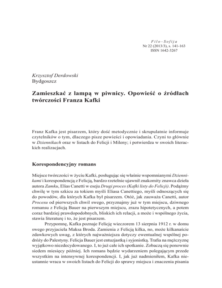 Filo–Sofija Nr 22 (2013/3), s. 141-163 ISSN 1642-3267 Krzysztof Derdowski Bydgoszcz Zamieszkać z lampą w piwnicy. Opowieść o źródłach twórczości Franza Kafki Franz Kafka jest pisarzem, który dość metodycznie i skrupulatnie informuje czytelników o tym, dlaczego pisze powieści i opowiadania. Czyni to głównie w Dziennikach oraz w listach do Felicji i Mileny; i potwierdza w swoich literackich realizacjach. Korespondencyjny romans Miejsce twórczości w życiu Kafki, posługując się właśnie wspomnianymi Dziennikami i korespondencją z Felicją, bardzo rzetelnie ujawnił znakomity znawca dzieła autora Zamku, Elias Canetti w eseju Drugi proces (Kafki listy do Felicji). Podążmy chwilę w tym szkicu za tokiem myśli Eliasa Canettiego, myśli odnoszących się do powodów, dla których Kafka był pisarzem. Otóż, jak zauważa Canetti, autor Procesu od pierwszych chwil swego, przyznajmy już w tym miejscu, dziwnego romansu z Felicją Bauer na pierwszym miejscu, zrazu hipotetycznych, a potem coraz bardziej prawdopodobnych, bliskich ich relacji, a może i wspólnego życia, stawia literaturę i to, że jest pisarzem. Przypomnę, Kafka poznaje Felicję wieczorem 13 sierpnia 1912 r. w domu swego przyjaciela Maksa Broda. Zamienia z Felicją kilka, no, może kilkanaście zdawkowych uwag, z których najważniejsza dotyczy ewentualnej wspólnej podróży do Palestyny. Felicja Bauer jest entuzjastką i syjonistką. Trafia na mężczyznę wyjątkowo niezdecydowanego. I, to już całe ich spotkanie. Zobaczą się ponownie siedem miesięcy później. Ich romans będzie wydarzeniem polegającym przede wszystkim na intensywnej korespondencji. I, jak już nadmieniłem, Kafka nieustannie wraca w swoich listach do Felicji do sprawy miejsca i znaczenia pisania 142 KRZYSZTOF DERDOWSKI w jego życiu; a już w październiku zaczyna sugerować Felicji, że jego pisarstwo może i zapewne jest przeszkodą w ich relacjach; przeszkodą na tyle poważną, że uniemożliwiającą rozwinięcie się owych relacji w prawdziwy romans, czy też późniejsze małżeństwo. Niezwykle dramatyczne wyznania czyni w tej sprawie Kafka w liście z dnia 1 listopada 1912 r. Pisze do Felicji tak: Moje życie składa się, i właściwie składało się zawsze z prób pisania, i to z prób najczęściej nieudanych. G d y b y m j e d n a k n i e p i s a ł , t o l e ż a ł b y m j u ż n a z i e m i , w a r t t y l k o , b y z o s t a ć w y m i e c i o n y m [wyróżnienie – K. D.] […] Mój tryb życia jest nastawiony tylko na pisanie, a gdy ulega pewnym zmianom, to tylko w tym celu, żeby w miarę możliwości lepiej służył pisarstwu, bo czas jest krótki, siły są niewielkie, biuro jest zmorą, mieszkanie jest głośne i trzeba próbować przebić się za pomocą jakiejś sztuki, jeśli się komuś ładne, proste życie nie udaje.1 W takim życiu nie ma raczej miejsca dla kobiety i przyszłej żony. Kafka romansuje korespondencyjnie z Felicją i oznajmia jej, że całym jego życiem jest pisanie! Jak więc widzi ich romans i ewentualne rokowania dotyczące przyszłego życia? Otóż Kafka wprowadza i wdraża w tej sprawie rozumowanie niebywałe i w sposób oczywisty nie do zaakceptowania przez (chyba) jakąkolwiek kobietę, a w każdym bądź razie przez kobietę mającą wobec wybranka plany matrymonialne. Kafka czyni z romansu z Felicją… dzieło literackie. To ich korespondencja ma być właściwym romansem. I przez kilkanaście miesięcy ta korespondencja jest romansem. Autor Przemiany zrazu jest w swych listach oględny i zdystansowany; jednak już w połowie listopada zwraca się do Felicji: „Najdroższa Pani”. I wyznaje Felicji w liście z 14 listopada: „Najdroższa, Najdroższa. To słowo najchętniej bym wypisywał raz za razem…”2. Nie znamy listów Felicji, ale jej odpowiedzi muszą być na tyle zachęcające, że Kafka kilka dni później, w liście z 17 listopada nazywać będzie Felicję – „Najukochańszą”. Jednocześnie jednak Kafka unika bezpośredniego spotkania z Felicją. W kolejnych listach, na przełomie 1912 i 1913 r., uzupełnia ten romans o niezliczone szczegóły – chce dokładnie wiedzieć, jak żyje Felicja, co w danej chwili robi, jakich ma przyjaciół. Jednocześnie nieustannie przestrzega Felicję przed tym, że jest pisarzem i tylko jako pisarz może się spełniać. Autor Procesu czuje się oczywiście, od czasu do czasu, winny tego, że jego romans z Felicją jest tak dziwny i gani siebie w listach… „Ukochana, Najukochańsza, ja, całkiem i doszczętnie potępiony, mogę się więc poszczycić, żem z Ciebie zdrowej uczynił chorą”3. Boi się jednak panicznie utraty Felicji. Jest przekonany, że chce, ale nie może być z nią razem, bowiem jest pisarzem. Mnoży trudności i dowody na to, że pisarz nie może żyć w stałym związku z kobietą. 1 F. Kafka, Listy do Felicji, przeł. I. Krońska, Państwowy Instytut Wydawniczy, Warszawa 1976, t. I, s. 35-37. 2 Ibidem, s. 63. 3 Ibidem, s. 75. ZAMIESZKAĆ Z LAMPĄ W PIWNICY. OPOWIEŚĆ O ŹRÓDŁACH TWÓRCZOŚCI FRANZA KAFKI 143 Nie zachował się list Felicji Bauer4, którego treści domyślamy się z odpowiedzi Kafki w liście z dnia 14 stycznia 1913 r.: Napisałaś kiedyś, że chciałabyś siedzieć przy mnie w czasie, gdy piszę; tylko się zastanów, wtedy nie mógłbym pisać […] człowiek nie może być dostatecznie sam, gdy pisze, dlatego nie może być dostatecznie cicho wokół niego, gdy pisze, noc jest jeszcze za mało nocą […] Często myślałem już o tym, że dla mnie najlepszym sposobem życia byłoby z przyborami do pisania i z lampą zamieszkać w najdalszym pomieszczeniu rozległej, zamkniętej piwnicy. Jedzenie by mi przynoszono, stawiano by je zawsze daleko ode mnie, przed najbardziej zewnętrznymi drzwiami do piwnicy. Droga po jedzenie, w szlafroku, przez wszystkie korytarze piwniczne, byłaby moim jedynym spacerem […]. Co ja bym wtedy napisał! Z jakich głębin bym to 