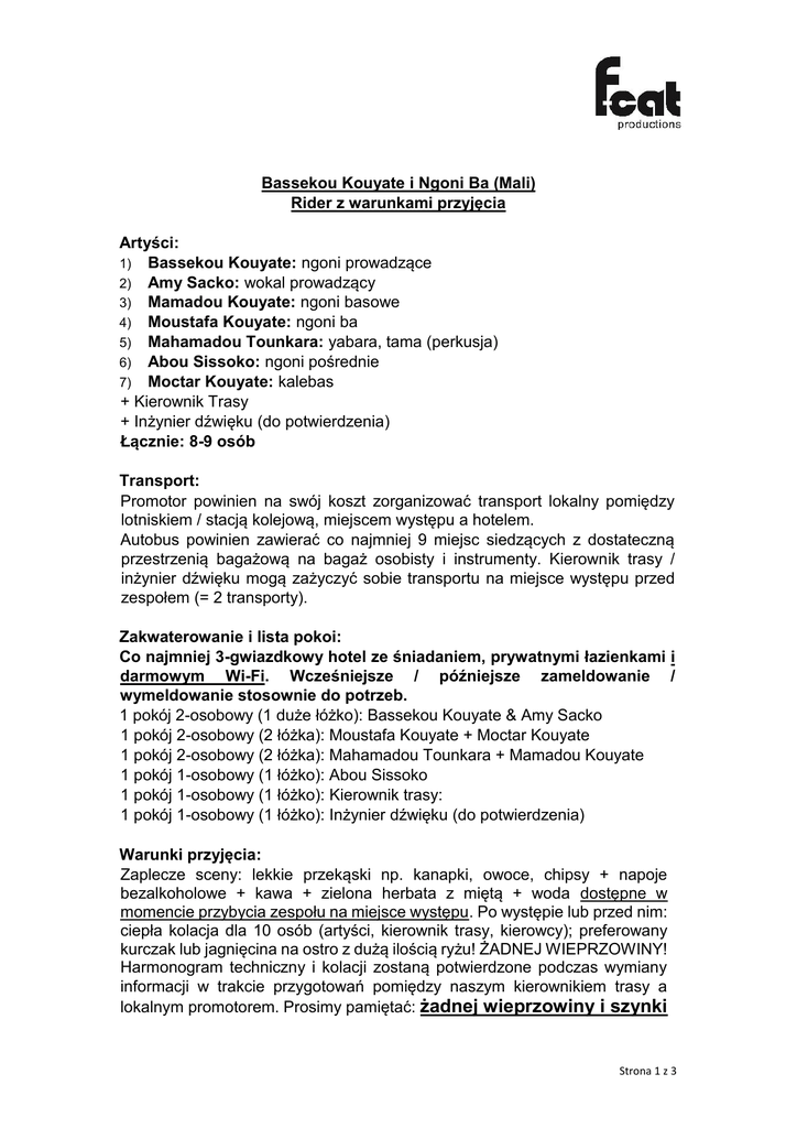 Bassekou Kouyate i Ngoni Ba (Mali) Rider z warunkami przyjęcia Artyści: 1) Bassekou Kouyate: ngoni prowadzące 2) Amy Sacko: wokal prowadzący 3) Mamadou Kouyate: ngoni basowe 4) Moustafa Kouyate: ngoni ba 5) Mahamadou Tounkara: yabara, tama (perkusja) 6) Abou Sissoko: ngoni pośrednie 7) Moctar Kouyate: kalebas + Kierownik Trasy + Inżynier dźwięku (do potwierdzenia) Łącznie: 8-9 osób Transport: Promotor powinien na swój koszt zorganizować transport lokalny pomiędzy lotniskiem / stacją kolejową, miejscem występu a hotelem. Autobus powinien zawierać co najmniej 9 miejsc siedzących z dostateczną przestrzenią bagażową na bagaż osobisty i instrumenty. Kierownik trasy / inżynier dźwięku mogą zażyczyć sobie transportu na miejsce występu przed zespołem (= 2 transporty). Zakwaterowanie i lista pokoi: Co najmniej 3-gwiazdkowy hotel ze śniadaniem, prywatnymi łazienkami i darmowym Wi-Fi. Wcześniejsze / późniejsze zameldowanie / wymeldowanie stosownie do potrzeb. 1 pokój 2-osobowy (1 duże łóżko): Bassekou Kouyate & Amy Sacko 1 pokój 2-osobowy (2 łóżka): Moustafa Kouyate + Moctar Kouyate 1 pokój 2-osobowy (2 łóżka): Mahamadou Tounkara + Mamadou Kouyate 1 pokój 1-osobowy (1 łóżko): Abou Sissoko 1 pokój 1-osobowy (1 łóżko): Kierownik trasy: 1 pokój 1-osobowy (1 łóżko): Inżynier dźwięku (do potwierdzenia) Warunki przyjęcia: Zaplecze sceny: lekkie przekąski np. kanapki, owoce, chipsy + napoje bezalkoholowe + kawa + zielona herbata z miętą + woda dostępne w momencie przybycia zespołu na miejsce występu. Po występie lub przed nim: ciepła kolacja dla 10 osób (artyści, kierownik trasy, kierowcy); preferowany kurczak lub jagnięcina na ostro z dużą ilością ryżu! ŻADNEJ WIEPRZOWINY! Harmonogram techniczny i kolacji zostaną potwierdzone podczas wymiany informacji w trakcie przygotowań pomiędzy naszym kierownikiem trasy a lokalnym promotorem. Prosimy pamiętać: żadnej wieprzowiny i szynki Strona 1 z 3 RIDER_BKNb_2015_booking Bassekou Kouyate i Ngoni Ba (Mali) Rider techniczny Rider techniczny - bliższe informacje patrz poniższe uwagi uzupełniające do załączonego planu sceny i listy dodatków: • System PA + Mikser + Inżynier dźwięku mówiący po angielsku lub francusku! • Zespół składa się z 4 osób grających na ngoni (ngoni wyposażone w przystawki i systemy bezprzewodowe (4 x Line 6 gt 50)) + 2 perkusiści + 1 wokalista • 2 wzmacniacze gitarowe + 1 wzmacniacz basowy (zapewnia promotor lokalny) • Prosimy o zapewnienie wzmacniacza gitarowego, ponieważ Ngoni 3 posiada pogłos - Roland JC-120, Fender Twin Reverb lub równoważy. Zgodnie z riderem technicznym. Nie Marshall! • Idealne rozwiązanie to 10 monitorów na 7 miksów. Co najmniej 7 monitorów / 7 kanałów mix – Jeden na członka zespołu! (patrz układ sceny). • Odpowiednie oświetlenie (wszyscy artyści powinni być dobrze oświetleni) • 2 podesty, 8’x 8’x 12”, zgodnie z układem sceny, wymóg nie jest konieczny, jeśli ilość miejsca na scenie nie jest wystarczająca. • Rozmiar sceny: idealnie: 40’x20’, co najmniej: 24’x16’; w razie potrzeby możemy dopasować się do mniejszych rozmiarów - wymaga to jednak uprzedniego omówienia z dyrektorem technicznym. • Dla każdego muzyka ręczniki i woda w butelkach na scenie. • Wykorzystujemy urządzenia wyposażone w zasilacz samonastawny 100-250V, jednak potrzebne będą przejściówki wtyczek z systemu europejskiego i/lub USA na lokalny w wystarczającej liczbie - zazwyczaj 4 systemy bezprzewodowe + kilka zasilaczy do efektów gitarowych. RIDER_BKNb_2015_booking Strona 2 z 3 RIDER_BKNb_2015_booking Strona 3 z 3