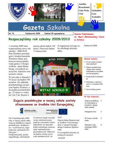 Antolka Brzuchania Cisia Wola Giebułtów Cisie Łazy Tochołów Gazeta Szkolna Nr 72 Październik 2009 Nakład 50 egzemplarzy Rozpoczęliśmy rok szkolny 2009/2010 1 września 2009 roku rozpoczęliśmy nowy rok szkolny - 2009/2010. Pani Dyrektor powitała gości: księdza kanonika Wiesława Harta, proboszcza naszej parafii, wójta gminy w Książu wielkim - pana Marka Szopę, wszystkich nauczycieli, rodziców oraz uczniów szkoły. W tym roku w klasach IVI uczyć się będzie 100 uczniów. Do oddziału przedszkolnego uczęszczać będzie 20 dzieci, a do punktu przedszkolnego –25 dzieci w wieku od 3 do 5 lat. Razem w naszej szkole będzie 145 dzieci. Pracować będzie 15 nauczycieli. Szkoła Podstawowa im. Marii Skłodowskiej—Curie w Antolce O organizacji nowego roku szkolnego piszemy dalej. Ważne tematy: J Co nas czeka w nowym roku szkolnym? J Zajęcia pozalekcyjne „Dajmy sobie szansę” finansowane ze środków Unii Europejskiej” J Działa Punkt Przedszkolny J Pamiętamy o wydarzeniach z 1 września 1939 roku WITAJ SZKOŁO !!! J Jak witaliśmy jesień. W tym numerze: Zajęcia pozalekcyjne w naszej szkole zostały sfinansowane ze środków Unii Europejskiej Od 19 października 2009 roku w naszej szkole odbywają się dodatkowe zajęcia pozalekcyjne: dydaktyczno—wyrównawcze, logopedyczne, gimnastyki korekcyjno— kompensacyjnej, języka angielskiego, informatyki. Październik 2009 Uczniowie mogli rozwijać swoje zainteresowania podczas warsztatów dziennikarskich, na zajęciach kółka teatralnego, podczas zajęć matematyczno— przyrodniczych. Odbywać się będzie szereg wycieczek autokarowych i in- nych. Zajęcia będą sfinansowane ze środków Unii Europejskiej w ramach Europejskiego Funduszu Społecznego. O szczegółach piszemy na kolejnych stronach stronach Zajęcia pozalekcyj- 2 ne realizowane w projekcie „Dajmy sobie szansę” Pożegnanie lata 3 W trosce o środowisko 3 Kalendarz roku szkolnego 2009/2010 5 Projekt „Dajmy sobie szansę” będzie realizowany w ramach Programu Operacyjnego Kapitał Ludzki (POKL), według Priorytetu IX – „Rozwój wykształcenia i kompetencji w regionach”. Poddziałania: 9.1.2 - „Wyrównywanie szans edukacyjnych uczniów z grup o utrudnionym dostępie do edukacji oraz zmniejszenie różnic jakości usług edukacyjnych”. Projekt będzie polegał na realizowaniu atrakcyjnych zajęć pozalekcyjnych rozwijających zainteresowania i talenty uczniów. Zajęcia pozalekcyjne realizowane będą 3 szkołach gminy Książ Wielki w okresie od 1.10.2009 do 31.12.2011 roku. Koszt zajęć wyniesie 1.091.515 zł i będzie sfinansowany ze środków Unii Europejskiej w ramach Europejskiego Funduszu Społecznego. Zajęcia pozalekcyjne realizowane w projekcie „Dajmy sobie szansę” Zajęcia w świetlicy: Dodatkowe zajęcia dydaktycznowyrównawcze i specjalistyczne: - Zajęcia socjoterapeutyczne - Zajęcia plastyczne - Zajęcia sportowo – rekreacyjne - Zajęcia edukacyjne - pomoc w od- Zaj. dydaktyczno-wyrównawcze rabianiu lekcji w kształceniu zintegrowanym - Zaj. dydaktyczno-wyrównawcze - Zajęcia komputerowe z języka polskiego w klasach IVUczniowie uczęszczający na świeVI tlicę będą otrzymy- Zaj. dydaktyczno-wyrównawcze wać gorący posiłek, a z matematyki w klasach IV-VI po zajęciach zo- Zajęcia z gimnastyki korekcyjno staną odwiezieni –kompensacyjnej do domów. - Zajęcia logopedyczne Dodatkowe zajęcia pozalekcyjne ukierunkowane na rozwój kompetencji matematyczno - przyrodniczych i naukowo – technicznych - Weekendowe wycieczki przyrodnicze - Weekendowe autokarowe wycieczki przyrodnicze - Spotkania z nauką i techniką (lekcje muzealne) - Warsztaty w szkolnych laboratoriach - matematycznoprzyrodnicze Dodatkowe zajęcia pozalekcyjne ukierunkowane na rozwój kompetencji językowych i informatycznych ze szczególnym uwzględnieniem ICT - Zajęcia z języka angielskiego w klasach I-III i IV-VI - Zajęcia informatyczne w klasach I-VI - Warsztaty dziennikarskie - Zajęcia kółka teatralnego - Warsztaty teatralne prowadzone w teatrach krakowskich (lekcja + spektakl teatralny) Str. 2 Gazeta Szkolna Tragiczne wydarzenia września 1939 roku Dnia 17 września 2009 roku odbyła się akademia z okazji 70-tej rocznicy wybuchu II wojny światowej oraz agresji Armii Czerwonej na nasz kraj. Uczestnicy apelu recytowali patriotyczne wiersze, śpiewali pieśni oraz przybliżali uczniom naszej szkoły historię tej wojny, która pochłonęła aż 50 milionów ofiar. Młodzi artyści mówili o ataku na Polskę z trzech stron, bohaterskich żołnierzach broniących Westerplatte, uczniach, którzy nie poszli tego dnia do szkoły, zagrożeni atakami hitlerowskich Niemców… Wspomnieli też o roli dzieci w walce w obronie ojczyzny. Wierzymy, że sytuacja taka nigdy już się nie powtórzy. Jakub Kuś, klasa VI W trosce o środowisko We wrześniu 2009 roku uczniowie naszej szkoły tradycyjnie włączyli się w akcję Sprzątania Świata. Udział w tych zajęciach brali uczniowie klas I - VI. Nad naszym bezpieczeństwem czuwały wychowawczynie. Część uczniów grabiło liście, zeschłe źdźbła, trawy, zamiatało alejki. Dzieci zbierały także różne odpady i gałązki, pieliły skalne ogródki i małą rabatkę kwiatową przed budynkiem biblioteki. Następnie zbieraliśmy śmieci, przechodząc przez las, położony w pobliżu szkoły. Na pewno te działania pomogą środowisku w naszej okolicy. Każdemu podobała się ta pomoc, służąca zarówno przyrodzie, jak i człowiekowi. Kamil Wolka, klasa IV Pożegnanie lata- powitanie jesieni przez Samorząd Uczniowski przy Szkole Podstawowej w Antolce. W pierwszym dniu jesieni uczniowie pożegnali wakacyjną porę roku, jaką jest lato, a powitali złotą polską jesień. Podczas zajęć pozalekcyjnych miało miejsce wiele ciekawych atrakcji. Uczniowie pod opieką pań - Elżbiety Szopy i Bożeny Brody udali się do pobliskiego lasu na grzybobranie. Pomimo, że w ostatnim czasie dokucza
