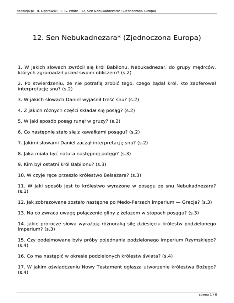 nadzieja.pl - R. Dąbrowski, E. G. White - 12. Sen Nebukadnezara* (Zjednoczona Europa) 12. Sen Nebukadnezara* (Zjednoczona Europa) 1. W jakich słowach zwrócił się król Babilonu, Nebukadnezar, do grupy mędrców, których zgromadził przed swoim obliczem? (s.2) 2. Po stwierdzeniu, że nie potrafią zrobić tego, czego żądał król, kto zaoferował interpretację snu? (s.2) 3. W jakich słowach Daniel wyjaśnił treść snu? (s.2) 4. Z jakich różnych części składał się posąg? (s.2) 5. W jaki sposób posąg runął w gruzy? (s.2) 6. Co następnie stało się z kawałkami posągu? (s.2) 7. Jakimi słowami Daniel zaczął interpretację snu? (s.2) 8. Jaka miała być natura następnej potęgi? (s.3) 9. Kim był ostatni król Babilonu? (s.3) 10. W czyje ręce przeszło królestwo Belsazara? (s.3) 11. W jaki sposób jest to królestwo wyrażone w posągu ze snu Nebukadnezara? (s.3) 12. Jak zobrazowane zostało następne po Medo-Persach imperium — Grecja? (s.3) 13. Na co zwraca uwagę połączenie gliny z żelazem w stopach posągu? (s.3) 14. Jakie prorocze słowa wyrażają różnoraką siłę dziesięciu królestw podzielonego imperium? (s.3) 15. Czy podejmowane były próby pojednania podzielonego Imperium Rzymskiego? (s.4) 16. Co ma nastąpić w okresie podzielonych królestw świata? (s.4) 17. W jakim oświadczeniu Nowy Testament ogłasza utworzenie królestwa Bożego? (s.4) strona 1 / 6 nadzieja.pl - R. Dąbrowski, E. G. White - 12. Sen Nebukadnezara* (Zjednoczona Europa) Podsumowanie (s.5-6) * - w innych tłumaczeniach władca ten nazywany jest także Nabuchodonozorem. 1. W jakich słowach zwrócił się król Babilonu, Nebukadnezar, do grupy mędrców, których zgromadził przed swoim obliczem? „Wtedy król rzedł do nich: Miałem sen i mój duch jest zaniepokojony, bo chcę zrozumieć ten sen” — Dn 2,3 2. Po stwierdzeniu, że nie potrafią zrobić tego, czego żądał król, kto zaoferował interpretację snu? „Na to Daniel poszedł i prosił króla, aby mu dał czas na wyłożenie królowi snu” — w. 16 3. W jakich słowach Daniel wyjaśnił treść snu? „A twój sen i twoje widzenie, które ci przeszły przez głowę są takie: Tobie, o królu, przyszły na twoim myśli o tym, co kiedyś się stanie, a ten, który objawia tajemnice, powiedział ci, co się stanie. Nie dzięki mądrości, którą miałbym w większym stopniu niż wszyscy żyjący, jest mi objawiona ta tajemnica, lecz abym wyłożył królowi sen i abyś ty zrozumiał myśli swojego serca. Ty królu miałeś widzenie: Oto olbrzymi posąg stał prze tobą; wielki był ów posąg, potężny jego blask, a straszny jego wygląd” — w. 28-31 4. Z jakich różnych części składał się posąg? „Głowa tego posągu była ze szczerego złota, jego pierś i jego ramiona ze srebra, jego brzuch i jego biodra z miedzi, jego golenie z żelaza, jego nogi po części z żelaza, po części z gliny” — w. 32.33 5. W jaki sposób posąg runął w gruzy? „Patrzyłeś, a wtem bez udziału rąk oderwał się od góry kamień, uderzył ten posąg w nogi z żelaza i gliny, i skruszył je” — w. 34 6. Co następnie stało się z kawałkami posągu? „Wtedy rozsypało się w kawałki żelazo, glina, miedź, srebro i złoto, i było to wszystko jak plewa na klepisku w lecie; i rozniósł to wiatr, tak że nie było po nich śladu. Kamień zaś, który uderzył w posąg, stał się wielką górą i wypełnił całą ziemię” — w. 35 7. Jakimi słowami Daniel zaczął interpretację snu? strona 2 / 6 nadzieja.pl - R. Dąbrowski, E. G. White - 12. Sen Nebukadnezara* (Zjednoczona Europa) „Ty, o królu, jesteś królem królów, któremu Bóg niebios dał królestwo, moc i siłę, i chwałę. W którego ręce na całej zamieszkanej ziemi dał ludzi, polne zwierzęta i ptactwo niebieskie, którego uczynił władcą tego wszystkiego... ty jesteś głową ze złota” — w. 38,39 Uwaga: Charakter Imperium neo-babilońskiego jest trafnie zasugerowany w naturze materiału z którego zrobiona była część posągu, która go symbolizowała — głowa ze złota. Był to „złoty wiek złotego królestwa”. Babilon — metropolia Imperium — osiągnął szczyt niedoścignionej znakomitości. 8. Jaka miała być natura następnej potęgi? „Ale po tobie powstanie inne królestwo, słabsze niż twoje” — w. 39a 9. Kim był ostatni król Babilonu? „Tej samej nocy został zabity Belsazar, król chaldejski”. „A Dariusz Medyjczyk objął królestwo, mając sześćdziesiąt dwa lata” — Dn 5,3; 6.1 10. W czyje ręce przeszło królestwo Belsazara? „Twoje królestwo będzie podzielone i oddane Medom i Persom” — Dn 5,28 11. W jaki sposób jest to królestwo wyrażone w posągu ze snu Nebukadnezara? „Pierś i ramiona ze srebra” — Dn 2,32 12. Jak zobrazowane zostało następne po Medo-Persach imperium — Grecja? „Brzuch i jego biodra z miedzi”. „A potem trzecie królestwo z miedzi, które opanuje całą ziemię” — w. 40 Uwaga: Znane jest, że wielką potęgą, która pochłonęła resztki imperium Aleksandra Wielkiego był Rzym. 13. Na co zwraca uwagę połączenie gliny z żelazem w stopach posągu? „A że widziałeś nogi i palce po części z gliny, a po części z żelaza, znaczy, że królestwo będzie rozdzielone, lecz będzie miało coś z trwałości żelaza, jak widziałeś żelazo zmieszane z ziemią gliniastą” — w. 41 Uwaga: Barbarzyńskie plemiona, jakie nękały Imperium Rzymskie utworzyły fundamenty królestw, które przekształciły się w narody nowożytnej Europy. 14. Jakie prorocze słowa wyrażają różnoraką siłę dziesięciu królestw podzielonego imperium? strona 3 / 6 nadzieja.pl - R. Dąbrowski, E. G. White - 12. Sen Nebukadnezara* (Zjednoczona Europa) „A to, że palce u nóg były po części z żelaza, a po części z gliny znaczy, że królestwo będzie po części mocne, a po części kruche” — w. 42 15. Czy podejmowane były próby