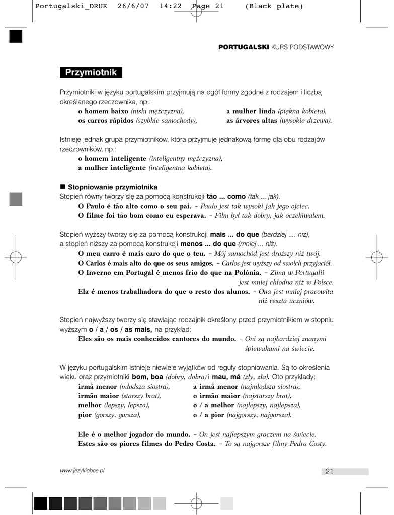 Portugalski_DRUK 26/6/07 14:22 Page 21 (Black plate) PORTUGALSKI KURS PODSTAWOWY Przymiotnik Przymiotniki w j´zyku portugalskim przyjmujà na ogó∏ formy zgodne z rodzajem i liczbà okreÊlanego rzeczownika, np.: o homem baixo (niski m´˝czyzna), os carros rápidos (szybkie samochody), a mulher linda (pi´kna kobieta), as árvores altas (wysokie drzewa). Istnieje jednak grupa przymiotników, która przyjmuje jednakowà form´ dla obu rodzajów rzeczowników, np.: o homem inteligente (inteligentny m´˝czyzna), a mulher inteligente (inteligentna kobieta). Stopniowanie przymiotnika Stopieƒ równy tworzy si´ za pomocà konstrukcji tão ... como (tak ... jak). O Paulo é tão alto como o seu pai. – Paulo jest tak wysoki jak jego ojciec. O filme foi tão bom como eu esperava. – Film by∏ tak dobry, jak oczekiwa∏em. Stopieƒ wy˝szy tworzy si´ za pomocà konstrukcji mais ... do que (bardziej .... ni˝), a stopieƒ ni˝szy za pomocà konstrukcji menos ... do que (mniej ... ni˝). O meu carro é mais caro do que o teu. – Mój samochód jest dro˝szy ni˝ twój. O Carlos é mais alto do que os seus amigos. – Carlos jest wy˝szy od swoich przyjació∏. O Inverno em Portugal é menos frio do que na Polónia. – Zima w Portugalii jest mniej ch∏odna ni˝ w Polsce. Ela é menos trabalhadora do que o resto dos alunos. – Ona jest mniej pracowita ni˝ reszta uczniów. Stopieƒ najwy˝szy tworzy si´ stawiajàc rodzajnik okreÊlony przed przymiotnikiem w stopniu wy˝szym o / a / os / as mais, na przyk∏ad: Eles são os mais conhecidos cantores do mundo. – Oni sà najbardziej znanymi Êpiewakami na Êwiecie. W j´zyku portugalskim istnieje niewiele wyjàtków od regu∏y stopniowania. Sà to okreÊlenia wieku oraz przymiotniki bom, boa (dobry, dobra) i mau, má (z∏y, z∏a). Oto przyk∏ady: irmã menor (m∏odsza siostra), irmão maior (starszy brat), melhor (lepszy, lepsza), pior (gorszy, gorsza), a o o o irmã menor (najm∏odsza siostra), irmão maior (najstarszy brat), / a melhor (najlepszy, najlepsza), / a pior (najgorszy, najgorsza). Ele é o melhor jogador do mundo. – On jest najlepszym graczem na Êwiecie. Estes são os piores filmes do Pedro Costa. – To sà najgorsze filmy Pedra Costy. www.jezykiobce.pl 21 Portugalski_DRUK 26/6/07 14:22 Page 22 (Black plate) Audio Kurs Przys∏ówek W j´zyku portugalskim przys∏ówki tworzymy poprzez dodanie koƒcówki -mente do ˝eƒskiej formy przymiotnika. JeÊli przymiotnik ma wspólnà form´ dla obu rodzajów, koƒcówk´ -mente dodaje si´ do tej formy, np.: lógico (logiczny) – logicamente (logicznie), fácil (∏atwy) – facilmente (∏atwo). Istniejà dwa przys∏ówki, które nie sà tworzone za pomocà koƒcówki -mente: bom, boa (dobry, dobra) – bem (dobrze), mau, má (z∏y, z∏a) – mal (êle). Istnieje te˝ grupa przys∏ówków, które majà takà samà form´ jak przymiotniki, np.: baixo (niski, nisko), caro (drogi, drogo). Oto przys∏ówki u˝yte w zdaniach: Eles passaram a fronteira facilmente. – Oni ∏atwo przekroczyli granic´. O Ricardo habituou-se ∫ vida em Varsóvia muito bem. – Ricardo bardzo dobrze przystosowa∏ si´ do ˝ycia w Warszawie. Liczebniki porzàdkowe Liczebniki porzàdkowe funkcjonujà jak przymiotniki, tj. uzgadniajà si´ w liczbie i rodzaju z rzeczownikiem. O Rui é o terceiro filho da Dária. – Rui jest trzecim synem Darii. Vira na seguda calle ∫ direita. – Skr´ç w drugà ulic´ w prawo. Conhe˜o os seus primeiros livros. – Znam jego pierwsze ksià˝ki. No mes passado vi os primeiros filmes de João Botelho. – W zesz∏ym miesiàcu obejrza∏em pierwsze filmy João Botelho. Oto pierwsze dziesi´ç liczebników porzàdkowych: 1 – primeiro (a) 6 – sexto (a) 2 – segundo (a) 7 – sétimo (a) 3 – terceiro (a) 8 – oitavo (a) 4 – quarto (a) 9 – nono (a) 5 – quinto (a) 10 – décimo (a) 22