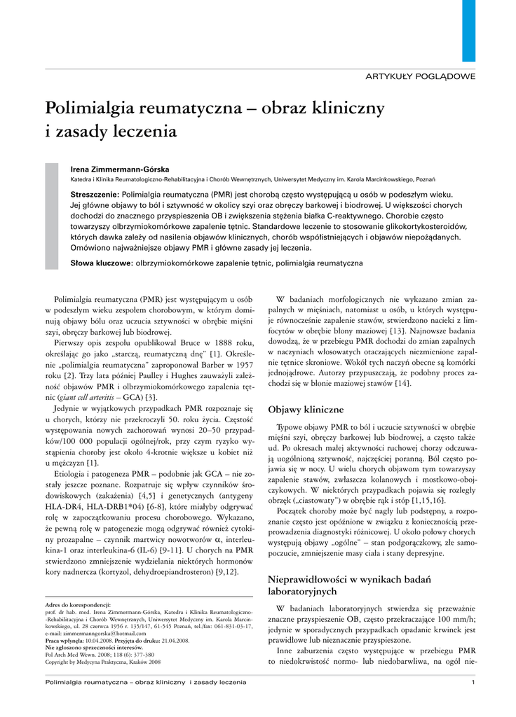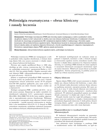 ARTYKUŁY POGLĄDOWE Polimialgia reumatyczna – obraz kliniczny i zasady leczenia Irena Zimmermann-Górska Katedra i Klinika Reumatologiczno-Rehabilitacyjna i Chorób Wewnętrznych, Uniwersytet Medyczny im. Karola Marcinkowskiego, Poznań Streszczenie: Polimialgia reumatyczna (PMR) jest chorobą często występującą u osób w podeszłym wieku. Jej główne objawy to ból i sztywność w okolicy szyi oraz obręczy barkowej i biodrowej. U większości chorych dochodzi do znacznego przyspieszenia OB i zwiększenia stężenia białka C-reaktywnego. Chorobie często towarzyszy olbrzymiokomórkowe zapalenie tętnic. Standardowe leczenie to stosowanie glikokortykosteroidów, których dawka zależy od nasilenia objawów klinicznych, chorób współistniejących i objawów niepożądanych. Omówiono najważniejsze objawy PMR i główne zasady jej leczenia. Słowa kluczowe: olbrzymiokomórkowe zapalenie tętnic, polimialgia reumatyczna Polimialgia reumatyczna (PMR) jest występującym u osób w podeszłym wieku zespołem chorobowym, w którym dominują objawy bólu oraz uczucia sztywności w obrębie mięśni szyi, obręczy barkowej lub biodrowej. Pierwszy opis zespołu opublikował Bruce w 1888 roku, określając go jako „starczą, reumatyczną dnę” [1]. Określenie „polimialgia reumatyczna” zaproponował Barber w 1957 roku [2]. Trzy lata później Paulley i Hughes zauważyli zależność objawów PMR i olbrzymiokomórkowego zapalenia tętnic (giant cell arteritis – GCA) [3]. Jedynie w wyjątkowych przypadkach PMR rozpoznaje się u chorych, którzy nie przekroczyli 50. roku życia. Częstość występowania nowych zachorowań wynosi 20–50 przypadków/100 000 populacji ogólnej/rok, przy czym ryzyko wystąpienia choroby jest około 4-krotnie większe u kobiet niż u mężczyzn [1]. Etiologia i patogeneza PMR – podobnie jak GCA – nie zostały jeszcze poznane. Rozpatruje się wpływ czynników środowiskowych (zakażenia) [4,5] i genetycznych (antygeny HLA-DR4, HLA-DRB1*04) [6-8], które miałyby odgrywać rolę w zapoczątkowaniu procesu chorobowego. Wykazano, że pewną rolę w patogenezie mogą odgrywać również cytokiny prozapalne – czynnik martwicy nowotworów α, interleukina-1 oraz interleukina-6 (IL-6) [9-11]. U chorych na PMR stwierdzono zmniejszenie wydzielania niektórych hormonów kory nadnercza (kortyzol, dehydroepiandrosteron) [9,12]. Adres do korespondencji: prof. dr hab. med. Irena Zimmermann-Górska, Katedra i Klinika Reumatologiczno ‑Rehabilitacyjna i Chorób Wewnętrznych, Uniwersytet Medyczny im. Karola Marcinkowskiego, ul. 28 czerwca 1956 r. 135/147, 61-545 Poznań, tel./fax: 061-831-03-17, e-mail: [email protected] Praca wpłynęła: 10.04.2008. Przyjęta do druku: 21.04.2008. Nie zgłoszono sprzeczności interesów. Pol Arch Med Wewn. 2008; 118 (6): 377‑380 Copyright by Medycyna Praktyczna, Kraków 2008 Polimialgia reumatyczna – obraz kliniczny i zasady leczenia W badaniach morfologicznych nie wykazano zmian zapalnych w mięśniach, natomiast u osób, u których występuje równocześnie zapalenie stawów, stwierdzono nacieki z limfocytów w obrębie błony maziowej [13]. Najnowsze badania dowodzą, że w przebiegu PMR dochodzi do zmian zapalnych w naczyniach włosowatych otaczających niezmienione zapalnie tętnice skroniowe. Wokół tych naczyń obecne są komórki jednojądrowe. Autorzy przypuszczają, że podobny proces zachodzi się w błonie maziowej stawów [14]. Objawy kliniczne Typowe objawy PMR to ból i uczucie sztywności w obrębie mięśni szyi, obręczy barkowej lub biodrowej, a często także ud. Po okresach małej aktywności ruchowej chorzy odczuwają uogólnioną sztywność, najczęściej poranną. Ból często pojawia się w nocy. U wielu chorych objawom tym towarzyszy zapalenie stawów, zwłaszcza kolanowych i mostkowo-obojczykowych. W niektórych przypadkach pojawia się rozległy obrzęk („ciastowaty”) w obrębie rąk i stóp [1,15,16]. Początek choroby może być nagły lub podstępny, a rozpoznanie często jest opóźnione w związku z koniecznością przeprowadzenia diagnostyki różnicowej. U około połowy chorych występują objawy „ogólne” – stan podgorączkowy, złe samopoczucie, zmniejszenie masy ciała i stany depresyjne. Nieprawidłowości w wynikach badań laboratoryjnych W badaniach laboratoryjnych stwierdza się przeważnie znaczne przyspieszenie OB, często przekraczające 100 mm/h; jedynie w sporadycznych przypadkach opadanie krwinek jest prawidłowe lub nieznacznie przyspieszone. Inne zaburzenia często występujące w przebiegu PMR to niedokrwistość normo- lub niedobarwliwa, na ogół nie1 ARTYKUŁY POGLĄDOWE Tabela 1. K ryteria diagnostyczne polimialgii reumatycznej według Healeya [20] Tabela 2. Rozpoznanie różnicowe polimialgii reumatycznej – wiek >50 lat – reumatoidalne zapalenie stawów (szczególnie we wczesnym okresie!) choroby stawów –b ól w obrębie przynajmniej 2 z 3 obszarów: szyja, obręcz barkowa, obręcz biodrowa, utrzymujący się przynajmniej przez 1 miesiąc – sztywność poranna utrzymująca się przez >1 h – choroba zwyrodnieniowa stawów – choroby układowe tkanki łącznej – OB >40 mm/h – nawracające, seronegatywne, symetryczne zapalenie błony maziowej stawów z ciastowatym obrzękiem – wykluczenie innych chorób o podobnych objawach – s zybka poprawa po zastosowaniu prednizonu w dawce 20 mg/d lub mniejszej – „reumatyzm tkanek miękkich” (fibromialgia!) Pewne rozpoznanie jest możliwe, jeśli spełnione są wszystkie kryteria – zapalenie wielomięśniowe i skórno-mięśniowe choroby mięśni – miopatie (np. w przebiegu leczenia statynami!) choroby nowotworowe wielkiego stopnia, nadpłytkowość, eozynofilia, hipergammaglobulinemia oraz zwiększone stężenie białka C-reaktywnego (C-reactive protein – CRP) i aktywności enzymów wątrobowych (fosfataza alkaliczna!). Płyn stawowy ma charakter zapalny [17,18]. W badaniach obrazowych