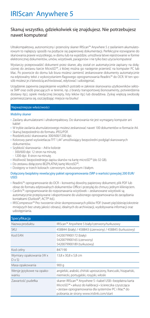 IRIScan Anywhere 5 ™ Skanuj wszystko, gdziekolwiek się znajdujesz. Nie potrzebujesz nawet komputera! Ultrakompaktowy, autonomiczny i przenośny skaner IRIScan™ Anywhere 5 z zasilaniem akumulatorowym to najlepszy sposób na pozbycie się papierowej dokumentacji. Perfekcyjne rozwiązanie do skanowania prawie wszystkiego, w domu lub na wyjeździe, umożliwia łatwe rejestrowanie w formie elektronicznej dokumentów, umów, wizytówek, paragonów i nie tylko bez użycia komputera! Wystarczy przeprowadzić dokument przez skaner, aby został on automatycznie zapisany na dołączonej do zestawu karcie MicroSD™, z której można go następnie przenieść na komputer PC lub Mac. Po powrocie do domu lub biura możesz zamienić zeskanowane dokumenty automatycznie na edytowalny tekst z wykorzystaniem flagowego oprogramowania Readiris™ do OCR. W ten sposób możesz je z łatwością archiwizować, edytować i udostępniać. Urządzenie zapewnia zaspokojenie wszelkich potrzeb w zakresie skanowania użytkowników sektora ŚMP oraz osób pracujących w terenie, np. z branży transportowej (konosamenty, potwierdzenia dostawy itp.), opieki medycznej (recepty, listy leków itp.) lub doradztwa. Zyskaj większą swobodę przemieszczania się, oszczędzając miejsce na biurku! Najważniejsze właściwości Mobilny skaner • Zasilany akumulatorami i ultrakompaktowy. Do skanowania nie jest wymagany komputer ani kable! • W trybie zasilania akumulatorowego możesz zeskanować nawet 100 dokumentów w formacie A4. • Skanuj bezpośrednio do formatu JPEG/PDF. • Rozdzielczości skanowania: 300/600/1200 dpi. • Kolorowy panel wyświetlacza TFT 1,44” umożliwiający bezpośredni podgląd skanowanych dokumentów. • Szybkość skanowania – A4/w kolorze -- 300/600 dpi: 12 stron na minutę. -- 1200 dpi: 8 stron na minutę. • Możliwość bezpośredniego zapisu skanów na kartę microSD™ (do 32 GB). • Do zestawu dołączono BEZPŁATNĄ kartę MicroSD™. • Dostępny w trzech kolorach: czerwonym, turkusowym i białym. Dołączony bezpłatny rewelacyjny pakiet oprogramowania (SRP o wartości powyżej 200 EUR/ USD) • Readiris™: oprogramowanie do OCR – konwertuj dowolny papierowy dokument, plik PDF lub obraz do formatu edytowalnych dokumentów Office i przesyłaj do chmury jednym kliknięciem. • Cardiris™: oprogramowanie do rozpoznawania wizytówek – zeskanowane wizytówki są automatycznie przepisywane i eksportowane do ulubionego oprogramowania do zarządzania kontaktami (Outlook®, ACT!® itd.). • IRISCompressor™ Pro: tworzenie silnie skompresowanych plików PDF (nawet pięćdziesięciokrotnie mniejszych bez utraty jakości obrazu), idealnych do archiwizacji, wydobywania informacji oraz udostępniania. Specyfikacja Nazwa produktu IRIScan™ Anywhere 5 biały/czerwony/turkusowy SKU 458844 (biały) / 458843 (czerwony) / 458845 (turkusowy) Kod EAN 5420079900172 (biały) 5420079900165 (czerwony) 5420079900189 (turkusowy) Kod celny 847190 Wymiary opakowania (W x D x S) 13,8 x 30,8 x 5,8 cm Masa opakowania 900 g Wersje językowe na opakowaniu angielski, arabski, chiński uproszczony, francuski, hiszpański, niemiecki, portugalski, rosyjski, włoski Zawartość pudełka skaner IRIScan™ Anywhere 5 • kabel USB • bezpłatna karta MicroSD™ • arkusz do kalibracji • ściereczka czyszcząca • zestaw oprogramowania dla systemów PC i Mac® do pobrania ze strony www.irislink.com/start Specyfikacja skanera Wymiary skanera (W x D x S) Masa skanera 3,5 x 27,5 x 4,4 cm 330 g Podawanie dokumentów Czujnik obrazu Rozdzielczości Kolor skanowania Formaty plików Maks. rozmiar papieru Wyświetlacz kolorowy 10 języków menu skanera automatyczny podajnik dokumentów (pojedynczo) kontaktowy czujnik obrazu (CIS) 300/600/1200 dpi kolor/czerń i biel JPEG/PDF do A4 kolorowy panel wyświetlacza 1,44” angielski, chiński uproszczony i tradycyjny, francuski, hiszpański, japoński, niderlandzki, niemiecki, rosyjski, włoski wbudowany akumulator litowo-polimerowy 1200 mAh Możliwość zeskanowania po pełnym naładowaniu: do 100 stron A4 kabel USB Akumulator Metoda ładowania Minimalne wymagania sprzętowe Skaner -- Co najmniej jeden port USB dostępny -- Możliwość instalacji w dowolnym systemie operacyjnym obsługującym protokoły pamięci masowych Pakiet oprogramowania dla systemu Windows® -- Komputer z procesorem Intel® Pentium® lub o porównywalnych parametrach -- System Microsoft® Windows® 10 / 8 / 7 -- Zalecana pamięć RAM: 512 MB -- 1 GB dostępnego miejsca na dysku twardym -- Połączenie z Internetem na potrzeby pobrania oprogramowania Pakiet oprogramowania dla systemu Mac OS® -- Komputer Mac® z procesorem Intel® -- Mac OS® X w wersji 10.9 lub nowszej -- Zalecana pamięć RAM: 512 MB -- 1 GB dostępnego miejsca na dysku twardym -- Połączenie z Internetem na potrzeby pobrania oprogramowania Document to Knowledge TM A CANON COMPANY CANON GROUP T161124-01 © Copyright 2016 IRIS. s.a. Wszelkie prawa zastrzeżone dla wszystkich krajów. IRIS, nazwy produktu IRIS, logotypy IRIS i logotypy produktów IRIS są znakami towarowymi IRIS. Wszystkie inne wymienione produkty i nazwy są znakami towarowymi lub zastrzeżonymi znakami towarowymi swoich właścicieli. www.irislink.com