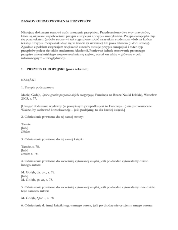 ZASADY OPRACOWYWANIA PRZYPISÓW Niniejszy dokument stanowi wzór tworzenia przypisów. Przedstawiono dwa typy przypisów, które są używane współcześnie: przypis europejski i przypis amerykański. Przypis europejski daje się poza tekstem (u dołu strony – i tak sugerujemy robić wszystkim studentom – lub na końcu tekstu). Przypis amerykański daje się w tekście (w nawiasie) lub poza tekstem (u dołu strony). Zgodnie z polskim zwyczajem większość autorów stosuje przypis europejski i to ten typ przypisów poleca się także studentom Akademii. Ponieważ jednak stosowanie prostszego przypisu amerykańskiego rozpowszechnia się szybko, został on także – głównie w celu informacyjnym – uwzględniony. 1. PRZYPIS EUROPEJSKI [poza tekstem] KSIĄŻKI 1. Przypis podstawowy: Maciej Gołąb, Spór o granice poznania dzieła muzycznego, Fundacja na Rzecz Nauki Polskiej, Wrocław 2003, s. 77. [Uwaga! Podawanie wydawcy (w powyższym przypadku jest to Fundacja…) nie jest konieczne. Ważne, by zachować konsekwencję – jeśli podajemy, to dla każdej książki.] 2. Odniesienie powtórne do tej samej strony: Tamże. [lub:] Ibidem. 3. Odniesienie powtórne do tej samej książki: Tamże, s. 78. [lub:] Ibidem, s. 78. 4. Odniesienie powtórne do wcześniej cytowanej książki, jeśli po drodze cytowaliśmy dzieło innego autora: M. Gołąb, dz. cyt., s. 78. [lub:] M. Gołąb, op. cit., s. 78. 5. Odniesienie powtórne do wcześniej cytowanej książki, jeśli po drodze cytowaliśmy inne dzieło tego samego autora: M. Gołąb, Spór…, s. 78. 6. Odniesienie do innej książki tego samego autora, jeśli po drodze nie cytujemy innego autora: Tenże, Chromatyka i tonalność w twórczości Chopina, Kraków 1991, s. 10. [lub:] Idem, Chromatyka i tonalność w twórczości Chopina, Kraków 1991, s. 10. W przypadku autorek: Taż, … Eadem, … 7. Przypis podstawowy książki tłumaczonej: Alfred Einstein, Muzyka w okresie romantyzmu, przeł. Michalina i Stefan Jarocińscy, Kraków 1983, s. 56. WYDAWNICTWA Z WIELOKROTNYM USYTUOWANIEM Ernst Behler, Frühromantik, Berlin/New York 1992, s. 119. WYDAWNICTWA WIELOTOMOWE Władysław Tatarkiewicz, Historia filozofii, t. 2, Warszawa 1990, s. 51. WYDAWNICTWA ZWARTE Danuta Mirka, Komunikacja muzyczna w stylu późnym, [w:] Styl późny w muzyce, literaturze i kulturze, red. Wojciech Kalaga i Eugeniusz Knapik, Katowice 2002, s. 131-138. ENCYKLOPEDIE Maciej Negrey, hasło Mendelssohn, [w:] Encyklopedia Muzyczna PWM, t. 6, red. Elżbieta Dziębowska, Kraków 2000, s. 180. WYDAWNICTWA CIĄGŁE (CZASOPISMA) Przypis podstawowy: Jagna Dankowska, Święto perkusji po raz czwarty, „Ruch Muzyczny” 17/18/2003, s. 28. Heinz Dill, Romantic Irony in the Works of Robert Schumann, „Musical Quarterly” 73/ 1989, s. 87. Mauricio Kagel, Teatr instrumentalny, „Res Facta” 3/1969, s. 53-62. STRONA INTERNETOWA Maciej Jabłoński, Przeciw muzykologii, http://free.art.pl/demusica/de_mu_12/12_03.html; data dostępu: 28. 01. 2013 2. CYTATY, PRZYWOŁANIA, KOMENTARZE CYTAT POŚREDNI Carl Dahlhaus, Filologia a historia recepcji. Uwagi do teorii edycji, „Muzyka” nr 1/1999. Cyt. za: M. Gołąb, Spór…, s. 76. DOPISEK W TEKŚCIE CYTOWANYM „Rozróżnienie to [wersji od wariantu – dop. mój, M.T.] nie budzi wątpliwości i jest pożyteczne dopóki tylko zapobiega powstawaniu tekstów mieszanych” (cyt. za: M. Gołąb, Spór…, s. 76.) ZMIANA FORMY GRAMATYCZNEJ TEKSTU CYTOWANEGO Zgodnie z definicją struktura jest „[systemem] składników” (cyt. za: M. Gołąb, dz. cyt., s. 190). Wyjaśnienie: w oryginale znajduje się wyrażenie „system składników”. Ponieważ w naszym przykładzie zaszła konieczność zmiany formy gramatycznej, zostało to zaznaczone nawiasami. OPUSZCZENIE W TEKŚCIE CYTOWANYM „Ideologiczne podstawy takiego poglądu na przedmiot, cel i zakres analizy stworzone zostały […] jeszcze w XIX wieku” (tamże, s. 192). UWAGA! Znak […] stosujemy tylko w środku cytatu, nie na początku i nie na końcu. Znaku […] używamy tylko wtedy, kiedy pomijamy tekst w ramach tego samego zdania. Jeśli „przeskakujemy” nad większą ilością tekstu, zaznaczamy nowy cytat (np. po przecinku). CYTOWANIE TEKSTÓW OBCOJĘZYCZNYCH Jeśli korzystamy z tekstów obcojęzycznych we własnym tłumaczeniu, powinniśmy albo zaznaczyć to na początku pracy, we wstępie (np. formułą: „Jeśli nie podano inaczej, wszystkie teksty obcojęzyczne w tłumaczeniu autora/autorki”) albo przy każdym cytacie (formuła w przypisie lub w tekście – w nawiasie: „tłum. własne” lub „tłum. autora/autorki”). W każdym przypadku w tekście głównym dajemy przekład, zaś w przypisie – KONIECZNIE – umieszczamy tekst w brzmieniu oryginalnym. OGÓLNE PRZYWOŁANIE W PRZYPISIE Zob. M. Gołąb, Spór…, s. 192. [lub:] Por. M. Gołąb, Spór…, s. 192. 3. INDEKS PRZYPISU Indeks przypisu należy umieszczać: - przed znakiem interpunkcyjnym kończącym zdanie (kropka) lub jego część (np. przecinek, średnik); - po cudzysłowie zamykającym cytat; - w szczególnych, rzadkich i uzasadnionych przypadkach po słowie znajdującym się w środku zdania. 4. PRZYPIS AMERYKAŃSKI [w tekście lub u dołu strony – z odniesieniami do wykazu bibliograficznego] KSIĄŻKI W tekście podajemy stronę: „Takie stanowisko prezentuje Maciej Gołąb, który postuluje wyjście poza samą analizę techniczną w kierunku bogatszych, choć zarazem mniej ścisłych rozważań hermeneutycznych [Gołąb 2003: 248-249]”. W bibliografii nie podajemy stron: Gołąb Maciej 2003: Spór o poznanie dzieła muzycznego, Wrocław. Jeśli odwołujemy się do większej liczby publikacji w danym roku, to stosujemy symbolikę literową: Gołąb Maciej 2003a: Spór o poznanie dzieła muzycznego, Wrocław. WYDAWNICTWA ZWARTE I CIĄGŁE (CZASOPISMA) Literska Barbara 1997: Dziewiętnastowieczne transkrypcje utworów Chopina. Próba systematyki, „Muzyka” nr 4. Negrey Maciej 2000: Mendels