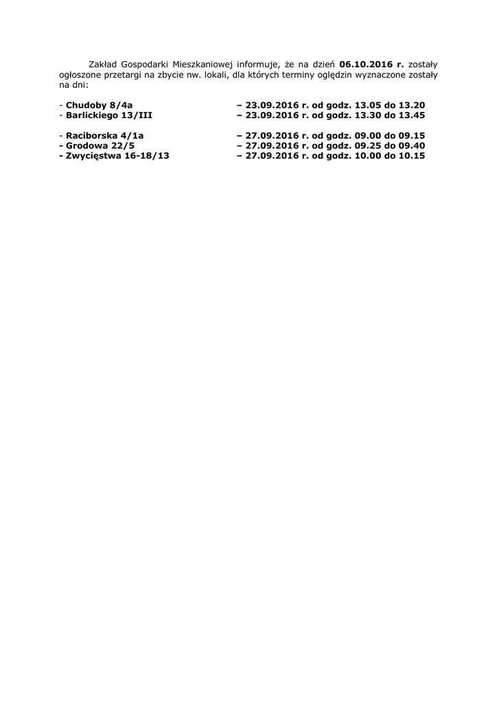 Zakład Gospodarki Mieszkaniowej informuje, że na dzień 06.10.2016 r. zostały ogłoszone przetargi na zbycie nw. lokali, dla których terminy oględzin wyznaczone zostały na dni: - Chudoby 8/4a - Barlickiego 13/III – 23.09.2016 r. od godz. 13.05 do 13.20 – 23.09.2016 r. od godz. 13.30 do 13.45 - Raciborska 4/1a - Grodowa 22/5 - Zwycięstwa 16-18/13 – 27.09.2016 r. od godz. 09.00 do 09.15 – 27.09.2016 r. od godz. 09.25 do 09.40 – 27.09.2016 r. od godz. 10.00 do 10.15