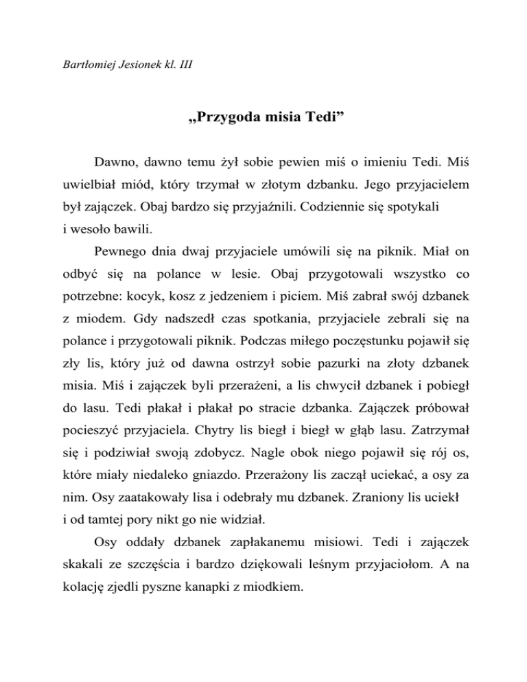 Bartłomiej Jesionek kl. III ,,Przygoda misia Tedi” Dawno, dawno temu żył sobie pewien miś o imieniu Tedi. Miś uwielbiał miód, który trzymał w złotym dzbanku. Jego przyjacielem był zajączek. Obaj bardzo się przyjaźnili. Codziennie się spotykali i wesoło bawili. Pewnego dnia dwaj przyjaciele umówili się na piknik. Miał on odbyć się na polance w lesie. Obaj przygotowali wszystko co potrzebne: kocyk, kosz z jedzeniem i piciem. Miś zabrał swój dzbanek z miodem. Gdy nadszedł czas spotkania, przyjaciele zebrali się na polance i przygotowali piknik. Podczas miłego poczęstunku pojawił się zły lis, który już od dawna ostrzył sobie pazurki na złoty dzbanek misia. Miś i zajączek byli przerażeni, a lis chwycił dzbanek i pobiegł do lasu. Tedi płakał i płakał po stracie dzbanka. Zajączek próbował pocieszyć przyjaciela. Chytry lis biegł i biegł w głąb lasu. Zatrzymał się i podziwiał swoją zdobycz. Nagle obok niego pojawił się rój os, które miały niedaleko gniazdo. Przerażony lis zaczął uciekać, a osy za nim. Osy zaatakowały lisa i odebrały mu dzbanek. Zraniony lis uciekł i od tamtej pory nikt go nie widział. Osy oddały dzbanek zapłakanemu misiowi. Tedi i zajączek skakali ze szczęścia i bardzo dziękowali leśnym przyjaciołom. A na kolację zjedli pyszne kanapki z miodkiem.