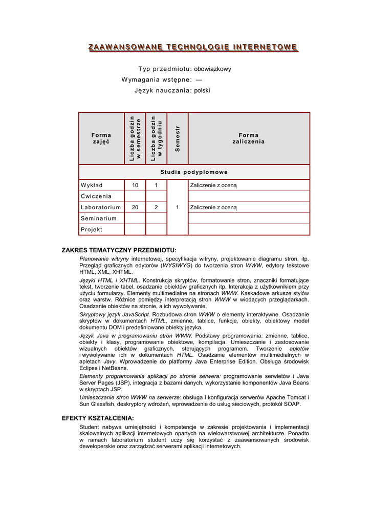 ZZAAAAW W AAN NSSO OW W AAN NEE TTEEC CH HN NO OLLO OG GIIEE IIN NTTEER RN NEETTO OW W EE T yp pr ze dm i ot u : obowiązkowy W ym agan i a ws tę p ne : — Semestr Liczba godzin w tygodniu Forma zajęć Liczba godzin w semestrze J ę z yk n auc za n i a : polski Forma zaliczenia S t u d i a p o d yp l o m o w e W yk ł a d 10 1 20 2 Zaliczenie z oceną Ć wi c z e n i a Laboratorium 1 Zaliczenie z oceną Seminarium Projekt ZAKRES TEMATYCZNY PRZEDMIOTU: Planowanie witryny internetowej, specyfikacja witryny, projektowanie diagramu stron, itp. Przegląd graficznych edytorów (WYSIWYG) do tworzenia stron WWW, edytory tekstowe HTML, XML, XHTML. Języki HTML i XHTML. Konstrukcja skryptów, formatowanie stron, znaczniki formatujące tekst, tworzenie tabel, osadzanie obiektów graficznych itp. Interakcja z użytkownikiem przy użyciu formularzy. Elementy multimedialne na stronach WWW. Kaskadowe arkusze stylów oraz warstw. Różnice pomiędzy interpretacją stron WWW w wiodących przeglądarkach. Osadzanie obiektów na stronie, a ich wywoływanie. Skryptowy język JavaScript. Rozbudowa stron WWW o elementy interaktywne. Osadzanie skryptów w dokumentach HTML, zmienne, tablice, funkcje, obiekty, obiektowy model dokumentu DOM i predefiniowane obiekty języka. Język Java w programowaniu stron WWW. Podstawy programowania: zmienne, tablice, obiekty i klasy, programowanie obiektowe, kompilacja. Umieszczanie i zastosowanie wizualnych obiektów graficznych, sterujących programem. Tworzenie apletów i wywoływanie ich w dokumentach HTML. Osadzanie elementów multimedialnych w apletach Javy. Wprowadzenie do platformy Java Enterprise Edition. Obsługa środowisk Eclipse i NetBeans. Elementy programowania aplikacji po stronie serwera: programowanie serwletów i Java Server Pages (JSP), integracja z bazami danych, wykorzystanie komponentów Java Beans w skryptach JSP. Umieszczanie stron WWW na serwerze: obsługa i konfiguracja serwerów Apache Tomcat i Sun Glassfish, deskryptory wdrożeń, wprowadzenie do usług sieciowych, protokół SOAP. EFEKTY KSZTAŁCENIA: Student nabywa umiejętności i kompetencje w zakresie projektowania i implementacji skalowalnych aplikacji internetowych opartych na wielowarstwowej architekturze. Ponadto w ramach laboratorium student uczy się korzystać z zaawansowanych środowisk deweloperskie oraz zarządzać serwerami aplikacji internetowych. WARUNKI ZALICZENIA: Wykład - warunkiem zaliczenia jest uzyskanie pozytywnej oceny z kolokwium pisemnego przeprowadzonego przed sesją egzaminacyjną. Laboratorium - warunkiem zaliczenia jest uzyskanie pozytywnych ocen ze wszystkich ćwiczeń laboratoryjnych, przewidzianych do realizacji w ramach programu laboratorium. LITERATURA 1. Bruce Eckel, Thinking in Java. Edycja polska. Wydanie IV, Helion, Gliwice, 2006. 2. Andrzej Marciniak, JavaServer Faces i Eclipse Galileo. Tworzenie aplikacji WWW, Helion, Gliwice, 2010. 3. Tom Negrino, Dori Smith, Po prostu JavaScript i Ajax. Wydanie VII, Helion, Gliwice, 2010. 4. Włodzimierz Gajda, HTML, XHTML i CSS. Praktyczne projekty, Helion, Gliwice, 2007.