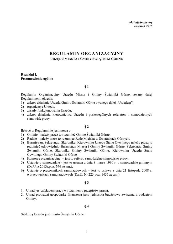 tekst ujednolicony wrzesień 2015 REGULAMIN ORGANIZACYJNY URZĘDU MIASTA I GMINY ŚWIĄTNIKI GÓRNE Rozdział I. Postanowienia ogólne §1 Regulamin Organizacyjny Urzędu Miasta i Gminy Świątniki Górne, zwany dalej Regulaminem, określa: 1) zakres działania Urzędu Gminy Świątniki Górne zwanego dalej „Urzędem”, 2) organizację Urzędu, 3) zasady funkcjonowania Urzędu, 4) zakres działania kierownictwa Urzędu i poszczególnych referatów i samodzielnych stanowisk pracy. §2 Ilekroć w Regulaminie jest mowa o: 1) Gminie - należy przez to rozumieć Gminę Świątniki Górne, 2) Radzie - należy przez to rozumieć Radę Miejską w Świątnikach Górnych, 3) Burmistrzu, Sekretarzu, Skarbniku, Kierowniku Urzędu Stanu Cywilnego należy przez to rozumieć odpowiednio Burmistrza Miasta i Gminy Świątniki Górne, Sekretarza Gminy Świątniki Górne, Skarbnika Gminy Świątniki Górne, Kierownika Urzędu Stanu Cywilnego Gminy Świątniki Górne 4) Komórce organizacyjnej – jest to referat, samodzielne stanowisko pracy, 5) Ustawie o samorządzie - jest to ustawa z dnia 8 marca 1990 r. o samorządzie gminnym (Dz.U. z 2013r.poz. 594 ze zm.), 6) Ustawie o pracownikach samorządowych – jest to ustawa z dnia 21 listopada 2008 r. o pracownikach samorządowych (Dz.U. Nr 223 poz. 1455 ze zm.). §3 1. Urząd jest zakładem pracy w rozumieniu przepisów prawa. 2. Urząd prowadzi gospodarkę finansową jako jednostka budżetowa związana z budżetem Gminy. §4 Siedzibą Urzędu jest miasto Świątniki Górne. 1 Rozdział II. Zadanie i zakres działania Urzędu §5 1. Urząd realizuje zadania należące do Burmistrza, Rady, Komisji Rady oraz innych organów funkcjonujących w strukturze Gminy. Urząd zapewnia obsługę prawną gminnym jednostkom organizacyjnym, chyba, że statut gminnej jednostki organizacyjnej stanowi inaczej. 2. Obsługę prawną prowadzi na podstawie umowy cywilno-prawnej kancelaria prawna. §6 Do zakresu działania Urzędu należy: 1) Zapewnienie warunków należytego wykonywania zadań spoczywających na Gminie w tym: a) zadań własnych Gminy, b) zadań zleconych Gminie na podstawie ustaw w tym, organizację i przeprowadzenie wyborów powszechnych i referendów, c) zadań powierzonych, wykonywanych na podstawie porozumienia z organami administracji rządowej i samorządowej, d) zadań powierzonych w drodze porozumienia komunalnego, 2) Zapewnienie pomocy organom Gminy w wykonywaniu ich zadań i kompetencji, a w szczególności: a) przygotowanie materiałów niezbędnych do podejmowania uchwał, wydawania decyzji i postanowień i innych aktów z zakresu administracji publicznej oraz podejmowanie innych czynności prawnych przez organy Gminy, b) wykonywanie na podstawie udzielonych upoważnień czynności faktycznych wchodzących w zakres zadań Gminy, 3) Zapewnienie organom Gminy możliwości przyjmowania i rozpatrywania oraz załatwiania skarg i wniosków, 4) Przygotowanie projektów uchwał Rady w tym budżetu Gminy, wykonywanie uchwał Rady, zarządzeń ogólnych, zarządzeń wewnętrznych, pism okólnych, regulaminów i instrukcji Burmistrza oraz ich realizacja, 5) Zapewnienie warunków organizacyjnych dla pracy Rady i jej Komisji, 6) prowadzenie zbiorów przepisów prawa miejscowego i udostępnianie go do wglądu w siedzibie Urzędu, 7) Wykonywanie prac kancelaryjnych zgodnie z obowiązującym w tym zakresie przepisami prawa, a w szczególności: a) przyjmowanie, rozdział, przekazywanie i wysyłanie korespondencji, b) prowadzenie wewnętrznego obiegu akt, c) przechowywanie akt i prowadzenie w tym celu archiwum zakładowego, d) przekazywanie akt do archiwum państwowego. 2 Rozdział III. Organizacja Urzędu §7 W skład Urzędu wchodzą referaty oraz samodzielne stanowiska o następujących oznaczeniach literowych: 1) Burmistrz oznaczenie - BM 2) Zastępca Burmistrza oznaczenie - ZB 3) Sekretarz Gminy oznaczenie - SG 4) Doradca Burmistrza – Pełnomocnik ds. strategii i rozwoju oznaczenie - DB 5) Skarbnik Gminy i Referat Finansowo-Budżetowy oznaczenie - PFN 6) Referat Organizacyjny oznaczenie - ORG w zakresie spraw dot. kontroli zarządczej oznaczenie - K 7) Referat Rozwoju Lokalnego oznaczenie - RL w zakresie spraw obronnych i kryzysowych oznaczenie - OC 8) Referat Gospodarki Przestrzennej, Infrastruktury i Środowiska oznaczenie - GPI 9) Referat ds. Komunalnych i Gospodarczych oznaczenie - KG 10) Urząd Stanu Cywilnego oznaczenie - USC w zakresie spraw dot. ewidencji ludności i dowodów osobistych oznaczenie - SO 11) Samodzielne stanowisko ds. profilaktyki uzależnień oznaczenie - PU 12) Samodzielne stanowisko ds. informatyki oznaczenie - IN 13) Pełnomocnik ds. informacji niejawnych oznaczenie - OIN 14) Administrator Bezpieczeństwa Informacji oznaczenie - ABI §8 1. Kierownikiem Referatu Finansowo-Budżetowego jest Skarbnik Gminy. 2. Kierownik Urzędu Stanu Cywilnego wykonuje zadania i posiada uprawnienia kierownika referatu. §9 Strukturę organizacyjną Urzędu przedstawia załącznik Nr 1 do Regulaminu. Rozdział IV. Zasady funkcjonowania – podział zadań i kompetencji § 10 1. Urząd wykonując zadania przestrzega zasad: 1) praworządności, 2) służenia na rzecz społeczności lokalnej, 3) racjonalnego gospodarowania mieniem publicznym, 3 4) kontroli wewnętrznej, 5) wzajemnego współdziałania pomiędzy stanowiskami pracy, 6) jednoosobowego kierownictwa. 2. Pracownicy Urzędu wykonując swoje obowiązki działają na podstawie i w granicach prawa. § 11 3. Kierownikiem Urzędu jest Burmistrz, który kieruje Urzędem przy pomocy Zastępcy Burmistrza, Sekretarza, Skarbnika i kierowników referatów, którzy ponoszą przed nim odpowiedzialność za realizację zadań. 4. W przypadku nieobecności w pracy Burmistrza w zakresie bieżącej działalności Urzędem kieruje Zastępca Burmistrza, a w wypadku jego nieobecności - Kierownik Referatu Organizacyjnego. 5. Burmistrz bezpośrednio nadzoruje pracę: Zastępcy, Sekretarza, Skarbnika, Kierownika Urz