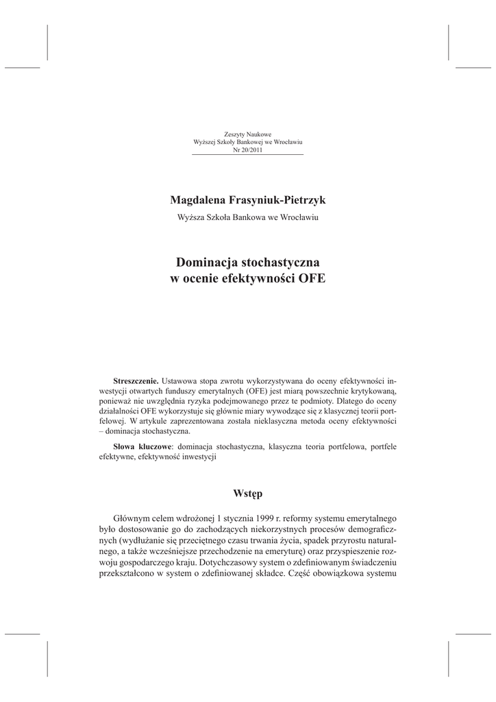 165 Zeszyty Naukowe Wyższej Szkoły Bankowej we Wrocławiu Nr 20/2011 Magdalena Frasyniuk-Pietrzyk Wyższa Szkoła Bankowa we Wrocławiu Dominacja stochastyczna w ocenie efektywności OFE Streszczenie. Ustawowa stopa zwrotu wykorzystywana do oceny efektywności inwestycji otwartych funduszy emerytalnych (OFE) jest miarą powszechnie krytykowaną, ponieważ nie uwzględnia ryzyka podejmowanego przez te podmioty. Dlatego do oceny działalności OFE wykorzystuje się głównie miary wywodzące się z klasycznej teorii portfelowej. W artykule zaprezentowana została nieklasyczna metoda oceny efektywności – dominacja stochastyczna. Słowa kluczowe: dominacja stochastyczna, klasyczna teoria portfelowa, portfele efektywne, efektywność inwestycji Wstęp Głównym celem wdrożonej 1 stycznia 1999 r. reformy systemu emerytalnego było dostosowanie go do zachodzących niekorzystnych procesów demograficznych (wydłużanie się przeciętnego czasu trwania życia, spadek przyrostu naturalnego, a także wcześniejsze przechodzenie na emeryturę) oraz przyspieszenie rozwoju gospodarczego kraju. Dotychczasowy system o zdefiniowanym świadczeniu przekształcono w system o zdefiniowanej składce. Część obowiązkowa systemu 166 Magdalena Frasyniuk-Pietrzyk podzielona została na część finansową i niefinansową. Składkę emerytalną w celu dywersyfikacji ryzyka podzielono między dwa indywidualne konta. W części finansowej systemu inwestowaniem środków zajmują się otwarte fundusze emerytalne (OFE). OFE są inwestorami instytucjonalnymi, których politykę inwestycyjną determinują w dużym stopniu ograniczenia nałożone przez ustawodawcę. Polityka inwestycyjna poszczególnych funduszy jest bardzo zbliżona, ponieważ zarządzający aktywami koncentrują się na osiągnięciu odpowiedniej stopy zwrotu na koniec marca i września, kiedy to następuje porównanie wyników osiągniętych w ostatnich trzech latach. Powszechna krytyka ustawowej miary efektywności prowadzi do poszukiwania innych metod oceny działalności inwestycyjnej OFE. Wśród nich najpopularniejsze są miary wywodzące się z klasycznej teorii portfelowej. Miary te wykorzystują zależność ryzyko – stopa zwrotu. Alternatywnym podejściem w ocenie efektywności inwestycji może być kryterium dominacji stochastycznej. Celem artykułu jest sprawdzenie możliwości wykorzystania dominacji stochastycznej do oceny działalności OFE. 1. Klasyczna teoria portfelowa Autorem klasycznej teorii portfelowej jest Harry Markowitz1. Miary efektywności oparte na teorii portfelowej pozwalają nie tylko na porównanie wyników inwestycyjnych poszczególnych podmiotów, ale również odniesienie ich do ustalonego benchmarku (portfela wzorcowego). W ciągu ostatnich lat popularność zyskała grupa miar określana jako RiskAdjusted Performance Measures (RAPM), czyli miary efektywności zarządzania portfelem skorygowane o ryzyko. Do grupy tej należą mierniki Sharpe’a, Treynora i Jensena, które stanowią podstawę do tworzenia innych miar efektywności. Miary RAPM uwzględniają ryzyko i stopę zwrotu charakterystyczną dla inwestycji i pozwalają na stworzenie rankingu inwestycji, który szereguje je na podstawie efektywności zarządzania. Typowa miara z rodziny RAPM przyjmuje następujące postaci: RAPM = miara stopy zwrotu / miara ryzyka. Klasyczna teoria portfelowa opiera się jednak na wielu założeniach. Wsród najważniejszych należy wymienić założenie o normalności rozkładu stóp zwrotu 1 H. Markowitz, Portfolio selection, „The Journal of Finance” 1959, Vol. 7, No. 1, s. 77-91. Dominacja stochastyczna w ocenie efektywności OFE 167 z inwestycji czy awersję do ryzyka inwestora, który ma kwadratową funkcję użyteczności2. 2. Dominacja stochastyczna Metoda (kryterium) dominacji stochastycznej (stochastic dominance) opiera się na mniejszej liczbie założeń niż teoria portfelowa. Jedyne założenie, jakie należy poczynić stosując tę metodę, to założenie dotyczące preferencji inwestora3. Dominacja stochastyczna pozwala na ocenę dwóch inwestycji pod względem atrakcyjności dla inwestora. Metoda ta oparta jest na teorii oczekiwanej użyteczności, która zakłada, że inwestor wybiera inwestycję, która ma największą oczekiwaną użyteczność wypłaty oraz że inwestor postępuje racjonalnie4. Funkcja użyteczności inwestora jest jednocześnie niemalejąca i wklęsła. Są to warunki nałożone na funkcje użyteczności, które oznaczają, że „inwestor preferuje większy zysk” oraz charakteryzuje się „awersją do ryzyka”. Wykorzystanie teorii oczekiwanej użyteczności do oceny inwestycji obarczonych różnym poziomem ryzyka wymaga znajomości funkcji użyteczności indywidualnego inwestora. Metoda dominacji stochastycznej pozwala na ocenę inwestycji w sytuacji, gdy nie znamy kształtu funkcji użyteczności poszczególnych inwestorów, ale możemy przyjąć, iż dana klasa funkcji użyteczności jest reprezentatywna dla pewnej grupy inwestorów. Założenie takie możemy poczynić dla członków funduszy emerytalnych, którzy oczekują jak najwyższej stopy zwrotu przy możliwie niskim poziomie ryzyka. 2.1. Dominacja stochastyczna pierwszego rzędu (First stochastic dominance – FSD) W kryterium dominacji stochastycznej pierwszego stopnia przyjmuje się jedynie założenie, że funkcja użyteczności inwestora jest niemalejąca. Inwestor taki woli posiadać więcej niż mniej, natomiast nie jest brana pod uwagę jego skłonność do ryzyka. Funkcja użyteczności inwestora może być na pewnych odcinkach wypukła, a na innych wklęsła. 2 Por. G. Trzpiot, Dominacje w modelowaniu i analizie ryzyka na rynku finansowym, „Prace Naukowe Akademii Ekonomicznej w Katowicach”, Katowice 2006. 3 Tamże. 4 Por. P. Jaworski, J. Micał, Modelowanie matematyczne w finansach i ubezpieczeniach, Poltext, Warszawa 2005. 168 Magdalena Frasyniuk-Pietrzyk Definicja 1 „Portfel A (o dystrybuancie