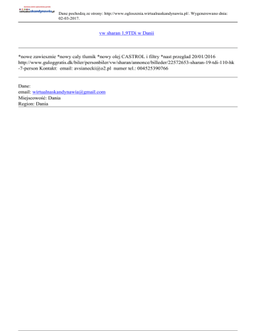Dane pochodzą ze strony: http://www.ogloszenia.wirtualnaskandynawia.pl/. Wygenerowano dnia: 02-03-2017. vw sharan 1,9TDi w Danii *nowe zawiesznie *nowy caly tlumik *nowy olej CASTROL i filtry *nast przeglad 20/01/2016 http://www.guloggratis.dk/biler/personbiler/vw/sharan/annonce/billeder/22572653-sharan-19-tdi-110-hk -7-person Kontakt: email: [email protected] numer tel.: 004525390766 Dane: email: [email protected] Miejscowość: Dania Region: Dania