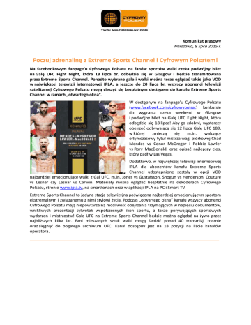 Komunikat prasowy Warszawa, 8 lipca 2015 r. Poczuj adrenalinę z Extreme Sports Channel i Cyfrowym Polsatem! Na facebookowym fanpage’u Cyfrowego Polsatu na fanów sportów walki czeka podwójny bilet na Galę UFC Fight Night, która 18 lipca br. odbędzie się w Glasgow i będzie transmitowana przez Extreme Sports Channel. Ponadto wybrane gale i walki można teraz oglądać także jako VOD w największej telewizji internetowej IPLA, a jeszcze do 20 lipca br. wszyscy abonenci telewizji satelitarnej Cyfrowego Polsatu mogą cieszyć się bezpłatnym dostępem do kanału Extreme Sports Channel w ramach „otwartego okna”. W dostępnym na fanpage’u Cyfrowego Polsatu (www.facebook.com/cyfrowypolsat) konkursie do wygrania czeka weekend w Glasgow i podwójny bilet na Galę UFC Fight Night, która odbędzie się 18 lipca! Aby go zdobyć, wystarczy obejrzeć odbywającą się 12 lipca Galę UFC 189, w której zmierzą się m.in. walczący o tymczasowy tytuł mistrza wagi piórkowej Chad Mendes vs Conor McGregor i Robbie Lawler vs Rory MacDonald, oraz opisać najlepszy cios, który padł w Las Vegas. Dodatkowo, w największej telewizji internetowej IPLA dla abonentów kanału Extreme Sports Channel udostępnione zostały w opcji VOD najbardziej emocjonujące walki z Gal UFC, m.in. Jones vs Gustafsson, Shogun vs Henderson, Couture vs Lesnar czy Lesnar vs Carwin. Materiały można oglądać bezpłatnie na dekoderach Cyfrowego Polsatu, stronie www.ipla.tv, na smartfonach oraz w aplikacji IPLA na PC i Smart TV. Extreme Sports Channel to jedyna stacja telewizyjna poświęcona najbardziej emocjonującym sportom ekstremalnym i związanemu z nimi stylowi życia. Podczas „otwartego okna” kanału wszyscy abonenci Cyfrowego Polsatu mają niepowtarzalną możliwość obejrzenia trzymających w napięciu dokumentów, wnikliwych prezentacji sylwetek współczesnych ikon sportu, a także porywających sportowych wydarzeń i mistrzostw! Gale UFC na Extreme Sports Channel będzie można oglądać na żywo przez najbliższych kilka lat. Fani mieszanych sztuk walki mogą śledzić ponad 40 transmisji rocznie oraz sięgnąć do bogatego archiwum UFC. Kanał dostępny jest na 18 pozycji na liście kanałów operatora. __________________________________________________________________________________