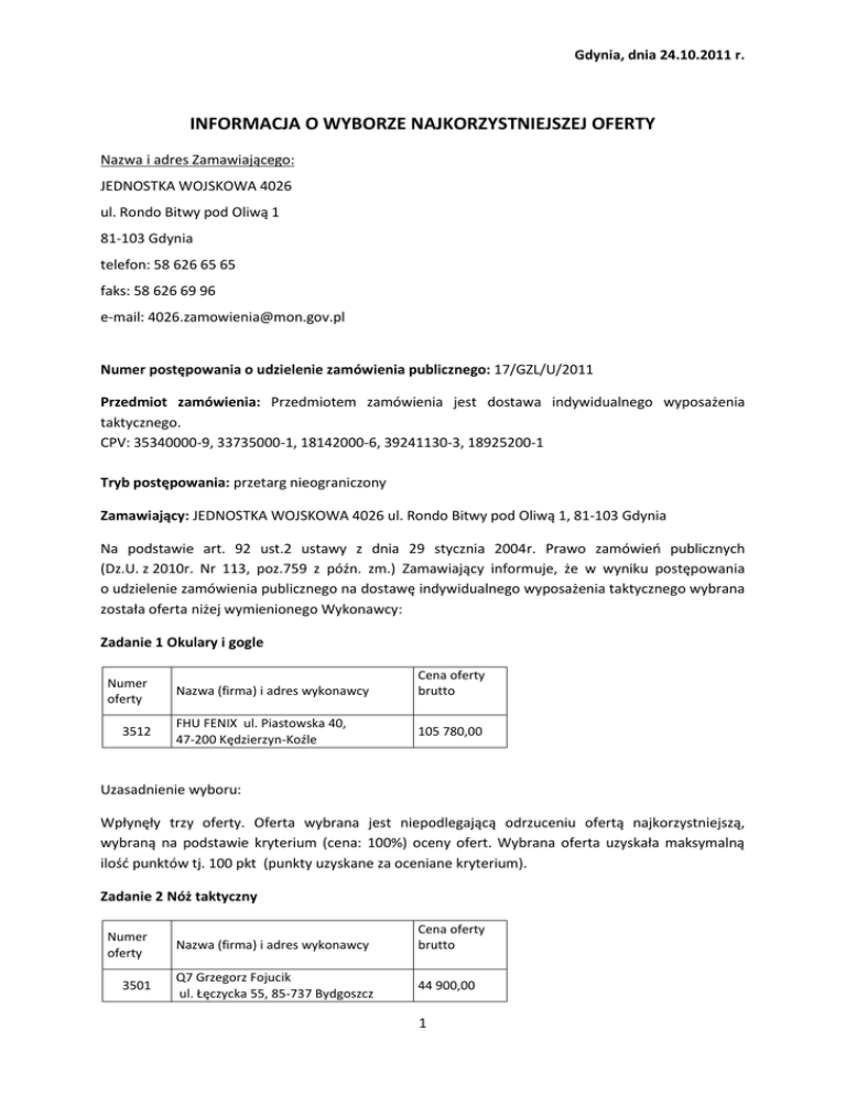 Gdynia, dnia 24.10.2011 r. INFORMACJA O WYBORZE NAJKORZYSTNIEJSZEJ OFERTY Nazwa i adres Zamawiającego: JEDNOSTKA WOJSKOWA 4026 ul. Rondo Bitwy pod Oliwą 1 81-103 Gdynia telefon: 58 626 65 65 faks: 58 626 69 96 e-mail: [email protected] Numer postępowania o udzielenie zamówienia publicznego: 17/GZL/U/2011 Przedmiot zamówienia: Przedmiotem zamówienia jest dostawa indywidualnego wyposażenia taktycznego. CPV: 35340000-9, 33735000-1, 18142000-6, 39241130-3, 18925200-1 Tryb postępowania: przetarg nieograniczony Zamawiający: JEDNOSTKA WOJSKOWA 4026 ul. Rondo Bitwy pod Oliwą 1, 81-103 Gdynia Na podstawie art. 92 ust.2 ustawy z dnia 29 stycznia 2004r. Prawo zamówieo publicznych (Dz.U. z 2010r. Nr 113, poz.759 z późn. zm.) Zamawiający informuje, że w wyniku postępowania o udzielenie zamówienia publicznego na dostawę indywidualnego wyposażenia taktycznego wybrana została oferta niżej wymienionego Wykonawcy: Zadanie 1 Okulary i gogle Numer oferty 3512 Nazwa (firma) i adres wykonawcy FHU FENIX ul. Piastowska 40, 47-200 Kędzierzyn-Koźle Cena oferty brutto 105 780,00 Uzasadnienie wyboru: Wpłynęły trzy oferty. Oferta wybrana jest niepodlegającą odrzuceniu ofertą najkorzystniejszą, wybraną na podstawie kryterium (cena: 100%) oceny ofert. Wybrana oferta uzyskała maksymalną ilośd punktów tj. 100 pkt (punkty uzyskane za oceniane kryterium). Zadanie 2 Nóż taktyczny Numer oferty 3501 Nazwa (firma) i adres wykonawcy Q7 Grzegorz Fojucik ul. Łęczycka 55, 85-737 Bydgoszcz Cena oferty brutto 44 900,00 1 Uzasadnienie wyboru: Wpłynęły trzy oferty. Oferta wybrana jest niepodlegającą odrzuceniu ofertą najkorzystniejszą, wybraną na podstawie kryterium (cena: 100%) oceny ofert. Wybrana oferta uzyskała maksymalną ilośd punktów tj. 100 pkt (punkty uzyskane za oceniane kryterium). Zadanie 3 Znacznik stroboskopowy Numer oferty Nazwa (firma) i adres wykonawcy 3541 SPECOPS Tomasz Jerchewicz ul. Małopolska 14, 81-555 Gdynia Cena oferty brutto 53 000,00 Uzasadnienie wyboru: Wpłynęły trzy oferty. Jedna oferta została odrzucona. Oferta wybrana jest niepodlegającą odrzuceniu ofertą najkorzystniejszą, wybraną na podstawie kryterium (cena: 100%) oceny ofert. Wybrana oferta uzyskała maksymalną ilośd punktów tj. 100 pkt (punkty uzyskane za oceniane kryterium). Zadanie 4 Zestaw obsługowy Numer oferty 3463 Nazwa (firma) i adres wykonawcy Z.P.H.WYRÓB AKCESORIÓW MYŚLIWSKICH Jolanta Łuszczek ul. Głowna 141, 97-213 Smardzewice Cena oferty brutto 120 000,00 Uzasadnienie wyboru: Wpłynęły dwie oferty. Jedna oferta została odrzucona. Oferta wybrana jest niepodlegającą odrzuceniu ofertą najkorzystniejszą, wybraną na podstawie kryterium (cena: 100%) oceny ofert. Wybrana oferta uzyskała maksymalną ilośd punktów tj. 100 pkt (punkty uzyskane za oceniane kryterium). Zadanie 6 Kabura do pistoletu Sig Sauer P226 z wyposażeniem Numer oferty 3541 Nazwa (firma) i adres wykonawcy SPECOPS Tomasz Jerchewicz ul. Małopolska 14, 81-555 Gdynia Cena oferty brutto 80 000,00 Uzasadnienie wyboru: Wpłynęły dwie oferty. Jedna oferta została odrzucona. Oferta wybrana jest niepodlegającą odrzuceniu ofertą najkorzystniejszą, wybraną na podstawie kryterium (cena: 100%) oceny ofert. Wybrana oferta uzyskała maksymalną ilośd punktów tj. 100 pkt (punkty uzyskane za oceniane kryterium). 2 Zadanie 7 Magazynek do pistoletu Sig Sauer P226 Numer oferty 3541 Nazwa (firma) i adres wykonawcy SPECOPS Tomasz Jerchewicz ul. Małopolska 14, 81-555 Gdynia Cena oferty brutto 17 500,00 Uzasadnienie wyboru: Wpłynęła jedna oferta. Oferta wybrana jest niepodlegającą odrzuceniu ofertą najkorzystniejszą, wybraną na podstawie kryterium (cena: 100%) oceny ofert. Wybrana oferta uzyskała maksymalną ilośd punktów tj. 100 pkt (punkty uzyskane za oceniane kryterium). Streszczenie oceny i porównania złożonych ofert Zadanie 1 Okulary i gogle Numer oferty 3512 3538 3541 Nazwa (firma) i adres wykonawcy FHU FENIX ul. Piastowska 40, 47-200 Kędzierzyn-Koźle RWS CETUS Rafał Safader ul. Jaracza 25A, 76-200 Słupsk SPECOPS Tomasz Jerchewicz ul. Małopolska 14, 81-555 Gdynia Cena oferty brutto 105 780,00 108 240,00 173 250,00 Liczba punktów 100 pkt 97,72 pkt 61,05 pkt Zadanie 2 Nóż taktyczny Numer oferty 3501 3512 3541 Nazwa (firma) i adres wykonawcy Q7 Grzegorz Fojucik ul. Łęczycka 55, 85-737 Bydgoszcz FHU FENIX ul. Piastowska 40, 47-200 Kędzierzyn-Koźle SPECOPS Tomasz Jerchewicz ul. Małopolska 14, 81-555 Gdynia Cena oferty brutto 44 900,00 86 100,00 50 800,00 Liczba punktów 100 pkt 52,14 pkt 88,38 pkt Zadanie 3 Znacznik stroboskopowy Numer oferty Nazwa (firma) i adres wykonawcy Cena oferty brutto 3512 FHU FENIX ul. Piastowska 40, 47-200 Kędzierzyn-Koźle 79 000,00 3535 SMART Sp. z o.o. Al. Jana Pawła II 5, 81-345 Gdynia 41 918,00 3541 SPECOPS Tomasz Jerchewicz ul. Małopolska 14, 81-555 Gdynia 53 000,00 3 Liczba punktów 67,08 pkt oferta odrzucona 100 pkt Zadanie 4 Zestaw obsługowy Numer oferty Nazwa (firma) i adres wykonawcy Cena oferty brutto Liczba punktów 3463 Z.P.H.WYRÓB AKCESORIÓW MYŚLIWSKICH Jolanta Łuszczek ul. Głowna 141, 97-213 Smardzewice 120 000,00 100 pkt 3541 SPECOPS Tomasz Jerchewicz ul. Małopolska 14, 81-555 Gdynia 145 500,00 oferta odrzucona Zadanie 5 Kabura udowa do pistoletu Sig Sauer P226 Zamawiający unieważnił postępowanie o zamówienie publiczne w zakresie zadania nr 5 na podstawie art. 93 pkt. 1ppk. 1)Pzp. -nie złożono żadnej oferty niepodlegającej odrzuceniu. Zadanie 6 Kabura do pistoletu Sig Sauer P226 z wyposażeniem Numer oferty Nazwa (firma) i adres wykonawcy Cena oferty brutto Liczba punktów oferta odrzucona 3508 AKTIVLIFE. EU Joanna Klimczak ul. Rożnowska 6, 04-213 Warszawa 61 500,00 3541 SPECOPS Tomasz Jerchewicz ul. Małopolska 14, 81-555 Gdynia 80 000,00 100 pkt Zadanie 7 Magazynek do pistoletu Sig Sauer P226 Numer oferty 3541 Nazwa (firma) i adres wykonawcy SPECOPS Tomasz Jerchewicz ul. Małopolska 14, 81-555 Gdynia Cena oferty brutto