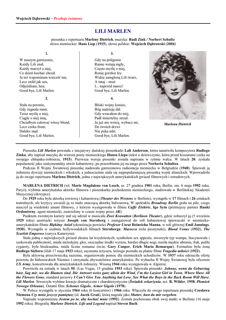 Wojciech Dąbrowski – Przeboje światowe LILI MARLEN piosenka z repertuaru Marleny Dietrich, muzyka: Rudi Zink / Norbert Schultz słowa niemieckie: Hans Liep (1915), słowa polskie: Wojciech Dąbrowski (2004) 1. W naszym garnizonie, Każdy Lili znał, Każdy marzył o niej, Co dzień kochać chciał. Ja też wspominam wieczór ten, Lecz znikł jak sen, Odjeżdżam, hen, Good bye, Lili Marlen. 2. Stała na peronie, Gdy żegnała mnie. Teraz myślę o niej, Ciągle o niej śnię, Chciałbym całować włosy blond, Lecz czeka front, Daleko stąd. Good bye, Lili Marlen. 3. Gdy na poligonie Ranne wstają mgły, Często myślę o niej, Ronię gorzkie łzy. Widzę zamgloną Lili twarz, A tutaj - straż I... naprzód marsz! Good bye, Lili Marlen. 4. Bliski wojny koniec, Bóg nadzieję dał. Gdy wracałem do niej, Padł śmiertelny strzał. Ja już nie wrócę, wybacz mi, Do twoich drzwi Nie puka nikt. Good bye, Lili Marlen. Marlena Dietrich Piosenka Lili Marlen powstała z inicjatywy duńskiej piosenkarki Lali Anderson, która namówiła kompozytora Rudiego Zinka, aby napisał muzykę do wiersza poety niemieckiego Hansa Liepa (tekst o dziewczynie, która przed koszarami czeka na swojego chłopaka-żołnierza, 1915). Pierwsza wersja piosenki została napisana w rytmie walca. W latach 20. zyskała popularność jako sentymentalny utwór kabaretowy, po przerobieniu jej na tango przez Norberta Schultza. Podczas II Wojny Światowej piosenkę nadawała garnizonowa radiostacja niemiecka w Belgradzie (1940). Śpiewali ją żołnierze dywizji niemieckich i włoskich, a jednocześnie stała się najpopularniejszą piosenką wojsk alianckich. Wprowadziła ją do swego repertuaru Marlena Dietrich, jedna z największych amerykańskich gwiazd filmowych i estradowych. MARLENA DIETRICH (wł. Marie Magdalene von Losch, ur. 27 grudnia 1901 roku, Berlin, zm. 6 maja 1992 roku, Paryż), wybitna amerykańska aktorka filmowa i piosenkarka pochodzenia niemieckiego, studiowała w Berlińskiej Akademii Muzycznej (skrzypce). Do 1929 roku była aktorką rewiową i kabaretową (Theater des Westens w Berlinie), wystąpiła w 17 filmach i 26 sztukach teatralnych, ale krytycy uważali ją za mało znaczącą aktorkę bulwarową. W spektaklu Broadway Berlin grała na pile, czego nauczył ją wiedeński amant filmowy, z którym występowała w filmie Caffe Elektric, Igo Sym (późniejszy partner Hanki Ordonówny, agent niemiecki, zastrzelony w czasie wojny przez AK). Punktem zwrotnym kariery stał się udział w musicalu Zwei Krawatten (Berlinen Theater), gdzie zobaczył ją (5 września 1929 roku) austriacki reżyser Joseph von Sternberg i zaangażował do roli kabaretowej śpiewaczki w niemieckoamerykańskim filmie Błękitny Anioł (ekranizacja powieści Profesor Unrat Heinricha Manna, w roli głównej Emil Jannings, 1930). Wystąpiła w siedmiu hollywoodzkich filmach Sternberga: Marocco (rola prostytutki), Blond Venus (1932), The Scarlett Emperess (caryca Katarzyna). Stała jedną z największych gwiazd ekranu lat trzydziestych, symbolem sex appealu, stworzyła typ wampa, fascynowała i szokowała publiczność, miała melodyjny głos, oszczędne środki wyrazu, bardzo długie nogi, nosiła męskie ubrania, frak, paliła cygarety, była biseksualna, miała liczne romanse (m.in. Gary Cooper, Erich Maria Remarque). Formalnie była żoną Rudiego Siebera (ślub 17 maja 1923 roku), asystenta reżysera, którego poznała na planie filmu Tragedia miłości (1922). Była aktywną przeciwniczką nazizmu, organizowała pomoc dla niemieckich uchodźców. W 1937 roku odrzuciła ofertę powrotu do hitlerowskich Niemiec i otrzymała obywatelstwo amerykańskie. Po wybuchu II Wojny Światowej była oficerem US Army, koncertowała dla amerykańskich żołnierzy. Wiosną 1944 roku występowała w Algierze. Powróciła na estradę w latach 50. (Las Vegas, 15 grudnia 1953 roku). Śpiewała piosenki: Johnny, wenn du Geburstag hast, Sag mir, wo die Blumen sind, Die Antwort weiss ganz allein der Wind, I’m the Laziest Girl in Town, Where Have All the Flowers Gone, standard jazzowy I Can’t Give You Anything but Love, See What the Boys in the Back Room Will Have, Lili Marlen. Stworzyła wybitne kreacje dramatyczne i charakterystyczne (Świadek oskarżenia, reż. B. Wilder, 1958, Płomień Nowego Orleanu). Ostatni film: Schoner Gigolo, Armer Gigolo (1978). W Polsce wystąpiła w styczniu 1964 roku (6 koncertów) i 1966 roku. Włączyła do swego repertuaru piosenkę Czesława Niemena Czy mnie jeszcze pamiętasz (sł. Jacek Grań), którą nagrała jako Mutter, hast du mir vergeben. Napisała wspomnienia Jestem po to, aby kochać mnie (1992). Została pochowana obok swej matki w Berlinie (16 maja 1992 roku). Biografię Marlene Dietrich, Life and Legend napisał Steven Bach.