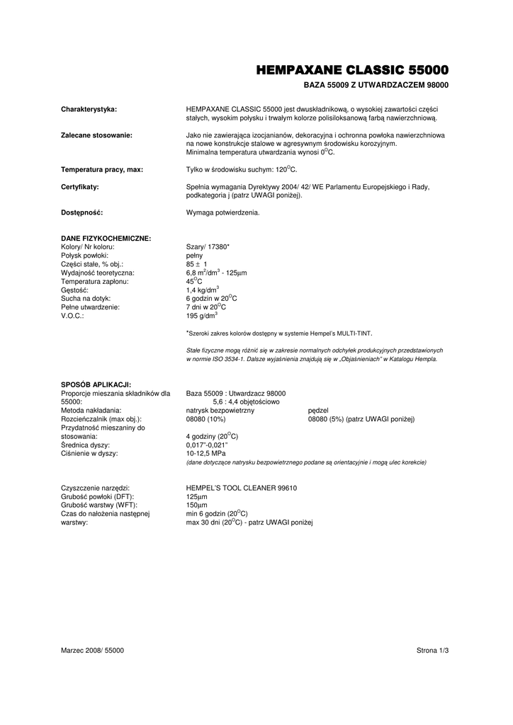 HEMPAXANE CLASSIC 55000 BAZA 55009 Z UTWARDZACZEM 98000 Charakterystyka: HEMPAXANE CLASSIC 55000 jest dwuskładnikową, o wysokiej zawartości części stałych, wysokim połysku i trwałym kolorze polisiloksanową farbą nawierzchniową. Zalecane stosowanie: Jako nie zawierająca izocjanianów, dekoracyjna i ochronna powłoka nawierzchniowa na nowe konstrukcje stalowe w agresywnym środowisku korozyjnym. Minimalna temperatura utwardzania wynosi 0OC. Temperatura pracy, max: Tylko w środowisku suchym: 120OC. Certyfikaty: Spełnia wymagania Dyrektywy 2004/ 42/ WE Parlamentu Europejskiego i Rady, podkategoria j (patrz UWAGI poniżej). Dostępność: Wymaga potwierdzenia. DANE FIZYKOCHEMICZNE: Kolory/ Nr koloru: Połysk powłoki: Części stałe, % obj.: Wydajność teoretyczna: Temperatura zapłonu: Gęstość: Sucha na dotyk: Pełne utwardzenie: V.O.C.: Szary/ 17380* pełny 85 ± 1 6,8 m2/dm3 - 125µm 45OC 1,4 kg/dm3 6 godzin w 20OC 7 dni w 20OC 195 g/dm3 *Szeroki zakres kolorów dostępny w systemie Hempel’s MULTI-TINT. Stałe fizyczne mogą różnić się w zakresie normalnych odchyłek produkcyjnych przedstawionych w normie ISO 3534-1. Dalsze wyjaśnienia znajdują się w „Objaśnieniach” w Katalogu Hempla. SPOSÓB APLIKACJI: Proporcje mieszania składników dla 55000: Metoda nakładania: Rozcieńczalnik (max obj.): Przydatność mieszaniny do stosowania: Średnica dyszy: Ciśnienie w dyszy: Baza 55009 : Utwardzacz 98000 5,6 : 4,4 objętościowo natrysk bezpowietrzny 08080 (10%) pędzel 08080 (5%) (patrz UWAGI poniżej) 4 godziny (20OC) 0,017”-0,021” 10-12,5 MPa (dane dotyczące natrysku bezpowietrznego podane są orientacyjnie i mogą ulec korekcie) Czyszczenie narzędzi: Grubość powłoki (DFT): Grubość warstwy (WFT): Czas do nałożenia następnej warstwy: Marzec 2008/ 55000 HEMPEL’S TOOL CLEANER 99610 125µm 150µm min 6 godzin (20OC) max 30 dni (20OC) - patrz UWAGI poniżej Strona 1/3 2. HEMPAXANE CLASSIC 55000 WARUNKI APLIKACJI I UTWARDZANIA: POWŁOKA POPRZEDNIA: POWŁOKA NASTĘPNA: Powierzchnia musi być całkowicie czysta i sucha o temperaturze wyższej od temperatury punktu rosy, aby uniknąć kondensacji. Minimalna temperatura utwardzania wynosi 0OC, minimalna wilgotność względna 30%. W przestrzeniach zamkniętych zapewnić odpowiednią wentylację podczas nakładania i wysychania powłok. Farby typu HEMPADUR lub GALVOSIL zgodnie ze specyfikacją. Nie stosuje się. UWAGI: V.O.C – lotne związki organiczne – Dyrektywa 2004/ 42/ WE Parlamentu Europejskiego i Rady: V.O.C – lotne związki organiczne: Bez rozcieńczenia Po rozcieńczeniu 10% obj. rozcieńczalnika 225 290 V.O.C w g/dm3 Maksymalna zawartość lotnych związków organicznych (V.O.C) Od 01.01.2007 (faza I) Od 01.01.2010 (faza II) 550 500 Zawartość lotnych związków organicznych dla innych kolorów – patrz Karta Charakterystyki Preparatu Niebezpiecznego. Kolory: W przypadku ekspozycji w środowisku zawierającym chlorki, kolory żółty i czerwony nie zawierające ołowiu mogą ulegać przebarwieniu. Kolory zawierające ołów, mogą ulec przebarwieniu po ekspozycji w środowisku zawierającym siarczki. Temperatury pracy: W temperaturach pracy powyżej 100OC, powłoka może ulec lekkiemu przebarwieniu. Grubość powłoki: W zależności od przeznaczenia można specyfikować inne grubości niż podano. Zmieni to zużycie farby i może wpłynąć na czas schnięcia i czas do nałożenia kolejnej warstwy. Stosowany zakres grubości powłoki wynosi 100-125µm. W przypadku aplikacji natryskiem w niższych grubościach, aby zapewnić prawidłowe tworzenie się powłoki, konieczne będzie większe rozcieńczenie farby. Aby zmniejszyć kontrast pomiędzy powłoką poprzednią a następną, zwrócić uwagę na kolor poprzedniej powłoki. Nakładanie kolejnych warstw na powłoki typu HEMPADUR: Czas do nakładania kolejnej warstwy w zależności od późniejszych warunków ekspozycji (HEMPAXANE CLASSIC 55000 o grubość powłoki 150µm): Minimum Maximum Temperatura podłoża 20OC 20OC Kolejna warstwa Korozyjność atmosfery Korozyjność atmosfery 55000 Rozcieńczalnik: Ekspozycja w wilgotnych warunkach: Nakładanie kolejnych warstw: Nakładanie na krzemian cynku: Marzec 2008/ 55000 Niska Średnia Silna Niska Średnia Silna 6h 6h 7h 30 d 30 d 30 d Generalnie zaleca się użyć THINNER 08080. Alternatywnie, w zależności od lokalnych warunków można użyć THINNER 08510. Po osiągnięciu stopnia wyschnięcia „sucha na dotyk” HEMPAXANE CLASSIC 55000 będzie odporne na kondensację wilgoci i lekkie zraszanie wodą. Jeżeli przekroczony zostanie czas do nakładania kolejnej warstwy, konieczne jest szorstkowanie powierzchni celem zapewnienia przyczepności międzywarstwowej. Zaleca się nakładać HEMPAXANE CLASSIC 55000 stosując technikę „mist coat”: na powierzchnię nakłada się cienką warstwę nie rozcieńczonej farby, a po kilku minutach kolejną warstwę kolejną warstwę, w pełnej specyfikowanej grubości. Jeżeli temperatura farby jest niższa niż 20OC, konieczne może być rozcieńczenie (max 15%). Strona 2/3 Uwaga: HEMPAXANE CLASSIC 55000 jest przeznaczony tylko do użytku profesjonalnego. Warunki BHP: Stosować z zachowaniem środków ostrożności. Opakowania są dostarczane z odpowiednimi oznaczeniami bezpieczeństwa, których należy przestrzegać. Stosować się do zaleceń zawartych w Kartach Charakterystyki Niebezpiecznej Substancji Chemicznej oraz przestrzegać polskich przepisów bezpieczeństwa. Nie wdychać, unikać kontaktu ze skórą i oczami, nie połykać. Zachować środki ostrożności z uwagi na możliwość wystąpienia ryzyka zaprószenia ognia lub wybuchu, oraz chronić środowisko. Nakładać tylko w dobrze wentylowanych pomieszczeniach. Niniejsza karta katalogowa zastępuje poprzednio wydaną. Definicje i pojęcia wyjaśnione są w Objaśnieniach w katalogu. Dane, specyfikacje oraz zalecenia ujęte w niniejszej karcie katalogowej są wynikiem testów i doświ