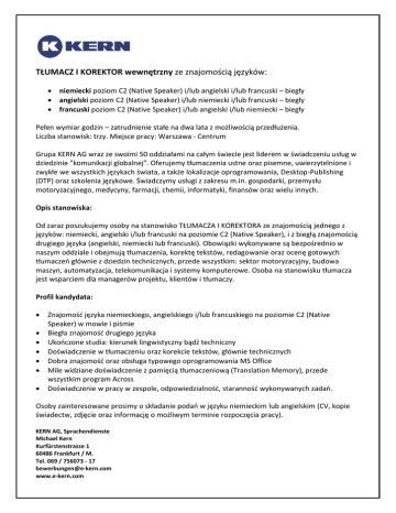 TŁUMACZ I KOREKTOR wewnętrzny ze znajomością języków: niemiecki poziom C2 (Native Speaker) i/lub angielski i/lub francuski – biegły angielski poziom C2 (Native Speaker) i/lub niemiecki i/lub francuski – biegły francuski poziom C2 (Native Speaker) i/lub angielski i/lub niemiecki – biegły Pełen wymiar godzin – zatrudnienie stałe na dwa lata z możliwością przedłużenia. Liczba stanowisk: trzy. Miejsce pracy: Warszawa - Centrum Grupa KERN AG wraz ze swoimi 50 oddziałami na całym świecie jest liderem w świadczeniu usług w dziedzinie "komunikacji globalnej". Oferujemy tłumaczenia ustne oraz pisemne, uwierzytelnione i zwykłe we wszystkich językach świata, a także lokalizacje oprogramowania, Desktop-Publishing (DTP) oraz szkolenia językowe. Świadczymy usługi z zakresu m.in. gospodarki, przemysłu motoryzacyjnego, medycyny, farmacji, chemii, informatyki, finansów oraz wielu innych. Opis stanowiska: Od zaraz poszukujemy osoby na stanowisko TŁUMACZA I KOREKTORA ze znajomością jednego z języków: niemiecki, angielski i/lub francuski na poziomie C2 (Native Speaker), i z biegłą znajomością drugiego języka (angielski, niemiecki lub francuski). Obowiązki wykonywane są bezpośrednio w naszym oddziale i obejmują tłumaczenia, korektę tekstów, redagowanie oraz ocenę gotowych tłumaczeń głównie z dziedzin technicznych, przede wszystkim: sektor motoryzacyjny, budowa maszyn, automatyzacja, telekomunikacja i systemy komputerowe. Osoba na stanowisku tłumacza jest wsparciem dla managerów projektu, klientów i tłumaczy. Profil kandydata: Znajomość języka niemieckiego, angielskiego i/lub francuskiego na poziomie C2 (Native Speaker) w mowie i piśmie Biegła znajomość drugiego języka Ukończone studia: kierunek lingwistyczny bądź techniczny Doświadczenie w tłumaczeniu oraz korekcie tekstów, głównie technicznych Dobra znajomość oraz obsługa typowego oprogramowania MS Office Mile widziane doświadczenie z pamięcią tłumaczeniową (Translation Memory), przede wszystkim program Across Doświadczenie w pracy w zespole, odpowiedzialność, staranność wykonywanych zadań. Osoby zainteresowane prosimy o składanie podań w języku niemieckim lub angielskim (CV, kopie świadectw, zdjęcie oraz informację o możliwym terminie rozpoczęcia pracy). KERN AG, Sprachendienste Michael Kern Kurfürstenstrasse 1 60486 Frankfurt / M. Tel. 069 / 756073 - 17 [email protected] www.e-kern.com