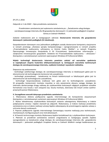 ZP.271.1.2016 Załącznik nr 1 do SIWZ – Opis przedmiotu zamówienia Przedmiotem zamówienia jest wykonanie zamówienia pn.: „Świadczenie usług dostępu szerokopasmowego Internetu dla 40 gospodarstw domowych i 11 jednostek podległych Urzędowi Gminy w Cedrach Wielkich. Zadanie realizowane jest w następującym zakresie: Dostarczenie Internetu dla gospodarstw domowych i jednostek podległych (51 lokalizacji). Gospodarstwom domowym oraz jednostkom podległym zostały dostarczone komputery stacjonarne w ramach przetargu „Dostawa sprzętu komputerowego i oprogramowania w ramach projektu „Przeciwdziałanie wykluczeniu cyfrowemu w Gminie Cedry Wielkie”, w ramach Programu Operacyjnego Innowacyjna Gospodarka 8 Oś Priorytetowa: Społeczeństwo informacyjne – zwiększenie innowacyjności gospodarki. Działanie 8.3 Przeciwdziałanie wykluczeniu – elnclusion.” (komputery z zainstalowanym systemem operacyjnym Windows 8 Professional 64bit). Wybór technologii dostarczenia Internetu powinien zależeć od warunków spełnienia w największym stopniu kryteriów efektywnościowych tj. istniejących warunków technicznych dostępu do szerokopasmowego Internetu, szybkości instalacji i wysokości nakładów. Dopuszcza się zastosowanie: - technologii satelitarnego dostępu do szerokopasmowego Internetu w lokalizacjach gdzie jest to ekonomicznie lub technologicznie konieczne lub uzasadnione, - technologii przewodowej - świadczonej na liniach telefonicznych w lokalizacjach gdzie jest to ekonomicznie lub technologicznie uzasadnione, - technologii bezprzewodowej (radiowa) tam gdzie jest to technologicznie uzasadnione. W przypadku konieczności montażu masztów w celu poszerzenia obszaru zasięgu dostępu do Internetu dostarczanego drogą radiową do użytkowników końcowych objętych projektem wszelkie formalności oraz koszty z tym związane (np. koszty montażu, dzierżawy lub innych umów cywilnoprawnych) ponosi Wykonawca. II. Szczegółowe warunki dotyczące przedmiotu zamówienia: 1. Wykonawca dokona podłączenia sygnału internetowego do komputerów stacjonarnych (komputery z zainstalowanym systemem operacyjnym Windows 8 Professional 64bit). 2. Wykaz teleadresowy użytkowników końcowych zostanie udostępniony Wykonawcy w trakcie podpisywania umowy i będzie stanowił jej załącznik. Wykonawca, w trakcie realizacji przedmiotu zamówienia oraz w trakcie realizacji umowy będzie zobowiązany do przestrzegania zapisów ustawy o ochronie danych osobowych. 3. Poprzez podłączenie sygnału internetowego Zamawiający rozumie realizację prac technicznych, montażowych, konfiguracyjnych oraz instruktażowych. 4. W kwestii technicznego montażu Wykonawca będzie kontaktował się z użytkownikiem końcowym. 5. Płatność za przedmiot zamówienia zostanie uregulowana w następujący sposób: Zapłata wynagrodzenia za świadczenie usługi dostępu do szerokopasmowego Internetu dla gospodarstw domowych i jednostek podległych Urzędowi Gminy w Cedrach Wielkich nastąpi każdorazowo po 1 ZP.271.1.2016 Załącznik nr 1 do SIWZ – Opis przedmiotu zamówienia zakończeniu każdego miesiąca kalendarzowego w terminie 30 dni od daty doręczenia prawidłowo wystawionej faktury Zamawiającemu. 6. Użytkownik końcowy i Zamawiający nie będzie podpisywał żadnej dodatkowej umowy z dostawcą sygnału internetowego. Realizacja tego zakresu usług będzie określała umowa pomiędzy Wykonawcą a Zamawiającym. 7. Wykonawca będzie realizował serwis wynikający z przedmiotu zamówienia do końca trwania rękojmi i gwarancji. III. Internet dla 40 gospodarstw domowych: Wymagania minimalne dotyczące dostarczania Internetu dla 40 szt. gospodarstw domowych 1 Usługa świadczenia przez 12 m-cy dostępu do publicznej sieci Internet (24 godziny na dobę, 7 dni w tygodniu) wraz z dostawą, instalacją oraz konfiguracją sprzętu wymaganego do realizacji usługi. Dostępność usługi na poziomie 99%. 2 Usługa dostępu do sieci publicznej Internet musi być zapewniona bez jakichkolwiek ograniczeń czasu dostępu. Oferowana usługa musi zapewniać nielimitowany transfer przesłanych bądź odebranych danych. 3 Dostęp do Internetu musi działać bezobsługowo, co oznacza, że po odłączeniu zasilania i ponownym jego podłączeniu urządzenia muszą być gotowe do pracy i umożliwiać realizację usługi korzystania z Internetu. Parametry techniczne 1 Przepustowość dostępu do sieci Internet musi spełniać parametry: - szybkość transmisji od komputera klienta: min. 4 Mbit/s. Instalacja 1 Wykonawca jest odpowiedzialny za doprowadzenie, uruchomienie i aktywację usługi. 2 W celu instalacji urządzeń przewodowych lub bezprzewodowych, Wykonawca musi samodzielnie uzyskać wymagane prawem pozwolenia w tym właściciela budynku i dokonać wymaganych prawem zgłoszeń oraz dokonać niezbędnych ustaleń technicznych w celu podłączenia łącza, o ile będą wymagane. Wykonawca zainstaluje w gospodarstwach domowych odpowiednie gniazda i dołączy kabel umożliwiający podłączenie komputera stacjonarnego do Internetu. Inne 1 Wykonawca jest zobowiązany dołączyć do oferty Regulamin świadczenia usług. 2 Wykonawca zobowiązany jest zapewnić Infolinię do zgłaszania usterek. Serwis i gwarancja 1 Dostępność telefoniczna do linii pomocy czynnej 7 dni w tygodniu 24 godziny na dobę. 2 Dostawca sygnału internetowego jest zobowiązany do usunięcia usterki w postaci braku sygnału internetowego bez względu na jego przyczynę u użytkownika końcowego w terminie 1 dnia roboczego od zgłoszenia. 3 Wymianę uszkodzonych lub wadliwych części odpowiadających za łącze internetowe Wykonawca dokona na koszt własny. Czas realizacji 1 dzień roboczy od chwili zgłoszenia uszkodzenia wymagającego naprawy. 4 Z każdej czynności serwisowania konieczny jest protokół potwierdzający wykonanie usługi podpisany przez użytkownika końcowego i Wykonawcy. 5 Zamawiający we własnym zakresie będzie dokonywał ko