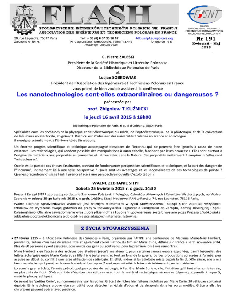 Członek EUROPEJSKIEJ FEDERACJI POLONIJNYCH STOWARZYSZEŃ NAUKOWO-TECHNICZNYCH 20, rue Legendre, 75017 Paris Założone w 1917r. Tel : + 33 (0) 6 07 30 96 97 Nr d’autorisation préfectorale: 79501-13.446 Redakcja : Janusz Ptak http://sitpf.europolonia.org fondée en 1917 Nr 191 Kwiecień – Maj 2015 C. Pierre ZALESKI Président de la Société Historique et Littéraire Polonaise Directeur de la Bibliothèque Polonaise de Paris et Lucjan SOBKOWIAK Président de l’Association des Ingénieurs et Techniciens Polonais en France vous prient de bien vouloir assister à la conférence Les nanotechnologies sont-elles extraordinaires ou dangereuses ? présentée par prof. Zbigniew T.KUŹNICKI le jeudi 16 avril 2015 à 19h00 Bibliothèque Polonaise de Paris, 6 quai d’Orléans, 75004 Paris Spécialiste dans les domaines de la physique et de l’électronique du solide, de l’optoélectronique, de la photonique et de la conversion de la lumière en électricité, Zbigniew T. Kuznicki est Professeur des universités titularisé en France et en Pologne. Il enseigne actuellement à l’Université de Strasbourg. Un énorme progrès scientifique et technique accompagné d’espaces de l'inconnu qui ne peuvent être ignorés à cause de notre existence. Les technologies, qui rendent possible des manipulations à nano échelle, fascinent par leurs prouesses. Elles sont surtout à l’origine de matériaux aux propriétés surprenantes et introuvables dans la Nature. Ces propriétés inciteraient à soupirer qu’elles sont "miraculeuses". Quelle est la part de ces choses fascinantes, ouvrant de foudroyantes perspectives scientifiques et techniques, et la part des dangers de l’"Inconnu", intimement lié à une telle perspective ? Quels sont les avantages et les inconvénients de ces technologies de pointe ? Quelles précautions d’usage faut-il prendre face à une perspective nouvelle d’exploitation ? WALNE ZEBRANIE SITPF Sobota 25 kwietnia 2015 r. o godz. 14:30 Prezes i Zarząd SITPF zapraszają serdecznie Szanowne Koleżanki i Kolegów, Członków Aktywnych i Członków Wspierających, na Walne Zebranie w sobotę 25-go kwietnia 2015 r. o godz. 14:30 w Stacji Naukowej PAN w Paryżu, 74, rue Lauriston, 75116 Paris. Walne Zebranie sprawozdawczo-wyborcze jest ważnym momentem w życiu Stowarzyszenia. Zarząd SITPF zaprasza wszystkich członków do wyrażania swojej gotowści do pracy w Stowarzyszeniu i zgłaszania kandydatur do Zarządu, Komisji Rewizyjnej i Sądu Koleżeńskiego. Oficjalne zawiadomienie wraz z porządkiem dnia i kuponem upoważnienia zostało wysłane przez Prezesa L.Sobkowiaka oddzielnie pocztą elektroniczną a do osób nie posiadających internetu, listownie. Z ŻYCIA STOWARZYSZENIA 27 février 2015 – à l’Académie Polonaise des Sciences à Paris, organisée par l’AITPF, une conférence de Madame Marie-Noël Himbert, journaliste, auteur d’un livre du même titre et également co-réalisatrice du film sur Marie Curie, diffusé sur France 2 le 11 novembre 2014. Plus de 60 personnes y ont assistées, pour moitié des gens qui sont venus pour la première fois à nos rencontres. Mme Himbert a eu l’accès à des archives peu étudiées jusqu’à maintenant, pour certaines jamais encore exploitées, parmi lesquelles des lettres échangées entre Marie Curie et sa fille Irène juste avant et tout au long de la guerre, ou des propositions adressées à l’armée, peu acquise au début du conflit à une large utilisation de radiologie. En effet, même si la radiologie existe depuis la fin du XIXe siècle, elle a mis beaucoup de temps à pénétrer le monde médical. Les rayons X sont une curiosité de foire mais intéressent peu les médecins. Lorsque la guerre éclate, l’armée prévoit quelques postes de radiologie, à l’arrière. Marie Curie a, elle, l’intuition qu’il faut aller sur le terrain, au plus près du front. D’où son idée d’équiper des voitures avec tout le matériel radiologique nécessaire (dynamo, appareils à rayon X, matériel photographique). Ce seront les “petites Curie”, surnommées ainsi par les poilus. Grâce à de riches bienfaiteurs mobilisés par Marie Curie, 20 véhicules sont ainsi équipés. Et la radiologie prouve vite son utilité pour détecter les éclats d’obus et de shrapnels dans les corps mutilés. Grâce à elle, les chirurgiens peuvent opérer avec précision. On apprend que Marie Curie a réalisé personnellement des centaines de radiographies de soldats blessés, en formant des relais en la personne de sa fille et des collaborateurs proches. Et avec la guerre qui semble interminable, elle a décidé d’ouvrir des écoles permettant l’apprentissage du maniement de l’équipement radiographique, ouvertes aux femmes d’ouvriers et de paysans. Marie Curie aurait ainsi contribué à sauver plus de 1 million de vies pendant la guerre. Tekst francuski : Krystyna Liziard Marie Curie była kobietą nieuchwytną i zamkniętą. Jej działalność często potajemna w czasie pierwszej wojny światowej przedstawia Jej nową twarz nieznaną tej tak już sławnej osoby. W sierpniu 1914 roku, Marie Curie jest sama. Jej odkrycia i dwa Noble są już za Nią. To co przedsięweźmie w czasie 4-ch lat trwającej wojny na linii frontu, blisko rannych wzywa Ją spowrotem do życia. Bilans jej pracy: 20 samochodȯw radiologicznych na froncie, ponad 200 stanowisk stałych w szpitalach, 180 operatorek radio wykształconych w Jej szkole. Ponad jeden million żołnierzy otrzymało pomoc przez Jej instalacje radiologiczne, a 1000 otrzymało pomoc przez Nią samą. Tekst polski: Lucjan Sobkowiak 25 marzec 2015 – w Polskiej Akademii Nauk w Paryżu, odbyła się, zorganizowana przez SITPF we współpracy z PAN, konferencja mgr inż. Elżbiety JEZIERSKIEJ-ZIEMKIEWICZ i mgr inż. Andrzeja ZIEMKIEWICZA pt. „Polska myśl w rozwoju komputerów”. Należy podkreślić, że Państwo Ziemkiewiczowie ukończyli sekcję Maszyn Matematycznych 