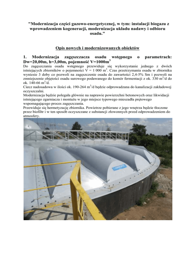 "Modernizacja części gazowo-energetycznej, w tym: instalacji biogazu z wprowadzeniem kogeneracji, modernizacja układu nadawy i odbioru osadu." Opis nowych i modernizowanych obiektów 1. Modernizacja zagęszczacza osadu wstępnego Dw=20,00m, h=3,00m, pojemność V=1000m3 o parametrach: Do zagęszczania osadu wstępnego przewiduje się wykorzystanie jednego z dwóch istniejących zbiorników o pojemności V = 1 000 m3. Czas przetrzymania osadu w zbiorniku wyniesie 3 doby co pozwoli na zagęszczenie osadu do zawartości 2,4-5% Sm i pozwoli na zmniejszenie objętości osadu surowego podawanego do komór fermentacji z ok. 330 m3/d do ok. 140-66 m3/d. Ciecz nadosadowa w ilości ok. 190-264 m3/d będzie odprowadzana do kanalizacji zakładowej oczyszczalni. Modernizacja będzie polegała głównie na naprawie powierzchni betonowych oraz likwidacji istniejącego zgarniacza i montażu w jego miejsce typowego mieszadła prętowego wspomagającego proces zagęszczania. Przewiduje się hermetyzację zbiornika. Powietrze pobierane z jego wnętrza będzie tłoczone przez biofiltr i w ten sposób oczyszczane z substancji złowonnych przed odprowadzeniem do atmosfery. 2. Budowa zbiornika osadu zagęszczonego zmieszanego o parametrach: Dw=8,50m, h1=4,70 m Do magazynowania osadu zmieszanego zagęszczonego przewiduje się budowę zbiornika pełniącego rolę zbiornika nadawy osadu przed podaniem go do WKF-u. Przewiduje się zbiornik żelbetowy w rzucie kołowy o średnicy 8,5m. W zbiorniku magazynowany będzie osad o następujących parametrach: Ilość osadu zmieszanego zagęszczonego Q = 215 m3/d Sucha masa SM = 6 300 kg/d Uwodnienie w = 97,1 % Średnica zbiornika D = 8,5m Wysokość czynna H = 4,2 m Pojemność czynna zbiornika Vcz = 238 m3 Czas magazynowania osadu w zbiornikach t = 1,1 doby W zbiorniku tym przewidziano montaż mieszadła o parametrach: ilość 1szt. moc 5,8 kW. Do ewakuacji mieszadła przewidziano żurawik z wciągarką ręczną o udźwigu do 250kg. Zbiornik wyposażony będzie w czujnik pomiaru poziomu osadu w zbiorniku oraz przelew awaryjny do kanalizacji zakładowej. 3. Modernizacja zbiornika odgazowania osadu o parametrach: Dw=20,0m, h=3,00m, pojemność V=1000m3 Do odgazowania osadu przefermentowanego i jednocześnie do pełnienia funkcji zbiornika nadawy na prasę do odwadniania osadu przewiduje się wykorzystanie drugiego z istniejących zbiorników o pojemności V = 1 000 m3. Objętość zbiornika pozwala na przetrzymanie osadu przefermentowanego do 5 dni. Pełna objętość zbiornika będzie wykorzystywana tylko w przypadku awarii prasy. W trakcie normalnej eksploatacji czas odgazowania osadu nie powinien być dłuższy od 1 doby. Modernizacja będzie polegała głównie na naprawie powierzchni betonowych oraz likwidacji istniejącego zgarniacza i montażu mieszadła szybkoobrotowego utrzymującego osad w zawieszeniu. Przewiduje się hermetyzację zbiornika. Powietrze pobierane z jego wnętrza będzie tłoczone przez biofiltr i w ten sposób oczyszczane z substancji złowonnych przed odprowadzeniem do atmosfery. 4. Instalacja dezodoryzacji powietrza dla obiektów: zagęszczacz osadu wstępnego, zbiornik osadu zmieszanego, zbiornik odgazowania osadu Zakłada się neutralizację powietrza odciąganego z obiektów potencjalnie stanowiących największe zagrożenie emisji złowonnych: • Zagęszczacz osadu wstępnego, • Zbiornik osadu zmieszanego • Zbiornik odgazowania osadu przefermentowanego Oczyszczanie powietrza będzie odbywało się na biofiltrze wyposażonym w złoże czynne wiążące związki odoroczynne, dokąd powietrze będzie tłoczone systemem wentylatorów z każdego w.w. obiektu Biofiltr będzie wyposażony w sondę kontrolującą odczyn odcieków ze złoża, wraz z układem korekty odczynu i dozowania pożywki. Odbiór powietrza do biofiltra będzie posiadać regulację przepustnicami oraz odpowiednią izolację termiczną. 5. Wymienniki pompowni II st. ciepła rurowe o mocy 480kW i modernizacja Modernizacja istniejącego węzła fermentacji osadów obejmuje swoim zakresem wymianę istniejącej instalacji (rurociągi, armatura oraz wymienniki ciepła) przewidzianej dla obsługi komór fermentacyjnych na instalacji: • Doprowadzenia osadu surowego, • Cyrkulacji osadu, • Spustu osadu przefermentowanego, • Odprowadzenia cieczy nadosadowej, znajdujących się w budynku wielofunkcyjnym i pompowni II stopnia. Zakresem modernizacji jest również objęta wymiana wymienników ciepła i agregatów pompowych.. Jako wymienniki ciepła proponuje się zastosować 2 wymienniki rurowe o mocy po 480kW każdy pracujące w układzie 1 wymiennik na 1 WKF. Dodatkowo zakłada się 1 wymiennik rezerwowy Dobór wymienników przeprowadzono przy następujących założeniach: Dobowa ilość osadu surowego: 215 m3/d, Dobowa ilość osadu recyrkulowanego 220,0m3/h Ilość wymienników 2 szt. + 1 szt. Minimalna temperatura osadu 60C Temperatura osadu w WKF 370C Czynnik grzewczy woda 85/700C Czas pracy wymiennika 24h/d Przyjęto wymienniki rurowe o mocy 480 kW Ciepło na potrzeby podgrzewania osadu w komorach doprowadzane będzie z projektowanego agregatu ko generacyjnego lub awaryjnie z istniejącej kotłowni. Dodatkowo przewiduje się zastosowanie wymiennika ciepła osad/osad, który będzie przekazywał ciepło osadu odprowadzanego z WKF osadowi surowemu doprowadzanemu do WKF. Czynnikiem grzewczym będzie w tym przypadku osad o temperaturze. 370C Zakłada się wymianę istniejących rurociągów i armatury zaporowej w pompowni II stopnia. Węzeł ten po modernizacji będzie umożliwiał: • Przesłanie osadu z osadników wstępnych do grawitacyjnego zagęszczacza osadu • Odbiór zagęszczonego osadu wstępnego i podanie go do zbiornika osadu zmieszanego • Przesłanie osadu nadmiernego po homogenizatorze do zbiornika osadu zmieszanego • Podanie osadu zmieszanego zagęszczonego do WKFz • Odbiór osadu przefermentowanego z WKFz do zbiornika odgazowania • Odbiór osadu