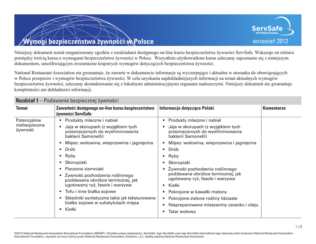 Wymogi bezpieczeństwa żywności w Polsce wrzesień 2012 Niniejszy dokument został zorganizowany zgodnie z rozdziałami dostępnego on-line kursu bezpieczeństwa żywności ServSafe. Wskazuje on różnice pomiędzy treścią kursu a wymogami bezpieczeństwa żywności w Polsce. Wszystkim użytkownikom kursu zalecamy zapoznanie się z niniejszym dokumentem, umożliwiającym zrozumienie krajowych wymogów dotyczących bezpieczeństwa żywności. National Restaurant Association nie gwarantuje, że zawarte w dokumencie informacje są wyczerpujące i aktualne w stosunku do obowiązujących w Polsce przepisów i wymogów bezpieczeństwa żywności. W celu uzyskania najdokładniejszych informacji na temat aktualnych wymogów bezpieczeństwa żywności, zalecamy skontaktowanie się z lokalnymi administracyjnymi organami nadzorczymi. Niniejszy dokument nie gwarantuje kompletności ani dokładności informacji. Rozdział 1 – Podawanie bezpiecznej żywności Temat Potencjalnie niebezpieczna żywność Zawartość dostępnego on-line kursu bezpieczeństwo żywności ServSafe • Produkty mleczne i nabiał • Jaja w skorupach (z wyjątkiem tych przeznaczonych do wyeliminowania bakterii Samonelli) • Mięso: wołowina, wieprzowina i jagnięcina • Drób • Ryby • Skorupiaki • Pieczone ziemniaki •Żywność pochodzenia roślinnego poddawana obróbce termicznej, jak ugotowany ryż, fasole i warzywa • Tofu i inne białka sojowe • Składniki syntetyczne takie jak teksturowane białko sojowe w substytutach mięsa • Kiełki Informacje dotyczące Polski Komentarze • Produkty mleczne i nabiał • Jaja w skorupach (z wyjątkiem tych przeznaczonych do wyeliminowania bakterii Samonelli) • Mięso: wołowina, wieprzowina i jagnięcina • Drób • Ryby • Skorupiaki •Żywność pochodzenia roślinnego poddawana obróbce termicznej, jak ugotowany ryż, fasole i warzywa • Kiełki • Pokrojone w kawałki melony • Pokrojone zielone rośliny liściaste • Niepreparowane mieszaniny czosnku i oleju • Tatar wołowy 1z6 ©2012 National Restaurant Association Educational Foundation (NRAEF). Wszelkie prawa zastrzeżone. ServSafe, logo ServSafe oraz logo ServSafe International logo stanowią znaki towarowe National Restaurant Association Educational Foundation, używane na mocy licencji przez National Restaurant Association Solutions, LLC, spółkę zależną National Restaurant Association. Rozdział 1 – Podawanie bezpiecznej żywności dalszy Temat Zawartość dostępnego on-line kursu bezpieczeństwo żywności ServSafe • • • • Informacje dotyczące Polski Komentarze Pokrojone w kawałki melony Pokrojone pomidory Pokrojone zielone rośliny liściaste Niepreparowane mieszaniny czosnku i olej Rozdział 3 – Bezpieczny pracownik obchodzący się z żywnością Wymagania dotyczące czasu mycia rąk Cały proces mycia rąk powinien trwać co najmniej 20 sekund. Brak szczególnych wymagań Dobrą praktyką jest mycie rąk przez 20-30 sekund. Korzystanie ze szczotki do paznokci Nie w trakcie Brak szczególnych wymagań W przypadku korzystania ze szczotki do paznokci dobrą praktyką jest przechowywanie jej w roztworze odkażającym. Zamienniki rękawic lateksowych Nie w trakcie Dozwolone są zamienniki rękawic lateksowych takie jak rękawice z tworzywa sztucznego lub winylu. Dotykanie gołymi rękoma żywności gotowej do spożycia Niektóre administracyjne organy nadzorcze Dotykanie gołymi rękoma żywności gotowej do zezwalają na dotykanie żywności gotowej do spożycia jest dozwolone. spożycia gołymi rękoma. Jeżeli prawo lokalne na to zezwala, należy zastosować specjalną polityką w firmie dotyczącą zdrowia pracowników. Należy również przeszkolić personel w myciu rąk i praktykach higieny osobistej. 2z6 ©2012 National Restaurant Association Educational Foundation (NRAEF). Wszelkie prawa zastrzeżone. ServSafe, logo ServSafe oraz logo ServSafe International logo stanowią znaki towarowe National Restaurant Association Educational Foundation, używane na mocy licencji przez National Restaurant Association Solutions, LLC, spółkę zależną National Restaurant Association. Rozdział 3 – Bezpieczny pracownik obchodzący się z żywnością dalszy Temat Zawartość dostępnego on-line kursu bezpieczeństwo żywności ServSafe Informacje dotyczące Polski Komentarze Pielęgnacja ran Rany należy owinąć czystym bandażem i zastosować plaster lub rękawiczkę w celu ochrony zabandażowanej rany. Brak szczególnych wymagań Dobrą praktyką jest korzystanie z wodoodpornych bandaży razem z plastrem lub rękawiczką ochronną. Zaleca się również (choć nie jest to konieczne) stosowanie opantrunków w kolorze niebieskim. Dobra praktyką jest zasłanianie brody i innych rodzajów zarostu na twarzy maseczką. Broda i Nie w trakcie owłosienie twarzy Brak szczególnych wymagań Rozdział 4 – Łańcuch żywnościowy: Wprowadzenie Wprowadzenie W branży gastronomicznej najczęściej stosuje się trzy rodzaje termometrów — termometry bimetaliczne z sondą, termometry termoparowe i termistory. Brak szczególnych wymagań Nie powinno się stosować termometrów szklanych oraz rtęciowych (Hg). 3z6 ©2012 National Restaurant Association Educational Foundation (NRAEF). Wszelkie prawa zastrzeżone. ServSafe, logo ServSafe oraz logo ServSafe International logo stanowią znaki towarowe National Restaurant Association Educational Foundation, używane na mocy licencji przez National Restaurant Association Solutions, LLC, spółkę zależną National Restaurant Association. Rozdział 5 – Łańcuch żywnościowy: Zakup, odbiór i przechowywanie Temat Zawartość dostępnego on-line kursu bezpieczeństwo żywności ServSafe Temperatury dostawy dla zimnej żywności Zimna potencjalnie niebezpieczna żywność - o Brak szczególnych wymagań ile nie zostało zaznaczone inaczej - powinna być dostarczana w temperaturze 7°C lub niższej. Drób powinien być dostarczany w temp
