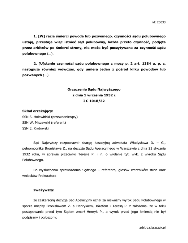 id: 20033 1. [W] razie śmierci powoda lub pozwanego, czynności sądu polubownego ustają, przestaje więc istnieć sąd polubowny, każda przeto czynność, podjęta przez arbitrów po śmierci strony, nie może być poczytywana za czynność sądu polubownego (…). 2. [U]stanie czynności sądu polubownego z mocy p. 2 art. 1384 u. p. c. następuje również wówczas, gdy umiera jeden z pośród kilku powodów lub pozwanych (…). Orzeczenie Sądu Najwyższego z dnia 1 września 1932 r. I C 1018/32 Skład orzekający: SSN S. Holewiński (przewodniczący) SSN W. Miszewski (referent) SSN E. Krotowski Sąd Najwyższy rozpoznawał skargę kasacyjną adwokata Władysława D. – G., pełnomocnika Bronisława Z., na decyzję Sądu Apelacyjnego w Warszawie z dnia 21 stycznia 1932 roku, w sprawie przeciwko Teresie P. i in. o wydanie tyt. wyk. z wyroku Sądu Polubownego. Po wysłuchaniu sprawozdania Sędziego – referenta, głosów rzeczników stron oraz wniosków Prokuratora zważywszy: że zaskarżoną decyzją Sąd Apelacyjny uznał za nieważny wyrok Sądu Polubownego w sporze między Bronisławem Z. a Henrykiem, Józefem i Teresą P. z założenia, że w toku postępowania przed tym Sądem zmarł Henryk P., a wyrok przed jego śmiercią nie był podpisany i ogłoszony; arbitraz.laszczuk.pl że w skardze kasacyjnej Bronisław Z. wnosi o uchylenie decyzji Sądu Apelacyjnego z powodu obrazy przepisów proceduralnych; że ustalone przez Sąd Apelacyjny okoliczności faktyczne usprawiedliwiają unieważnienie wyroku Sądu Polubownego, w myśl bowiem p. 2 art. 1384 U. P. C., w razie śmierci powoda lub pozwanego, czynności sądu polubownego ustają, przestaje więc istnieć Sąd Polubowny, każda przeto czynność, podjęta przez arbitrów po śmierci strony, nie może być poczytywana za czynność sądu polubownego, a zatem i wydany później wyrok nie może uzyskać sankcji sądu państwowego; że ustanie czynności sądu polubownego z mocy p. 2 art. 1384 U. P. C. następuje również wówczas, gdy umiera jeden z pośród kilku powodów lub pozwanych, wynika to bowiem z treści powyższego przepisu, który nie czyni na ten przypadek wyjątku, wobec czego wywody skargi kasacyjnej na temat podzielności wyroku Sądu Polubownego nie podważają decyzji Sądu Apelacyjnego; że twierdzenie skargi kasacyjnej, jakoby wyrok Sądu Polubownego wydany został przed śmiercią Henryka P., jako sprzeczne z ustaleniem Sądu Apelacyjnego i dotyczące strony faktycznej sporu, nie może być uwzględnione (art. 11 U. P. C.); że również nie jest słuszny zarzut, jakoby Sąd Apelacyjny przeinaczył treść pisma superarbitra, przeinaczenia bowiem tego pisma w zaskarżonej decyzji dopatrzeć się nie można; że wreszcie podniesione przez skarżącego zarzuty, dotyczące braku legitymacji Marji P. do zaskarżenia wyroku Sądu Polubownego, słusznie pominięte zostały przez Sąd Apelacyjny, gdyż nie mogły mieć wpływu na wynik sporu; z tych zasad Sąd Najwyższy skargę kasacyjną oddala. Źródło: OSN(C) 1932, z. 2, poz. 176 arbitraz.laszczuk.pl