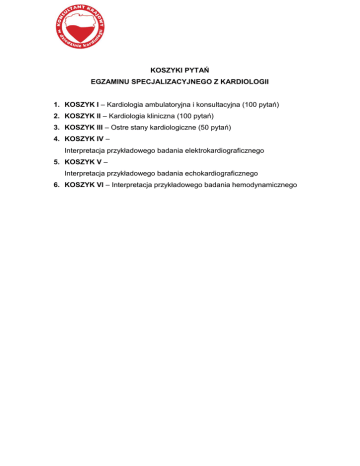 KOSZYKI PYTAŃ EGZAMINU SPECJALIZACYJNEGO Z KARDIOLOGII 1. KOSZYK I – Kardiologia ambulatoryjna i konsultacyjna (100 pytań) 2. KOSZYK II – Kardiologia kliniczna (100 pytań) 3. KOSZYK III – Ostre stany kardiologiczne (50 pytań) 4. KOSZYK IV – Interpretacja przykładowego badania elektrokardiograficznego 5. KOSZYK V – Interpretacja przykładowego badania echokardiograficznego 6. KOSZYK VI – Interpretacja przykładowego badania hemodynamicznego KOSZYK I – Kardiologia ambulatoryjna i konsultacyjna 1. Wskazania i ograniczenia tomografii komputerowej serca. 2. Wskazania i ograniczenia rezonansu magnetycznego w kardiologii. 3. Nieinwazyjne metody oceny funkcji lewej komory serca. 4. Nagły zgon sercowy w przebiegu kardiomiopatii przerostowej – stratyfikacja ryzyka. 5. Nieinwazyjna diagnostyka wrodzonych anomalii tętnic wieńcowych. 6. Miejsce badań izotopowych we współczesnej diagnostyce kardiologicznej. 7. Pozytronowa tomografia emisyjna (PET) w kardiologii – zasady. wykonywania, wskazania, potencjalne miejsce w diagnostyce. 8. Algorytmy diagnostyczne w podejrzeniu zatorowości płucnej. 9. Wskazania do echokardiografii przezprzełykowej. 10. Echokardiografia obciążeniowa – rodzaje, wskazania diagnostyczne, zasady przeprowadzenia badania. 11. Nowe rodzaje badań i technologii echokardiograficznych (echokardiografia tkankowa, kontrastowa, 3D). 12. Diagnostyka zaburzeń oddychania w czasie snu u pacjenta z chorobą układu sercowo-naczyniowego. 13. Diagnostyka skurczowej niewydolności serca. 14. Diagnostyka rozkurczowej niewydolności serca. 15. Nieinwazyjne metody oceny zmian miażdżycowych w tętnicach obwodowych. 16. Wskazania i przeciwwskazania do wykonywania elektrokardiograficznej próby wysiłkowej, rodzaje protokołów badawczych. 17. Ocena czynności nerek u pacjenta z chorobą układu sercowo-naczyniowego. 18. Ergospirometria – miejsce w standardach diagnostycznych. 19. Elektrokardiograficzna próba wysiłkowa - na ile można na niej polegać? 20. Wskazania do rejestracji EKG metodą Holtera. 21. Diagnostyka zaburzeń rytmu serca – przydatność metod nieinwazyjnych. 22. Ambulatoryjne monitorowanie ciśnienia tętniczego – wskazania, interpretacja wyników. 23. Test pochyleniowy – miejsce w diagnostyce kardiologicznej, zasady wykonywania. 24. Przetrwałe uniesienie odcinka ST w zapisie EKG – diagnostyka różnicowa. 25. Przydatność badań nieinwazyjnych w stratyfikacji ryzyka w stabilnej chorobie wieńcowej. 26. Nieinwazyjne metody oceny funkcji prawej komory serca. 27. Ocena zaawansowania niedomykalności zastawki aortalnej przy użyciu metod nieinwazyjnych. 28. Ocena zaawansowania niedomykalności zastawki mitralnej przy użyciu metod nieinwazyjnych. 29. Ocena zaawansowania niedomykalności zastawki trójdzielnej przy użyciu metod nieinwazyjnych. 30. Ocena istotności zwężenia zastawki aortalnej przy użyciu metod nieinwazyjnych. 31. Różnicowanie przyczyn duszności. 32. Infekcyjne zapalenie wsierdzia – badania nieinwazyjne dla potwierdzenia rozpoznania. 33. Zastosowanie metod nieinwazyjnych w stratyfikacji ryzyka po zawale serca. 34. Miejsce testów funkcji płytek krwi w kardiologii inwazyjnej – zakrzepica w stencie i powikłania krwotoczne. 35. Badania nieinwazyjne, które mają wpływ na postępowanie z chorym ze zwężeniem zastawki mitralnej. 36. Przydatność badań nieinwazyjnych w ocenie wad wrodzonych serca u dorosłych. 37. Chory po przebytym TIA – jakie badania nieinwazyjne zaplanujesz? 38. Jakie badania nieinwazyjne zaplanujesz u chorego po nagłym zatrzymaniu krążenia? 39. Metody oceny przerostu lewej komory serca. 40. Algorytmy diagnostyczne we wtórnym nadciśnieniu tętniczym. 41. Nieinwazyjne metody stosowane w diagnostyce omdleń. 42. Metody nieinwazyjnego monitorowania leczenia przewlekłej niewydolności serca. 43. Diagnostyka nieinwazyjna zapalenia osierdzia – dalsze implikacje terapeutyczne. 44. Jakie badania nieinwazyjne są potrzebne do kwalifikacji chorego do TAVI? 45. Elektrokardiograficzne i echokardiograficzne wskazania do terapii resynchronizującej. 46. Badania obrazowe w ocenie ryzyka sercowo-naczyniowego. 47. Wskazania i metody oceny żywotności miokardium. 48. Nieinwazyjne metody oceny drożności pomostów aortalno-wieńcowych. 49. Jesteś pierwszym lekarzem, który stwierdza szmer nad sercem pacjenta – co możesz zróżnicować sam, a do czego potrzebne są badania nieinwazyjne? 50. Wskazania i metody nieinwazyjnej oceny naczyń obwodowych. 51. Klasyfikacja i epidemiologia czynników ryzyka chorób sercowo-naczyniowych. 52. Rola aktywności fizycznej w prewencji chorób sercowo-naczyniowych. 53. Lipidogram – interpretacja, pożądane normy lipidogramu w różnych grupach pacjentów. 54. Peptydy natriuretyczne – rola w diagnostyce kardiologicznej. 55. Rodzaje, zastosowanie i ocena parametrów zapalnych w kardiologii. 56. Dyslipidemia aterogenna – rozpoznawanie, zasady postępowania. 57. Hipercholesterolemia rodzinna, wielogenowa, wtórna – definicje, zasady postępowania. 58. Farmakologiczne leczenie poprawiające rokowanie w stabilnej chorobie wieńcowej. 59. Farmakologiczne leczenie poprawiające jakość życia w stabilnej chorobie wieńcowej. 60. Dławica naczynioskurczowa – patogeneza, obraz kliniczny, rozpoznanie, leczenie. 61. Kardiologiczny zespół X – patogeneza, obraz kliniczny, leczenie, rokowanie. 62. Gorączka reumatyczna – patogeneza, rozpoznanie, leczenie, powikłania. 63. Diagnostyka i postępowanie w podejrzeniu zapalenia mięśnia sercowego. 64. Kardiomiopatia rozstrzeniowa – definicja, patogeneza, obraz kliniczny, postępowanie. 65. Kardiomiopatia przerostowa – definicja, patogeneza, obraz kliniczny, postępowanie. 66. Konsultacja kardiologiczna u chorego z wadą serca przygotowywanego do operacji pozasercowej. 67. Przygotowanie do operacji pozasercowej – czy i jak korygować farmakoterapię w celu zmniejszenia ryzyka powikłań sercowo-naczyniowych?