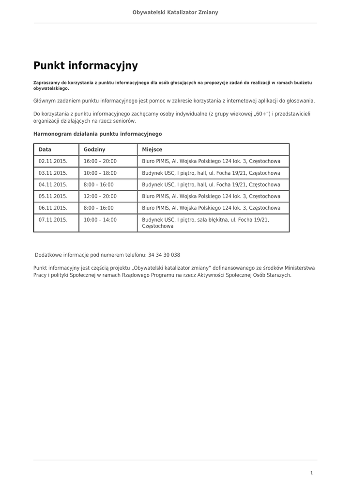 Obywatelski Katalizator Zmiany Punkt informacyjny Zapraszamy do korzystania z punktu informacyjnego dla osób głosujących na propozycje zadań do realizacji w ramach budżetu obywatelskiego. Głównym zadaniem punktu informacyjnego jest pomoc w zakresie korzystania z internetowej aplikacji do głosowania. Do korzystania z punktu informacyjnego zachęcamy osoby indywidualne (z grupy wiekowej „60+”) i przedstawicieli organizacji działających na rzecz seniorów. Harmonogram działania punktu informacyjnego Data Godziny Miejsce 02.11.2015. 16:00 – 20:00 Biuro PIMIS, Al. Wojska Polskiego 124 lok. 3, Częstochowa 03.11.2015. 10:00 – 18:00 Budynek USC, I piętro, hall, ul. Focha 19/21, Częstochowa 04.11.2015. 8:00 – 16:00 Budynek USC, I piętro, hall, ul. Focha 19/21, Częstochowa 05.11.2015. 12:00 – 20:00 Biuro PIMIS, Al. Wojska Polskiego 124 lok. 3, Częstochowa 06.11.2015. 8:00 – 16:00 Biuro PIMIS, Al. Wojska Polskiego 124 lok. 3, Częstochowa 07.11.2015. 10:00 – 14:00 Budynek USC, I piętro, sala błękitna, ul. Focha 19/21, Częstochowa Dodatkowe informacje pod numerem telefonu: 34 34 30 038 Punkt informacyjny jest częścią projektu „Obywatelski katalizator zmiany” dofinansowanego ze środków Ministerstwa Pracy i polityki Społecznej w ramach Rządowego Programu na rzecz Aktywności Społecznej Osób Starszych. 1