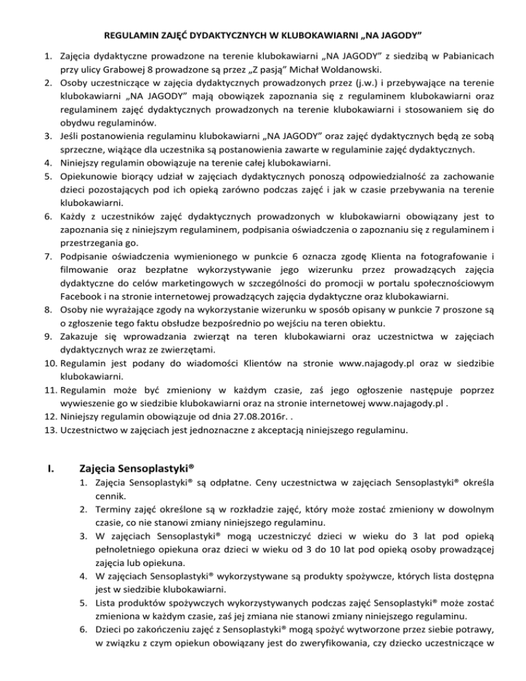REGULAMIN ZAJĘĆ DYDAKTYCZNYCH W KLUBOKAWIARNI „NA JAGODY” 1. Zajęcia dydaktyczne prowadzone na terenie klubokawiarni „NA JAGODY” z siedzibą w Pabianicach przy ulicy Grabowej 8 prowadzone są przez „Z pasją” Michał Woldanowski. 2. Osoby uczestniczące w zajęcia dydaktycznych prowadzonych przez (j.w.) i przebywające na terenie klubokawiarni „NA JAGODY” mają obowiązek zapoznania się z regulaminem klubokawiarni oraz regulaminem zajęć dydaktycznych prowadzonych na terenie klubokawiarni i stosowaniem się do obydwu regulaminów. 3. Jeśli postanowienia regulaminu klubokawiarni „NA JAGODY” oraz zajęć dydaktycznych będą ze sobą sprzeczne, wiążące dla uczestnika są postanowienia zawarte w regulaminie zajęć dydaktycznych. 4. Niniejszy regulamin obowiązuje na terenie całej klubokawiarni. 5. Opiekunowie biorący udział w zajęciach dydaktycznych ponoszą odpowiedzialność za zachowanie dzieci pozostających pod ich opieką zarówno podczas zajęć i jak w czasie przebywania na terenie klubokawiarni. 6. Każdy z uczestników zajęć dydaktycznych prowadzonych w klubokawiarni obowiązany jest to zapoznania się z niniejszym regulaminem, podpisania oświadczenia o zapoznaniu się z regulaminem i przestrzegania go. 7. Podpisanie oświadczenia wymienionego w punkcie 6 oznacza zgodę Klienta na fotografowanie i filmowanie oraz bezpłatne wykorzystywanie jego wizerunku przez prowadzących zajęcia dydaktyczne do celów marketingowych w szczególności do promocji w portalu społecznościowym Facebook i na stronie internetowej prowadzących zajęcia dydaktyczne oraz klubokawiarni. 8. Osoby nie wyrażające zgody na wykorzystanie wizerunku w sposób opisany w punkcie 7 proszone są o zgłoszenie tego faktu obsłudze bezpośrednio po wejściu na teren obiektu. 9. Zakazuje się wprowadzania zwierząt na teren klubokawiarni oraz uczestnictwa w zajęciach dydaktycznych wraz ze zwierzętami. 10. Regulamin jest podany do wiadomości Klientów na stronie www.najagody.pl oraz w siedzibie klubokawiarni. 11. Regulamin może być zmieniony w każdym czasie, zaś jego ogłoszenie następuje poprzez wywieszenie go w siedzibie klubokawiarni oraz na stronie internetowej www.najagody.pl . 12. Niniejszy regulamin obowiązuje od dnia 27.08.2016r. . 13. Uczestnictwo w zajęciach jest jednoznaczne z akceptacją niniejszego regulaminu. I. Zajęcia Sensoplastyki® 1. Zajęcia Sensoplastyki® są odpłatne. Ceny uczestnictwa w zajęciach Sensoplastyki® określa cennik. 2. Terminy zajęć określone są w rozkładzie zajęć, który może zostać zmieniony w dowolnym czasie, co nie stanowi zmiany niniejszego regulaminu. 3. W zajęciach Sensoplastyki® mogą uczestniczyć dzieci w wieku do 3 lat pod opieką pełnoletniego opiekuna oraz dzieci w wieku od 3 do 10 lat pod opieką osoby prowadzącej zajęcia lub opiekuna. 4. W zajęciach Sensoplastyki® wykorzystywane są produkty spożywcze, których lista dostępna jest w siedzibie klubokawiarni. 5. Lista produktów spożywczych wykorzystywanych podczas zajęć Sensoplastyki® może zostać zmieniona w każdym czasie, zaś jej zmiana nie stanowi zmiany niniejszego regulaminu. 6. Dzieci po zakończeniu zajęć z Sensoplastyki® mogą spożyć wytworzone przez siebie potrawy, w związku z czym opiekun obowiązany jest do zweryfikowania, czy dziecko uczestniczące w zajęciach Sensoplastyki® nie jest uczulone, na którykolwiek ze składników wykorzystywanych podczas zajęć. 7. Jeśli Dziecko uczestniczące w zajęciach jest uczulone na którykolwiek z produktów używanych podczas zajęć Sensoplastyki®, Opiekun obowiązany jest poinformować o tym fakcie niezwłocznie personel prowadzący zajęcia. 8. Osoba prowadząca zajęcia nie przewija dzieci uczestniczących w zajęciach. 9. Dzieci pozostawione na zajęciach pod opieką personelu muszą mieć na ręce umieszczoną opaskę zawierającą imię i nazwisko dziecka, nazwisko opiekuna oraz numer telefonu pod którym opiekun będzie dostępny. 10. Po zakończeniu zajęć, dzieci pozostające pod opieką personelu klubokawiarni zostaną przekazane pod opiekę jedynie opiekuna, który oddał dziecko pod opiekę personelu klubokawiarni lub pod opiekę osoby przez niego pisemnie wskazanej. 11. Przed wejściem na zajęcia dziecko oraz towarzyszący mu opiekun obowiązani są do zdjęcia odzieży wierzchniej oraz zmiany obuwia lub skorzystania z ochraniaczy jednorazowych, które można zakupić u personelu klubokawiarni. 12. Przed wejściem do Sali zajęć, w której odbywają się zajęcia opiekunowie obowiązani są do odebrania Dziecku wszelkich przedmiotów mogących stanowić zagrożenie dla dziecka i jego otocznia w trakcie zajęć. W szczególności dziecko nie może posiadać zegarka, telefonu komórkowego, biżuterii, pasków i szelek z ostrymi krawędziami, ostrych przedmiotów, naszyjników, bransoletek. 13. W trakcie zajęć dziecko nie może nosić okularów chyba, że personel prowadzący zajęcia wyrazi na to zgodę. 14. W trosce o zdrowie naszych najmłodszych Klientów, zabrania się przebywania w klubokawiarni dzieci lub dorosłych będących nosicielami chorób zakaźnych, infekcji wirusowych i bakteryjnych. 15. Obowiązkiem opiekunów jest poinformowanie personelu prowadzącego zajęcia o schorzeniach i niesprawnościach dziecka, np. alergie, astma, epilepsja, zaburzenia słuchu itp. 16. W przypadku jakichkolwiek zdarzeń losowych lub wypadków w klubokawiarni, w których zostanie pokrzywdzone dziecko bądź opiekun, należy ten fakt zgłosić personelowi w formie pisemnej przed opuszczeniem sali zabaw. 17. Personel prowadzący zajęcia może odmówić przyjęcia dzieci, które sprawiają problemy wychowawcze i stanowią zagrożenie dla innych dzieci. 18. Jeśli Dziecko będzie zachowywać się w sposób agresywny i przeszkadzać w prowadzonych zajęciach innym uczestnikom, personel może skrócić czas pobytu bez zwrotu kosztów. II. Zajęcia sensoryczne 1. Zajęcia sens
