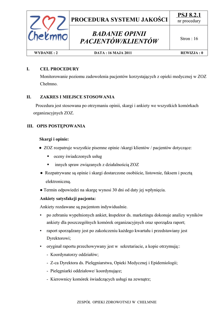 PROCEDURA SYSTEMU JAKOŚCI PSJ 8.2.1 nr procedury BADANIE OPINII PACJENTÓW/KLIENTÓW WYDANIE : 2 I. DATA : 16 MAJA 2011 Stron : 16 REWIZJA : 0 CEL PROCEDURY Monitorowanie poziomu zadowolenia pacjentów korzystających z opieki medycznej w ZOZ Chełmno. II. ZAKRES I MIEJSCE STOSOWANIA Procedura jest stosowana po otrzymaniu opinii, skargi i ankiety we wszystkich komórkach organizacyjnych ZOZ. III. OPIS POSTĘPOWANIA Skargi i opinie: ● ZOZ rozpatruje wszystkie pisemne opinie /skargi klientów / pacjentów dotyczące: § oceny świadczonych usług § innych spraw związanych z działalnością ZOZ ● Rozpatrywane są opinie i skargi dostarczone osobiście, listownie, faksem i pocztą elektroniczną. ● Termin odpowiedzi na skargę wynosi 30 dni od daty jej wpłynięcia. Ankiety satysfakcji pacjenta: Ankiety rozdawane są pacjentom indywidualnie. ▪ po zebraniu wypełnionych ankiet, inspektor ds. marketingu dokonuje analizy wyników ankiety dla poszczególnych komórek organizacyjnych oraz sporządza raport; ▪ raport sporządzany jest po zakończeniu każdego kwartału i przedstawiany jest Dyrektorowi; ▪ oryginał raportu przechowywany jest w sekretariacie, a kopie otrzymują:: - Koordynatorzy oddziałów; - Z-ca Dyrektora ds. Pielęgniarstwa, Opieki Medycznej i Epidemiologii; - Pielęgniarki oddziałowe/ koordynujące; - Kierownicy komórek świadczących usługi na zewnątrz; ZESPÓŁ OPIEKI ZDROWOTNEJ W CHEŁMNIE PROCEDURA SYSTEMU JAKOŚCI PSJ 8.2.1 nr procedury BADANIE OPINII PACJENTÓW/KLIENTÓW WYDANIE : 2 ▪ DATA : 16 MAJA 2011 Stron : 16 REWIZJA : 0 wyniki i analiza ankiet omawiane są na zebraniu lekarskim i pielęgniarskim zwoływanym przez Dyrektora; ▪ w oparciu o opinie ankietowanych pacjentów Zespół ds Systemu Zarządzania Jakością wypracowuje harmonogram działań naprawczych, który podlega dalszej modyfikacji w toku prac; ▪ Ankiety przekazywane są do archiwum. Ankiety satysfakcji pacjenta – strona internetowa ▪ ankiety znajdują się na stronie internetowej ZOZ (www.zoz.chelmno.pl); ▪ pacjenci / klienci mogą wypełnić ankiety po wejściu na stronę internetową; ▪ wypełnione ankiety wpływają na skrzynkę mailową Inspektora ds. Marketingu; ▪ po zebraniu wypełnionych ankiet, inspektor ds. marketingu dokonuje analizy wyników ankiety dla poszczególnych komórek organizacyjnych oraz sporządza raport; ▪ raport sporządzany jest po zakończeniu każdego kwartału i przedstawiany jest Dyrektorowi; ▪ wyniki i analiza ankiet omawiane są na zebraniu lekarskim i pielęgniarskim zwoływanym przez Dyrektora; ▪ Ankiety przekazywane są do archiwum. IV. MIARA I KRYTERIA REALIZACJI / SKUTECZNOŚCI PROCEDURY ▪ 100 % terminowo udzielonych odpowiedzi na skargi ▪ 80% wypełnionych ankiet ▪ Próg satysfakcji: - 80% pozytywnie wypełnionych ankiet (odpowiedzi bardzo dobrze i dobrze) - 80% pozytywnie wypełnionych ankiet (pytanie 1 – odpowiedzi do 30 minut; do 1 godziny) V. FORMA DOKUMENTOWANIA Forma pisemna – Segregator Opinie / Skargi Pacjentów / Klientów ZESPÓŁ OPIEKI ZDROWOTNEJ W CHEŁMNIE PROCEDURA SYSTEMU JAKOŚCI BADANIE OPINII PACJENTÓW/KLIENTÓW WYDANIE : 2 DATA : 16 MAJA 2011 Raporty badania satysfakcji pacjenta VI. MIEJSCE I OKRES ARCHIWIZOWANIA ankiety – 3 lat raporty – 3 lat VI. ZAŁĄCZNIKI Załącznik 1. Ankiety satysfakcji pacjenta Załącznik 2. Ankiety satysfakcji pacjenta – strona internetowa Załącznik 3. Tabela zmian ZESPÓŁ OPIEKI ZDROWOTNEJ W CHEŁMNIE PSJ 8.2.1 nr procedury Stron : 16 REWIZJA : 0