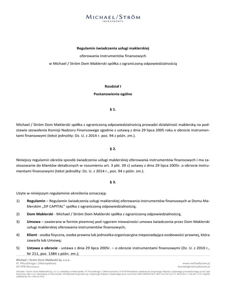 Regulamin świadczenia usługi maklerskiej oferowania instrumentów finansowych w Michael / Ström Dom Maklerski spółka z ograniczoną odpowiedzialnością Rozdział I Postanowienia ogólne § 1. Michael / Ström Dom Maklerski spółka z ograniczoną odpowiedzialnością prowadzi działalność maklerską na podstawie zezwolenia Komisji Nadzoru Finansowego zgodnie z ustawą z dnia 29 lipca 2005 roku o obrocie instrumentami finansowymi (tekst jednolity: Dz. U. z 2014 r. poz. 94 z późn. zm.). § 2. Niniejszy regulamin określa sposób świadczenia usługi maklerskiej oferowania instrumentów finansowych i ma zastosowanie do klientów detalicznych w rozumieniu art. 3 pkt. 39 c) ustawy z dnia 29 lipca 2005r. o obrocie instrumentami finansowymi (tekst jednolity: Dz. U. z 2014 r., poz. 94 z późn. zm.). § 3. Użyte w niniejszym regulaminie określenia oznaczają: 1) Regulamin – Regulamin świadczenia usługi maklerskiej oferowania instrumentów finansowych w Domu Maklerskim „DF CAPITAL” spółka z ograniczoną odpowiedzialnością; 2) Dom Maklerski - Michael / Ström Dom Maklerski spółka z ograniczoną odpowiedzialnością; 3) Umowa – zawierana w formie pisemnej pod rygorem nieważności umowa świadczenia przez Dom Maklerski usługi maklerskiej oferowania instrumentów finansowych; 4) Klient - osoba fizyczna, osoba prawna lub jednostka organizacyjna nieposiadająca osobowości prawnej, która zawarła lub Umowę; 5) Ustawa o obrocie - ustawa z dnia 29 lipca 2005r. – o obrocie instrumentami finansowymi (Dz. U. z 2010 r., Nr 211, poz. 1384 z późn. zm.); 6) Ustawa o ofercie - ustawa z dn. 29 lipca 2005 r. o ofercie publicznej i warunkach wprowadzania instrumentów finansowych do zorganizowanego systemu obrotu oraz o spółkach publicznych (tekst jednolity: Dz. U. nr 185/2009 poz.1439 z późn. zm.); 7) Papiery wartościowe – papiery wartościowe w rozumieniu Ustawy o obrocie, w szczególności akcje, prawa poboru prawa do akcji, warranty subskrypcyjne, kwity depozytowe, obligacje, listy zastawne, certyfikaty inwestycyjne; 8) Instrumenty finansowe niebędące papierami wartościowymi – w rozumieniu Ustawy o obrocie, w szczególności: instrumenty rynku pieniężnego, opcje, kontrakty terminowe; 9) Instrumenty finansowe – w rozumieniu Ustawy o obrocie 10) Wprowadzający – właściciel papierów wartościowych dokonujący oferty publicznej; 11) Podmiot wystawiający - podmiot wystawiający we własnym imieniu Instrumenty finansowe niebędące papierami wartościowymi i uprawniony lub zobowiązany z tych instrumentów; 12) Siła wyższa - zdarzenie zewnętrzne, którego nie można było przewidzieć ani zapobiec przy aktualnym stanie wiedzy, w szczególności: wojna, ataki terrorystyczne, strajki, które uniemożliwiają lub znacząco utrudniają wykonanie przez Dom Maklerski Umowy. § 4. 1. Dom Maklerski świadczy usługi maklerskie na podstawie Regulaminu oraz Umowy zawieranej z Klientem. 2. Dom Maklerski może świadczyć na rzecz Klienta usługi maklerskie inne niż wskazane w Regulaminie na warunkach określonych w odrębnej umowie z Klientem lub w odrębnych regulaminach dla świadczonych usług, o ile są one zgodne z obowiązującymi przepisami prawa. 3. Dom Maklerski nie świadczy na rzecz Klienta usługi doradztwa inwestycyjnego w rozumieniu art. 69 ust. 2 pkt. 5 Ustawy o obrocie. 4. Dom Maklerski nie świadczy innych usług niż wskazane w Regulaminie, w szczególności nie świadczy usług doradztwa prawnego, podatkowego bądź z zakresu rachunkowości. 5. Zobowiązania Domu Maklerskiego nie obejmują również doradztwa w zakresie sprawozdań finansowych ani obowiązku weryfikacji sprawozdań finansowych Klienta lub innych dokumentów przedstawianych przez Klienta lub osoby trzecie w związku z wykonaniem Umowy, zarówno w zakresie dotyczącym ich poprawności merytorycznej, jak i prawdziwości. Rozdział II Tryb i warunki zawierania Umowy § 5. 1. W celu zawarcia Umowy przez osobę fizyczną przedkłada ona do wglądu Domowi Maklerskiemu dokument tożsamości oraz informuje o posiadanym przez siebie Numerze Identyfikacji Podatkowej (NIP), numerze PESEL oraz nazwie i adresie właściwego urzędu skarbowego. 2. Osoba prawna lub jednostka organizacyjna nieposiadająca osobowości prawnej, zamierzająca zawrzeć Umowę, zobowiązana jest przedłożyć Domowi Maklerskiemu do wglądu: 1) 2) 3) dokumenty tożsamości osób uprawnionych do reprezentacji, wypis z odpowiedniego rejestru lub zaświadczenie o wpisie do ewidencji działalności gospodarczej, zaświadczenia o nadaniu numeru statystycznego REGON i NIP, 4) inne dokumenty urzędowe, potwierdzające fakt utworzenia osoby prawnej lub jednostki organizacyjnej nieposiadającej osobowości prawnej, zgodnie z obowiązującymi w tym względzie przepisami prawa, świadczące również o siedzibie i adresie, składzie osób uprawnionych do reprezentacji oraz sposobie reprezentacji danego podmiotu. 3. Dom Maklerski może uzależnić zawarcie Umowy od uprzedniego złożenia do wglądu w Domu Maklerskim również innych dokumentów, niż wskazane w ust. 1-2. 4. Umowy oraz aneksy do Umów, zawierane są pod rygorem nieważności w formie pisemnej. § 6. Zawarcie Umowy możliwe jest także w trybie korespondencyjnym, do czego wystarcza wymiana egzemplarzy Umowy, z których każdy jest podpisany przez jedną ze stron. Datą zawarcia Umowy jest w takim przypadku data podpisania Umowy przez tą ze stron, która składa podpisy na Umowie po uprzednim podpisaniu jej przez drugą stronę. Rozdział III Tryb, warunki i forma ustanawiania pełnomocnictw przez Klienta § 7. 1. Umowa może być zawarta za pośrednictwem pełnomocnika. 2. Pełnomocnictwo do zawarcia Umowy powinno być złożone w Domu Maklerskim. 3. Pełnomocnictwo powinno być udzielone, co najmniej w formie pisemnej z podpisami poświadczonymi notarialnie, chyba, że zostało ono podpisane w obecności uprawnionego pracownika Domu Maklerskiego. § 8. 1. Klient mo