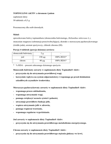 TOPINULIN® AKTIV z chromem i jodem suplement diety 50 tabletek a 0,5 g Przeznaczony dla osób dorosłych. Skład: sproszkowane bulwy topinamburu (słonecznika bulwiastego, Helianthus tuberosus L.), stearynian magnezu (substancja przeciwzbrylająca), ekstrakt z morszczynu pęcherzykowatego (źródło jodu), aromat spożywczy, chlorek chromu (III). Porcja 4 tabletek (porcja dzienna) zawiera: słonecznik bulwiasty 2g - jod 150 µg 100% RDA* chrom 40 µg 100% RDA* * % RDA – procent zalecanego dziennego spożycia Słonecznik bulwiasty zawarty w suplemencie diety Topinulin® Aktiv: - przyczynia się do utrzymania prawidłowej wagi, - korzystnie wpływa na system odpornościowy i wspomaga go przed działaniem szkodliwych czynników środowiska. Morszczyn pęcherzykowaty zawarty w suplemencie diety Topinulin® Aktiv: - wspomaga proces odchudzania, - wspomaga utrzymanie wagi, - pomaga zwiększyć uczucie sytości i pełności, - utrzymuje prawidłowe funkcje jelit, - wspiera utrzymanie jelit w zdrowiu, - pomaga wspierać trawienie, - wspomaga regularne wypróżnianie. Jod zawarty w suplemencie diety Topinulin® Aktiv: - przyczynia się do utrzymania prawidłowego metabolizmu energetycznego. Chrom zawarty w suplemencie diety Topinulin® Aktiv: - przyczynia się do utrzymania prawidłowego stężenia glukozy we krwi, - przyczynia się do utrzymania prawidłowego metabolizmu makroskładników odżywczych. Dla utrzymania prawidłowego stanu zdrowia należy stosować zrównoważony sposób żywienia i prowadzić zdrowy tryb życia. Sposób użycia Zaleca się przyjmowanie 1 raz dziennie 4 tabletki przed jedzeniem popijając małą ilością płynu. Zaleca się 2-3 cykle po 20-30 dni. Odstęp między cyklami 2 tygodnie. Ostrzeżenia Nie przekraczać zalecanej porcji do spożycia w ciągu dnia. Suplement diety nie może być stosowany jako substytut zróżnicowanej diety. W okresie ciąży i karmienia decyzję o stosowaniu powinno się konsultować z lekarzem. Warunki przechowywania Przechowywać w temperaturze pokojowej, w sposób niedostępny dla małych dzieci. Chronić przed dostępem światła i wilgoci. Najlepiej spożyć przed końcem Data minimalnej trwałości na spodzie opakowania. Producent Zakład Chemiczno-Farmaceutyczny „FARMAPOL” Sp. z o.o.; ul. Św. Wojciech 29; 61-749 Poznań Nr partii:/ Najlepiej spożyć przed końcem: Kod kreskowy 5907573301129