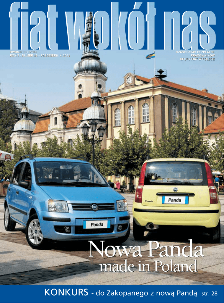 DWUMIESI¢CZNIK ROK 7 - NUMER 46 – PA È D Z I E R N I K 2 0 0 3 CZASOPISMO BEZP¸ATNE PRACOWNIKÓW GRUPY FIAT W POLSCE Nowa Panda made in Poland KONKURS - do Zakopanego z nowà Pandà str. 28 Foldery, czasopisma, druk reklam Wydawnictwa techniczne i informacyjne Fotografia, projektowanie graficzne Us∏ugi PR Studio DTP, naÊwietlanie, druk SATIZ POLAND: TWÓJ PRZEWODNIK W BIZNESIE Pe∏na gama us∏ug w zakresie komunikacji: od pomys∏u do zarzàdzania, od realizacji do dystrybucji. Satiz Poland Sp. z o.o. - ul. 11 Listopada 60/62, 43-300 Bielsko-Bia∏a Tel. +48 33 8132761 - Fax +48 33 8134176 - www.satiz.pl - e-mail: [email protected] Nowa Panda na Rynku w Pszczynie, fot. A. Kubik w numerze fiat wokół nas rok 7 – numer 46 – październik 2003 Wydawca: Projekt wydawniczy: Dyrektor Wydawniczy: Fiat Auto Poland 43-300 Bielsko-Biała Ul. Grażyńskiego 141 Tel. 033/8132775 Fax 033/8134176 Satiz Poland Sp. z o.o. Enrico Pavoni Redaktor Naczelny: Jerzy Piekarczyk Z-ca Redaktora Naczelnego: Francesco Novo Odpowiedzialny za edycję w Grupie Fiat: Biuro reklamy: Opracowanie, skanowanie, skład i przygotowanie do druku: Dyrektor Artystyczny: Druk: Nakład: Redakcja: Sekretariat: e-mail: 4 O tym się mówi 6 Ze świata Fiata 8 18 21 26 Chwila refleksji: Zygmunt Konieczny Prezentacja nowej Pandy mediom Drzwi Otwarte nowej Pandy Wszystko o nowej Pandzie dla sieci sprzedaży 10 28 30 34 36 46 Ettore Gregoriani Adam Gębuś tel.: 033/813 27 61 Satiz Poland Bielsko-Biała 32 Maciej Feodorów 50 Dimograf Bielsko-Biała 13 000 egz. 52 Satiz Poland ul. 11 Listopada 60/62, 43-300 Bielsko-Biała Filippo Gallino Mirosława Malich Tomasz Libich Gabriela Kolonko [email protected] 53 54 56 58 Szkoła odlewnictwa w Teksidzie Podróże: Motocyklem nad Morze Czarne (cz. I) Kino: Śmiej się pan z tego! Książki: Dla bibliofila i smakosza Internet: Świadectwa wojny czy mistyfikacja? Osobliwości: Życie na Księżycu? Cennik 48 38 Przedstawiamy: nowy Fiat Panda Konkurs: Majówka z nową Pandą Nowa Alfa 166 we Frankfurcie CNH na wystawach Iveco Stralis jeżdżą w Pekaesie Kwietnik: Róże z jesiennych liści Ekonomia: Ile kosztuje słabe państwo? Jaka będzie pogoda? O tym się mówi Cztery Asy Fiata fot. I. Kaźmierczak W jubileuszowej 10. edycji międzynarodowego wyścigu „4 Asy Fiata Auto Poland” udział wzięło 45 kolarzy. Poza sześcioma ekipami z Polski, star towały w nim drużyny z Ukrainy, Rosji i Turcji. Wyścig, trwający od 25-29 sierpnia br., składał się z pięciu etapów na drogach Śląska, Podbeskidzia i Małopolski. Zwycięzca wyścigu, Wojciech Pawlak z drużyny Mikomax Łódź, otrzymał na mecie w Tychach Fiata Seicento – nagrodę głównego sponsora, Fiata Auto Poland. Kluczyki do samochodu wręczył mu dyrektor zakładu w Tychach, Zdzisław Arlet. 14 września br., zakończył się w Karpaczu 60. Tour de Pologne. Fiat, jak co roku, był głównym sponsorem imprezy. W zamian za wyłączne prawo do żółtej koszulki lidera, firma użyczyła na wyścig m. in. 35 samochodów osobowych i 10 dostawczych. Fiat Auto Poland miał także możliwość zareklamowania podczas Tour de Pologne nowego Fiata Pandę. Kolumna dziesięciu aut jechała przed kolarzami nadając z głośników spoty reklamowe o samochodzie i zapraszając na odbywające się w tym czasie, Drzwi Otwar te nowego Fiata Panda. Zwycięzcy wyścigu, Cezaremu Zamanie, zawodnikowi polskiej grupy zawodowej Action nVidia Mróz, klucze do nowego Fiata Punto, wręczył dyrektor handlowy FAP – Fabrice D’Arche. Nowa Panda w Internecie Wraz z kampanią reklamową wprowadzającą na rynek nowego Fiata Panda, powstał również serwis internetowy modelu. Cieszy się dużym zainteresowaniem – do połowy września odwiedziło go już ponad 300 tys. internautów. Witryna Pandy prezentuje możliwości samochodu, wyposażenie i cennik. Nowy model Fiata wspierają również szeroko zakrojone działania promocyjne w Internecie, m. in. w komunikatorze Gadu Gadu oraz w por talach Tlen i Onet. pl. Jednocześnie w nowej witrynie rozpoczął się konkurs „Panda na biurko”. Każdy z użytkowników serwisu może skorzystać ze specjalnej aplikacji, umożliwiającej zaprojektowanie własnej wersji Pandy. Najciekawsze zgłoszenia zostaną nagrodzone. Adres: www.fiatpanda.pl 4 fot. G. Madaliński 60. Tour de Pologne Alfa Romeo 8C Competizione Alfa Romeo we Frankfurcie zaprezentowała „8c Competizione”, prototypowy model przywołujący nazwą wielką spor tową tradycję Alfy Romeo. Skrót „8c” w latach 30. i 40. wyróżniał samochody (wyścigowe i użytkowe) wyposażone w ośmiocylindrowy silnik skonstruowany przez słynnego projektanta, Vittorio Jano. Kolejny człon nazwy „Competizione”, stanowi ukłon w stronę 6C 2500 Competizione, spor towego modelu coupé, prowadzonego w 1950 roku przez parę pilotów Fangio – Zanardi w wyścigu „Tysiąc Mil”. Przednia część dwuosobowego wozu z włókna węglowego nawiązuje do legendarnego modelu 33 Coupé Stradale, tylna – powraca do charakterystycznych okrągłych zespołów świateł znanych z Giulii TZ. Pod maską pracuje silnik o pojemności 4,2 litra, ośmiu cylindrach w kształcie litery V (90°), z turbodoładowaniem. Ten system napędowy osiąga ponad 400 KM przy 7.000 obrotach/min, połączony jest z ręczną sześciobiegową skrzynią biegów i rozwija maksymalną prędkość ponad 300 km/h, a rozpędza się od 0 do 100 km/h w 4,5s. fot. M. Kowalski Festiwal pod patronatem Jubilata VIII Festiwal Kompozytorów Polskich, odbywający się w Bielsku-Białej od 2-4 października br., zbiegł się w tym roku z 70. urodzinami Henryka Mikołaja Góreckiego, światowej sławy kompozytora, który od początku patronuje imprezie. Trudno się dziwić, że tegoroczny festiwal w dużej mierze poświęcony był jubilatowi. Henryk Mikołaj Górecki, któremu nadano tytuł honorowego obywatela miasta, swoje urodziny obchodził właśnie podczas festiwalu. Koncert finałowy z