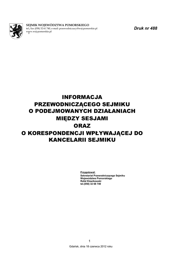 SEJMIK WOJEWÓDZTWA POMORSKIEGO tel./fax (058) 32 61 740, e-mail: [email protected] www.woj-pomorskie.pl Druk nr 488 l INFORMACJA PRZEWODNICZĄCEGO SEJMIKU O PODEJMOWANYCH DZIAŁANIACH MIĘDZY SESJAMI ORAZ O KORESPONDENCJI WPŁYWAJĄCEJ DO KANCELARII SEJMIKU Przygotował: Sekretariat Przewodniczącego Sejmiku Województwa Pomorskiego Rafał Klawikowski tel.(058) 32 68 740 1 Gdańsk, dnia 18 czerwca 2012 roku INFORMACJA PRZEWODNICZĄCEGO SEJMIKU O PODEJMOWANYCH DZIAŁANIACH MIĘDZY SESJAMI 22 maja Przewodniczący Sejmiku Województwa Pomorskiego Jan Kleinszmidt na zaproszenie Marszałka Województwa Pomorskiego Mieczysława Struka wziął udział w konferencji poświęconej realizacji projektu „Pomorskie dobry kurs. Turystyczna Kampania Promocyjna Województwa Pomorskiego”, która odbyła się w siedzibie Urzędu Marszałkowskiego Województwa Pomorskiego w Sali im. L. Bądkowskiego. 22 maja Przewodniczący Sejmiku Województwa Pomorskiego Jan Kleinszmidt na zaproszenie Przewodniczącego Rady Miasta Gdańska Bogdana Oleszka wziął udział w uroczystej sesji z okazji wręczenia Medali Św. Wojciecha i Księcia Mściwoja II, która odbyła się w Dworzec Artusa w Gdańsku. 25 maja Radny Hubert Lewna reprezentował Sejmik Województwa Pomorskiego w X Festiwalu Nauki – Gdańsk – Miasto Zabytek, który odbył się przed Dworem Artusa w Gdańsku, gdzie przedstawiono go, jako pamiątkę historii, symbol kultury oraz ukazano jego rolę w upowszechnianiu kultury historycznej. 27 maja Przewodniczący Sejmiku Województwa Pomorskiego Jan Kleinszmidt na zaproszenie Prezesa Zarządu Wojewódzkiego Polskiego Stronnictwa Ludowego Województwa Pomorskiego Krzysztofa Trawickiego wziął udział w Wojewódzkim Święcie Ludowym, które odbyło się w Dębnicy Kaszubskiej. 29 maja Przewodniczący Sejmiku Województwa Pomorskiego Jan Kleinszmidt na zaproszenie Pomorskiej Rady Przedsiębiorczości i Kapituły Gospodarczej Nagrody Pomorskiej 2012 wziął udział w uroczystej gali finałowej Konkursu, która odbyła się w Dworze Artusa w Gdańsku, gdzie miało miejsce wręczenie statuetek „Gryfa Gospodarczego 2012” oraz wyróŜnień nagrodzonym przedsiębiorstwom 2 W dniach 29 – 31 maja Radny Jerzy Barzowski reprezentował Sejmik Województwa Pomorskiego w III edycji Ogólnopolskiego Kongresu Regionów pod hasłem „Samorząd – Inwestycje – Rozwój”, który odbył się w Świdnicy. W kongresie wzięli udział przedstawiciele samorządów, biznesu, administracji publicznej oraz Unii Europejskiej, a takŜe ekspertów, naukowców i dziennikarzy. W trakcie kongresu odbyło się kilkadziesiąt paneli dyskusyjnych i sesji plenarnych. Kongresowi towarzyszyły liczne imprezy towarzyszące oraz wystawa, podczas której firmy z całego kraju zaprezentowały swoją ofertę dla jednostek samorządu terytorialnego. Wręczone zostały równieŜ nagrody w prestiŜowych rankingach samorządowych, organizowanych przez tygodnik „Newsweek Polska”, miesięcznik „Forbes”, miesięcznik „Komputer Świat”, tygodnik „Auto Świat” oraz Związek Powiatów Polskich. W dniach 29 maja – 1 czerwca Radna Maria Kuczyńska reprezentowała Sejmik Województwa Pomorskiego w Ansbach, Wurzburgu oraz Norymbergii, gdzie uczestniczyła w finisaŜu Trójstronnej wystawy malarstwa i rzeźby Regionu Limousin, Okręgu Środkowej Frankonii i Województwa Pomorskiego. 30 maja Radny Jacek Bendykowski reprezentował Sejmik Województwa Pomorskiego w posiedzeniu Zarządu Związku Województw Rzeczypospolitej Polskiej, który odbył się w Ministerstwie Gospodarki. W ramach posiedzenia została zorganizowana konferencja, która była podsumowaniem i pokłosiem wizyty studyjnej w Stanach Zjednoczonych, złoŜonej przez marszałków pięciu województw (kujawsko-pomorskiego, lubelskiego, mazowieckiego, pomorskiego i warmińsko-mazurskiego) w kwietniu br. na zaproszenie i koszt Departamentu Stanu USA. Konferencję, której celem było omówienie stanu poszukiwań i eksploatacji złóŜ gazu łupkowego w Polsce, oczekiwaniach samorządów oraz szansach i zagroŜeniach związanych z wydobyciem surowca. Podczas debaty poruszona została problematyka związana z ochroną środowiska w aspekcie poszukiwań i eksploatacji gazu łupkowego, aktualny stan prawny oraz kwestie ekonomiczne, związane z zapewnieniem zysku z wydobycia gazu wszystkim uczestnikom: państwu, gminie, powiatowi i regionowi, w którym się wydobywa gaz. Omówiony zostały takŜe doświadczenia amerykańskie w eksploatacji gazu łupkowego. Raport z wizyty studyjnej w Stanach Zjednoczonych przedstawiła Pani Małgorzata Klawiter, Pełnomocnik d/s gazu łupkowego w Województwie Pomorskim, Przewodnicząca Zespołu powołanego przez Marszałków Województw Kujawsko- Pomorskiego, Lubelskiego, Mazowieckiego, Pomorskiego, i Warmińsko-Mazurskiego. 3 31 maja w Sali im. L. Bądkowskiego w Urzędzie Marszałkowskim Województwa Pomorskiego w Gdańsku odbyło się wspólne posiedzenie Komisji Strategii Rozwoju i Polityki Przestrzennej Sejmiku Województwa Pomorskiego oraz Komisji Rozwoju, Promocji i Współpracy Zagranicznej Sejmiku Województwa Zachodniopomorskiego. W posiedzeniu brali udział Przewodniczacy obu sejmików. Tematy poruszane przez radnych dotyczyły zagospodarowania przestrzennego na morzu, rozwiązań w transporcie masowym o obrębie metropolii, sytuacji na terenach postoczniowych w Gdyni oraz wspólnego dziedzictwa kulturowego. 2 czerwca Wiceprzewodniczący Sejmiku Województwa Pomorskiego Marek Biernacki wziął udział w uroczystościach z okazji 60-lecia Zespołu Szkół Agrotechnicznych im. W. Reymonta w Słupsku. 3 czerwca Radny Mirosław Batruch reprezentował Sejmik Województwa Pomorskiego w XXI Targach Rolno – Przemysłowych i Pomorskiej Wojewódzkiej wystawie Zwierząt Hodowlanych, która odbyła się w Lubaniu. 6 czerwca Przewodniczący Sejmiku Województwa Pomorskiego Jan Kleinszmidt na zaproszenie Dyrektora Regionalnej Dyrekcji Lasów Pa