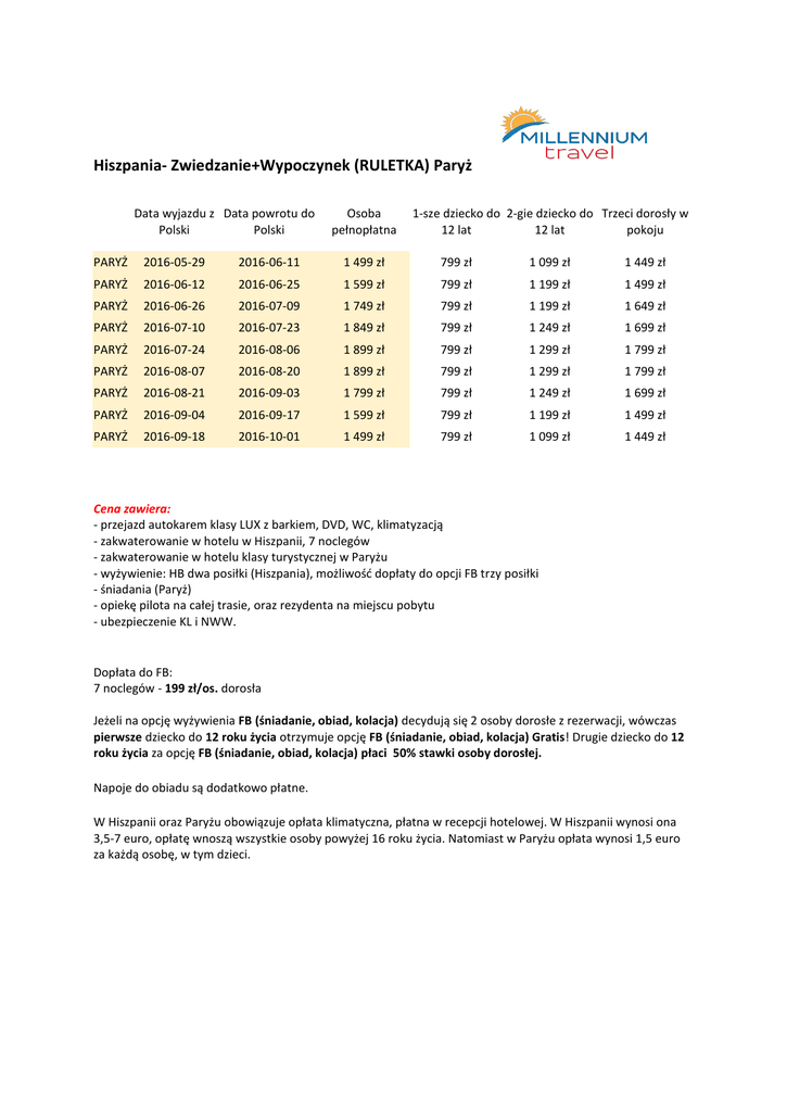 Hiszpania- Zwiedzanie+Wypoczynek (RULETKA) Paryż Data wyjazdu z Data powrotu do Polski Polski Osoba pełnopłatna 1-sze dziecko do 2-gie dziecko do Trzeci dorosły w 12 lat 12 lat pokoju PARYŻ 2016-05-29 2016-06-11 1 499 zł 799 zł 1 099 zł 1 449 zł PARYŻ 2016-06-12 2016-06-25 1 599 zł 799 zł 1 199 zł 1 499 zł PARYŻ 2016-06-26 2016-07-09 1 749 zł 799 zł 1 199 zł 1 649 zł PARYŻ 2016-07-10 2016-07-23 1 849 zł 799 zł 1 249 zł 1 699 zł PARYŻ 2016-07-24 2016-08-06 1 899 zł 799 zł 1 299 zł 1 799 zł PARYŻ 2016-08-07 2016-08-20 1 899 zł 799 zł 1 299 zł 1 799 zł PARYŻ 2016-08-21 2016-09-03 1 799 zł 799 zł 1 249 zł 1 699 zł PARYŻ 2016-09-04 2016-09-17 1 599 zł 799 zł 1 199 zł 1 499 zł PARYŻ 2016-09-18 2016-10-01 1 499 zł 799 zł 1 099 zł 1 449 zł Cena zawiera: - przejazd autokarem klasy LUX z barkiem, DVD, WC, klimatyzacją - zakwaterowanie w hotelu w Hiszpanii, 7 noclegów - zakwaterowanie w hotelu klasy turystycznej w Paryżu - wyżywienie: HB dwa posiłki (Hiszpania), możliwość dopłaty do opcji FB trzy posiłki - śniadania (Paryż) - opiekę pilota na całej trasie, oraz rezydenta na miejscu pobytu - ubezpieczenie KL i NWW. Dopłata do FB: 7 noclegów - 199 zł/os. dorosła Jeżeli na opcję wyżywienia FB (śniadanie, obiad, kolacja) decydują się 2 osoby dorosłe z rezerwacji, wówczas pierwsze dziecko do 12 roku życia otrzymuje opcję FB (śniadanie, obiad, kolacja) Gratis! Drugie dziecko do 12 roku życia za opcję FB (śniadanie, obiad, kolacja) płaci 50% stawki osoby dorosłej. Napoje do obiadu są dodatkowo płatne. W Hiszpanii oraz Paryżu obowiązuje opłata klimatyczna, płatna w recepcji hotelowej. W Hiszpanii wynosi ona 3,5-7 euro, opłatę wnoszą wszystkie osoby powyżej 16 roku życia. Natomiast w Paryżu opłata wynosi 1,5 euro za każdą osobę, w tym dzieci.