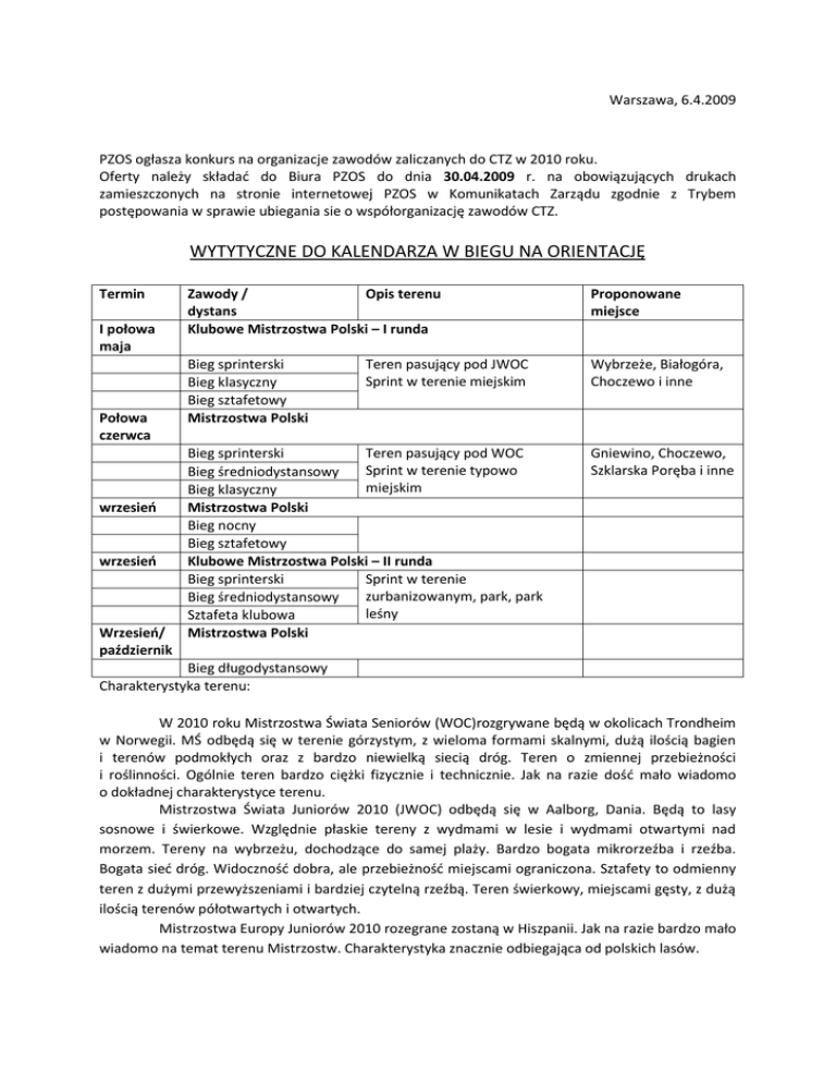 Warszawa, 6.4.2009 PZOS ogłasza konkurs na organizacje zawodów zaliczanych do CTZ w 2010 roku. Oferty należy składad do Biura PZOS do dnia 30.04.2009 r. na obowiązujących drukach zamieszczonych na stronie internetowej PZOS w Komunikatach Zarządu zgodnie z Trybem postępowania w sprawie ubiegania sie o współorganizację zawodów CTZ. WYTYTYCZNE DO KALENDARZA W BIEGU NA ORIENTACJĘ Termin I połowa maja Połowa czerwca wrzesień wrzesień Wrzesień/ październik Zawody / Opis terenu dystans Klubowe Mistrzostwa Polski – I runda Proponowane miejsce Bieg sprinterski Bieg klasyczny Bieg sztafetowy Mistrzostwa Polski Wybrzeże, Białogóra, Choczewo i inne Teren pasujący pod JWOC Sprint w terenie miejskim Bieg sprinterski Teren pasujący pod WOC Sprint w terenie typowo Bieg średniodystansowy miejskim Bieg klasyczny Mistrzostwa Polski Bieg nocny Bieg sztafetowy Klubowe Mistrzostwa Polski – II runda Bieg sprinterski Sprint w terenie zurbanizowanym, park, park Bieg średniodystansowy leśny Sztafeta klubowa Mistrzostwa Polski Gniewino, Choczewo, Szklarska Poręba i inne Bieg długodystansowy Charakterystyka terenu: W 2010 roku Mistrzostwa Świata Seniorów (WOC)rozgrywane będą w okolicach Trondheim w Norwegii. MŚ odbędą się w terenie górzystym, z wieloma formami skalnymi, dużą ilością bagien i terenów podmokłych oraz z bardzo niewielką siecią dróg. Teren o zmiennej przebieżności i roślinności. Ogólnie teren bardzo ciężki fizycznie i technicznie. Jak na razie dośd mało wiadomo o dokładnej charakterystyce terenu. Mistrzostwa Świata Juniorów 2010 (JWOC) odbędą się w Aalborg, Dania. Będą to lasy sosnowe i świerkowe. Względnie płaskie tereny z wydmami w lesie i wydmami otwartymi nad morzem. Tereny na wybrzeżu, dochodzące do samej plaży. Bardzo bogata mikrorzeźba i rzeźba. Bogata sied dróg. Widocznośd dobra, ale przebieżnośd miejscami ograniczona. Sztafety to odmienny teren z dużymi przewyższeniami i bardziej czytelną rzeźbą. Teren świerkowy, miejscami gęsty, z dużą ilością terenów półotwartych i otwartych. Mistrzostwa Europy Juniorów 2010 rozegrane zostaną w Hiszpanii. Jak na razie bardzo mało wiadomo na temat terenu Mistrzostw. Charakterystyka znacznie odbiegająca od polskich lasów. Mistrzostwa Świata w Rowerowej Jeździe na Orientację i Mistrzostwa Świata Juniorów w RJnO rozegrane zostaną w Montalegre w Portugalii. To kolejna impreza z bardzo odmienną charakterystyka terenu niż w Polsce. Komisja Ofertowa wybierze najlepsze oferty do dnia 10.05.2009 r. Centralny Terminarz Zawodów na 2010 r. zostanie opublikowany po 15 maja 2009 r. po przyjęciu przez Zarząd PZOS. Organizatorzy /jeżeli będą organizowad w 2010 r. n/w zawody / Grand Prix Mazowsza Puchar Wawelu Grand Prix Polonia Grand Prix Pomorza Baltic Cup Limanowa Cup do dnia 30 kwietnia 2009 r. proszeni są o podanie miejsc terminów i zawodów. Komisja Ofertowa w składzie: Sekretarz Zarządu, Dyrektor Biura, Przewodniczący Zespołu Szkolenia, Przedstawiciel Komisji ds. Map, Przedstawiciel Zarządu ds. biegu na orientację, Przedstawiciel Zarządu ds. rowerowej jazdy na orientację, Przedstawiciel Komisji Organizacji i Kontroli Zawodów, Przedstawiciel Budowy Tras. Rozpatrzy oferty pod względem formalnym – zgodności dokumentacji oraz merytorycznym - zgodności wymogów terenu i terminu, - innowacyjności, unikalności terenu, - atrakcyjności bazy noclegowej i możliwości dojazdu, - posiadanych zasobów rzeczowych, finansowych i osobowych do wykonania zadania, - dotychczasowego dorobku i doświadczenia przy wykonywaniu podobnych zadao.