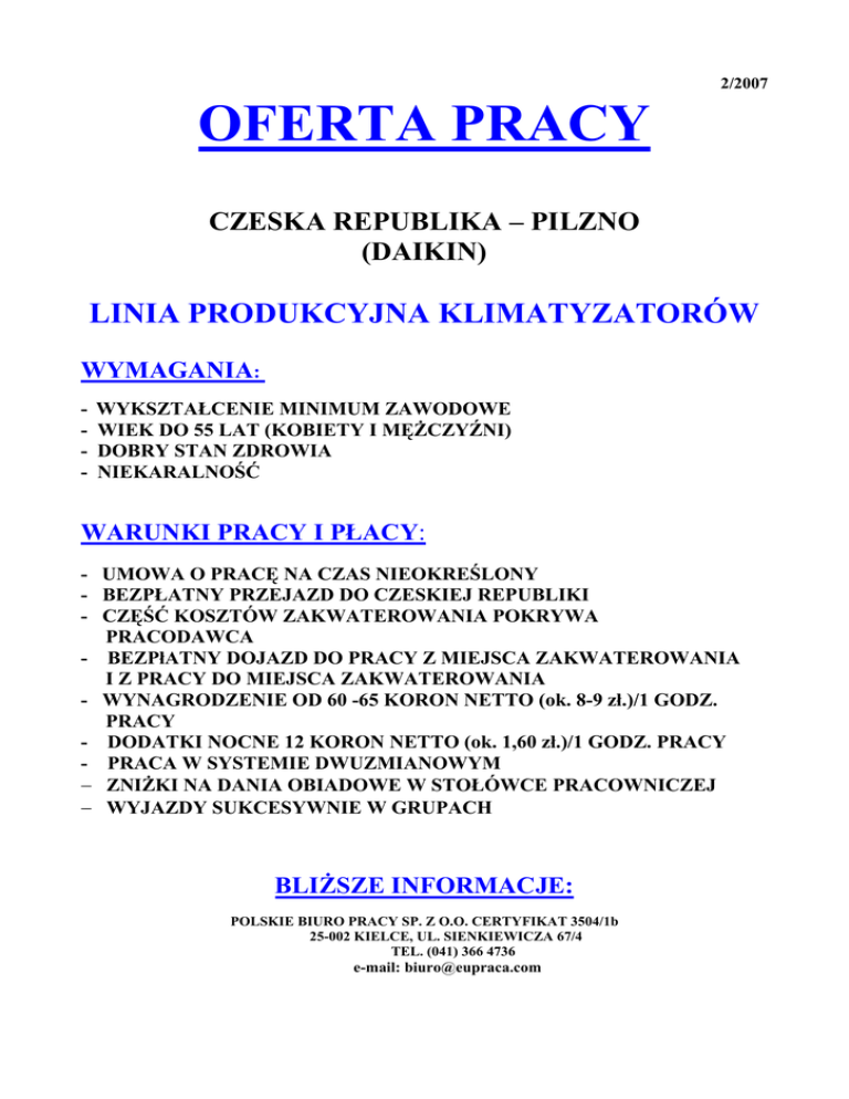 2/2007 OFERTA PRACY CZESKA REPUBLIKA – PILZNO (DAIKIN) LINIA PRODUKCYJNA KLIMATYZATORÓW WYMAGANIA: - WYKSZTAŁCENIE MINIMUM ZAWODOWE WIEK DO 55 LAT (KOBIETY I MĘŻCZYŹNI) DOBRY STAN ZDROWIA NIEKARALNOŚĆ WARUNKI PRACY I PŁACY: - UMOWA O PRACĘ NA CZAS NIEOKREŚLONY - BEZPŁATNY PRZEJAZD DO CZESKIEJ REPUBLIKI - CZĘŚĆ KOSZTÓW ZAKWATEROWANIA POKRYWA PRACODAWCA - BEZPłATNY DOJAZD DO PRACY Z MIEJSCA ZAKWATEROWANIA I Z PRACY DO MIEJSCA ZAKWATEROWANIA - WYNAGRODZENIE OD 60 -65 KORON NETTO (ok. 8-9 zł.)/1 GODZ. PRACY - DODATKI NOCNE 12 KORON NETTO (ok. 1,60 zł.)/1 GODZ. PRACY - PRACA W SYSTEMIE DWUZMIANOWYM − ZNIŻKI NA DANIA OBIADOWE W STOŁÓWCE PRACOWNICZEJ − WYJAZDY SUKCESYWNIE W GRUPACH BLIŻSZE INFORMACJE: POLSKIE BIURO PRACY SP. Z O.O. CERTYFIKAT 3504/1b 25-002 KIELCE, UL. SIENKIEWICZA 67/4 TEL. (041) 366 4736 e-mail: [email protected] Agencja Pośrednictwa Pracy Heroja s.r.o. poszukuje: www.herojasro.cz, tel. 00420 379 855 311, 00420 606 792 392 Prcawników produkcyjnych do montażu przy produkcji klimatyzatorów firmy DAIKIN miejsce pracy: Pilzno, Czechy WYMAGANIA: • wykształcenie min. zawodowe • niekaralność • wysoka motywacja do pracy, odpowiedzialność, samodzielność, dokładność, • wiek 18 – 55 lat, mile widziane kobiety • dobry stan zdrowia • mile widziana znajomość języka czeskiego lub angielskiego oraz doświadczenie w branży elektrotechnicznej itp. LICZBA KANDYDATÓW: 15 osób TRANSPORT: • bezpłatny transport w dniu 15.05.2007r.(wtorek) godz. 9.00 Kieleckie Centrum Kultury, Plac Moniuszki 2 INFORMACJE DOTYCZĄCE ZATRUDNIENIA: • oferujemy pracę w stabilnej, renomowanej firmie • minimum dwa dni szkolenia, pierwszy dzień (16. 05. 2007, środa) – szkolenie teoretyczne – (wstępne informace, szkolenie BHP). Drugi dzień (17. 05. 2007, czwartek) – szkolenie praktyczne – (śrubowanie, składanie elementów, informacje o pracy) Osoby, które pomyślnie przejdą szkolenie natychmiast zostaną przydzielone na stanowiska pracy. Wszystkie dni szkolenia są płtane. • umowę o pracę na czas nieokreślony, umowa podpisywana jest z naszą agencją • zakwaterowanie (koszt zakwaterowania w standardowym hotelu pracowniczym 1500 KČ, pokoje 4-5 osobowe, pościel zapewniona, kuchnia, toalety, prysznice społeczne – (naczynia, garnki, wieszaki itp. rzeczy praktycznego użytku należy zabrać ze sobą) • osobom, które zdecydują sie na prywatne kwatery gwarantujemy 1000 KČ netto dodatku mieszkaniowego miesięcznie • darmowy dojazd do pracy z miejsca zakwaterowania i z pracy • zaliczki na początku każdego tygodnia w wysokości 1000 KČ (na pierwszy tydzień pracy osoby muszą zapewnić sobie zaplecze finansowe) • Europejską kartę zdrowia • praca w systemie trzech zmian (dzień pracy = 8 godzin, w tym dwie płatne 8-minutowe przerwy i jedna niepłatna 30-minutowa przerwa obiadowa) • wynagrodzenie do 219 przepracowanych godzin 65 KČ/h netto, od 220 przepracowanych godzin 70 KČ/h netto • dodatek za nocne zmiany 12 KČ/h netto • możliwość wykonywania nadgodzin • zapewniona jest stołówka pracownicza, gdzie pracownicy posiadają zniżki na dania obiadowe • firma gwarantuje ubrania robocze (koszulka, kurtka oraz buty – spodnie do pracy kandydaci powinni zabrać ze sobą) KAŻDY KANDYDAT MUSÍ ZABRAĆ ZE SOBĄ DOWÓD OSOBISTY NA PIERWSZY DZIEŃ SZKOLENIA!!!.