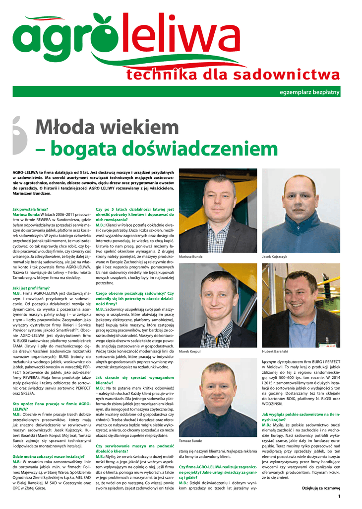 technika dla sadownictwa egzemplarz bezpłatny Młoda wiekiem – bogata doświadczeniem AGRO-LELIWA to firma działająca od 5 lat. Jest dostawcą maszyn i urządzeń przydatnych w sadownictwie. Ma szeroki asortyment rozwiązań technicznych mających zastosowanie w agrotechnice, ochronie, zbiorze owoców, cięciu drzew oraz przygotowaniu owoców do sprzedaży. O historii i teraźniejszości AGRO LELIWY rozmawiamy z jej właścicielem, Mariuszem Bundzem. Jak powstała firma? Mariusz Bundz: W latach 2006–2011 pracowałem w firmie REWERA w Sandomierzu, gdzie byłem odpowiedzialny za sprzedaż i serwis maszyn do sortowania jabłek, platform oraz kosiarek sadowniczych. W życiu każdego człowieka przychodzi jednak taki moment, że musi zadecydować, co tak naprawdę chce robić, czy będzie pracować w cudzej firmie, czy stworzy coś własnego. Ja zdecydowałem, że będę dalej zajmował się branżą sadowniczą, ale już na własne konto i tak powstała firma AGRO-LELIWA. Nazwa ta nawiązuje do Leliwy – herbu miasta Tarnobrzeg, w którym firma ma siedzibę. Jaki jest profil firmy? M.B.: Firma AGRO-LELIWA jest dostawcą maszyn i rozwiązań przydatnych w sadownictwie. Od początku działalności rozwija się dynamicznie, co wynika z poszerzania asortymentu maszyn, palety usług i – w związku z tym – liczby pracowników. Zaczynałem jako wyłączny dystrybutor firmy Rinieri i Service Provider systemu jakości SmartFreshTM. Obecnie AGRO-LELIWA jest dystrybutorem firm: N. BLOSI (sadownicze platformy samobieżne); FAMA (listwy i piły do mechanicznego cięcia drzew); Vaschieri (sadownicze rozrzutniki nawozów organicznych); BURG (roboty do rozładunku wodnego jabłek, woskownice do jabłek, pakowaczki owoców w woreczki); PERFECT (sortownice do jabłek; jako sub-dealer firmy REWERA). Moja firma produkuje także stoły pakerskie i taśmy odbiorcze do sortownic oraz świadczy serwis sortownic PERFECT oraz GREEFA. Kto oprócz Pana pracuje w firmie AGROLELIWA? M.B.: Obecnie w firmie pracuje trzech dobrze przeszkolonych pracowników, którzy mają już znaczne doświadczenie w serwisowaniu maszyn sadowniczych: Jacek Kujszczyk, Hubert Barański i Marek Korpul. Mój brat, Tomasz Bundz zajmuje się sprawami technicznymi i odpowiada za montaż nowych instalacji. Gdzie można zobaczyć wasze instalacje? M.B.: W ostatnim roku zamontowaliśmy linie do sortowania jabłek m.in. w firmach: Polimex Majewscy s.j. w Starej Warce, Spółdzielnia Ogrodnicza Ziemi Sądeckiej w Łącku, MEL SAD w Białej Rawskiej, M SAD w Goszczynie oraz OPC w Złotej Górze. Czy po 5 latach działalności łatwiej jest określić potrzeby klientów i dopasować do nich rozwiązania? M.B.: Klienci w Polsce potrafią dokładnie określić swoje potrzeby. Duża liczba szkoleń, możliwość wyjazdów zagranicznych oraz dostęp do Internetu powodują, że wiedzą co chcą kupić. Ułatwia to nam pracę, ponieważ możemy łatwo spełnić określone wymagania. Z drugiej strony należy pamiętać, że maszyny produkowane w Europie Zachodniej są relatywnie drogie i bez wsparcia programów pomocowych UE nasi sadownicy niestety nie będą kupowali nowych urządzeń, choćby były im najbardziej potrzebne. Czego obecnie poszukują sadownicy? Czy zmieniły się ich potrzeby w okresie działalności firmy? M.B.: Sadownicy uzupełniają swój park maszynowy o urządzenia, które ułatwiają im pracę (sekatory elektryczne, platformy samobieżne), bądź kupują takie maszyny, które zastępują pracę ręczną pracowników, tym bardziej, że coraz trudniej ich zatrudnić. Maszyny do konturowego cięcia drzew w sadzie także z tego powodu znajdują zastosowanie w gospodarstwach. Widzę także konieczność modernizacji linii do sortowania jabłek, które pracują w indywidualnych gospodarstwach poprzez wymianę wywrotnic skrzyniopalet na rozładunki wodne. Mariusz Bundz Jacek Kujszczyk Marek Korpul Hubert Barański łącznym dystrybutorem firm BURG i PERFECT w Mołdawii. To mały kraj o produkcji jabłek zbliżonej do tej z regionu sandomierskiego, czyli 500–600 tys. ton rocznie. W 2014 i 2015 r. zamontowaliśmy tam 8 dużych instalacji do sortowania jabłek o wydajności 5 ton na godzinę. Dostarczamy też tam sklejarki do kartonów BOIX, platformy N. BLOSI oraz WODZIŃSKI. Jak staracie się sprostać wymaganiom klientów? M.B.: Na to pytanie mam krótką odpowiedź – należy ich słuchać! Każdy klient pracuje w innych warunkach. Dla jednego sadownika platforma do zbioru jabłek jest rozwiązaniem idealnym, dla innego jest to maszyna zbyteczna (np. małe kwatery oddalone od gospodarstwa czy chłodni). Trzeba słuchać i doradzać oraz oferować to, co nabywca będzie mógł u siebie wykorzystać, a nie to, co chcemy sprzedać, a co może okazać się dla niego zupełnie nieprzydatne. Tomasz Bundz Czy serwisowanie maszyn ma podnosić dbałość o klienta? M.B.: Myślę, że serwis świadczy o dużej mobilności firmy, a jego jakość jest ważnym aspektem wpływającym na opinię o niej. Jeśli firma dba o klienta, pomaga mu w wyborach, a także w jego problemach z maszynami, to jest szansa, że wróci on po następną. Co więcej, powie swoim sąsiadom, że jest zadowolony i oni także staną się naszymi klientami. Najlepsza reklama dla firmy to zadowolony klient. Czy firma AGRO-LELIWA realizuje zagraniczne projekty? Jakie usługi świadczy za granicą i gdzie? M.B.: Dzięki doświadczeniu i dobrym wynikom sprzedaży od trzech lat jesteśmy wy- Jak wygląda polskie sadownictwo na tle innych krajów? M.B.: Myślę, że polskie sadownictwo budzi niemałą zazdrość i na zachodzie i na wschodzie Europy. Nasi sadownicy potrafili wykorzystać szanse, jakie dały im fundusze europejskie. Teraz musimy tylko popracować nad współpracą przy sprzedaży jabłek, bo ten element pozostawia wiele do życzenia i często jest wykorzystywany przez firmy handlujące owocami czy warzywami do zaniżania cen oferowanych producentom. Trzymam 