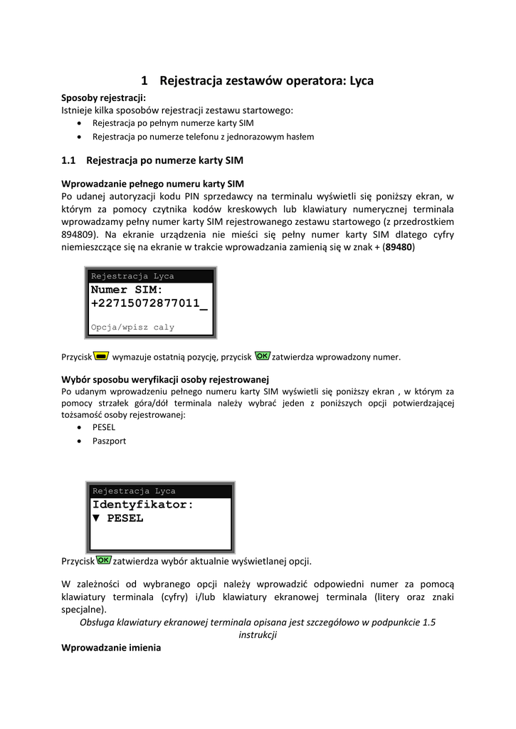 1 Rejestracja zestawów operatora: Lyca Sposoby rejestracji: Istnieje kilka sposobów rejestracji zestawu startowego: Rejestracja po pełnym numerze karty SIM Rejestracja po numerze telefonu z jednorazowym hasłem 1.1 Rejestracja po numerze karty SIM Wprowadzanie pełnego numeru karty SIM Po udanej autoryzacji kodu PIN sprzedawcy na terminalu wyświetli się poniższy ekran, w którym za pomocy czytnika kodów kreskowych lub klawiatury numerycznej terminala wprowadzamy pełny numer karty SIM rejestrowanego zestawu startowego (z przedrostkiem 894809). Na ekranie urządzenia nie mieści się pełny numer karty SIM dlatego cyfry niemieszczące się na ekranie w trakcie wprowadzania zamienią się w znak + (89480) Rejestracja Lyca Numer SIM: +22715072877011_ Opcja/wpisz caly Przycisk wymazuje ostatnią pozycję, przycisk zatwierdza wprowadzony numer. Wybór sposobu weryfikacji osoby rejestrowanej Po udanym wprowadzeniu pełnego numeru karty SIM wyświetli się poniższy ekran , w którym za pomocy strzałek góra/dół terminala należy wybrać jeden z poniższych opcji potwierdzającej tożsamość osoby rejestrowanej: PESEL Paszport Rejestracja Lyca Identyfikator: ▼ PESEL Przycisk zatwierdza wybór aktualnie wyświetlanej opcji. W zależności od wybranego opcji należy wprowadzić odpowiedni numer za pomocą klawiatury terminala (cyfry) i/lub klawiatury ekranowej terminala (litery oraz znaki specjalne). Obsługa klawiatury ekranowej terminala opisana jest szczegółowo w podpunkcie 1.5 instrukcji Wprowadzanie imienia Po udanym zatwierdzeniu przyciskiem powyższej opcji, wyświetli się poniższy ekran, w którym za pomocy klawiatury ekranowej terminala należy wprowadzić imię osoby rejestrowanej: Rejestracja Lyca Podaj imię: JAN_ ▲█/-AĄBCĆDEĘFGH▼ Wstawienie znaku [*] Przycisk * wybiera znak zaznaczony kursorem, przycisk zatwierdza wprowadzone imię. wymazuje ostatnią pozycję, przycisk Wprowadzanie nazwiska Po udanym wprowadzeniu imienia wyświetli się poniższy ekran, w którym za pomocy klawiatury ekranowej terminala należy wprowadzić nazwisko osoby rejestrowanej: Rejestracja Lyca Podaj nazwisko: KOWALSKI_ ▲IJKLŁMNŃOÓPRSŚ▼ Wstawienie znaku [*] Przycisk * wybiera znak zaznaczony kursorem, przycisk zatwierdza wprowadzone nazwisko. wymazuje ostatnią pozycję, przycisk Zatwierdzenie/poprawa danych Po udanym zatwierdzeniu nazwiska wyświetli się poniższy ekran, w którym wyświetlają się wprowadzane za pośrednictwem terminala dane osoby rejestrowanej, w celu ich weryfikacji: Zatwierdzanie danych SIM: 4899061140900 TEL: IMIĘ: JAN NAZW: KOWALSKI DOKUM: Dowód osobisty DOKUM:AGM161127 Popraw[1] ZGODNE[OK] W przypadku konieczności poprawy danych należy użyć przycisku 1 na klawiaturze terminala, w przypadku wyświetlenia prawidłowych danych osoby rejestrowanej, należy użyć przycisku aby zweryfikowane dane wysyłać do operatora w celu rejestracji. Na ekranie terminala pojawią się kolejno komunikaty: Połączenie, Autoryzacja, Transmisja oraz odpowiedz operatora w formie komunikatu. Odpowiedzi operatora opisane są szczegółowo w podpunkcie 4.3 instrukcji 1.2 Rejestracja po numerze telefonu z jednorazowym hasłem Wprowadzanie numeru karty SIM Po udanej autoryzacji kodu PIN sprzedawcy na terminalu wyświetli się poniższy ekran, w którym aby skorzystać z opcji jednorazowego hasła należy bez wpisywania numeru karty sim zatwierdzić poniższy ekran za pomocą przycisku Rejestracja Lyca Numer SIM: _ Opcja/wpisz caly Wprowadzenie numeru telefonu Po zatwierdzeniu ekranu wprowadzania numer karty SIM pojawi się poniższy ekran, w którym za pomocy klawiatury numerycznej terminala należy wprowadzić 9 cyfrowy numer telefonu (bez przedrostka 48, 0048, +48) Rejestracja Lyca Numer telefonu: 987654321_ Przycisk wymazuje ostatnią pozycję, przycisk zatwierdza wprowadzony numer. Wybór sposobu weryfikacji osoby rejestrowanej Po udanym wprowadzeniu 9 cyfrowy numer telefonu wyświetli się poniższy ekran, w którym za pomocy strzałek góra/dół terminala należy wybrać jeden z poniższych sposobów potwierdzenia tożsamości osoby rejestrowanej: PESEL Paszport Rejestracja Lyca Identyfikator: ▼ PESEL Przycisk zatwierdza wybór aktualnie wyświetlanej opcji. W zależności od wybranego opcji należy wprowadzić odpowiedni numer za pomocą klawiatury terminala (cyfry) i/lub klawiatury ekranowej terminala (litery oraz znaki specjalne). Obsługa klawiatury ekranowej terminala opisana jest szczegółowo w podpunkcie 1.5 instrukcji Wstępna weryfikacja danych u operatora Po zatwierdzeniu wprowadzonych danych z wybranego sposobu weryfikacji następuje wysyłka danych w celu ich wstępnej weryfikacji. Na ekranie terminala pojawiają się kolejno komunikaty: Połączenie, Autoryzacja, Transmisja oraz odpowiedz operatora w formie komunikatu. W przypadku zakończenia wstępnej weryfikacji sukcesem na ekranie terminal pojawi się komunikat: Rejestracja Lyca Dane poprawne. Kontynuuj rejestrację. Aby kontynuować należy zatwierdzić powyższy ekran za pomocą przycisku Wprowadzanie jednorazowego hasła Na terminalu wyświetli się poniższy ekran, w którym za pomocy klawiatury terminala należy wprowadzić jednorazowe hasło wysłane przez operatora: Rejestracja Lyca Podaj kod z SMS: 1234_ Aby kontynuować należy zatwierdzić powyższy ekran za pomocą przycisku Wprowadzanie imienia Po udanym zatwierdzeniu przyciskiem powyższej opcji, wyświetli się poniższy ekran, w którym za pomocy klawiatury ekranowej terminala należy wprowadzić imię osoby rejestrowanej: Rejestracja Lyca Podaj imię: JAN_ ▲█/-AĄBCĆDEĘFGH▼ Wstawienie znaku [*] Przycisk * wybiera znak zaznaczony kursorem, przycisk zatwierdza wprowadzone imię. wymazuje ostatnią pozycję, przycisk Wprowadzanie nazwiska Po udanym wprowadzeniu imienia wyświetli się poniższy ekran, w którym za pomocy klawiatury ekranowej terminala należy wprowadzić nazwisko osoby rejestrowanej: Rejestracja Lyca Pod