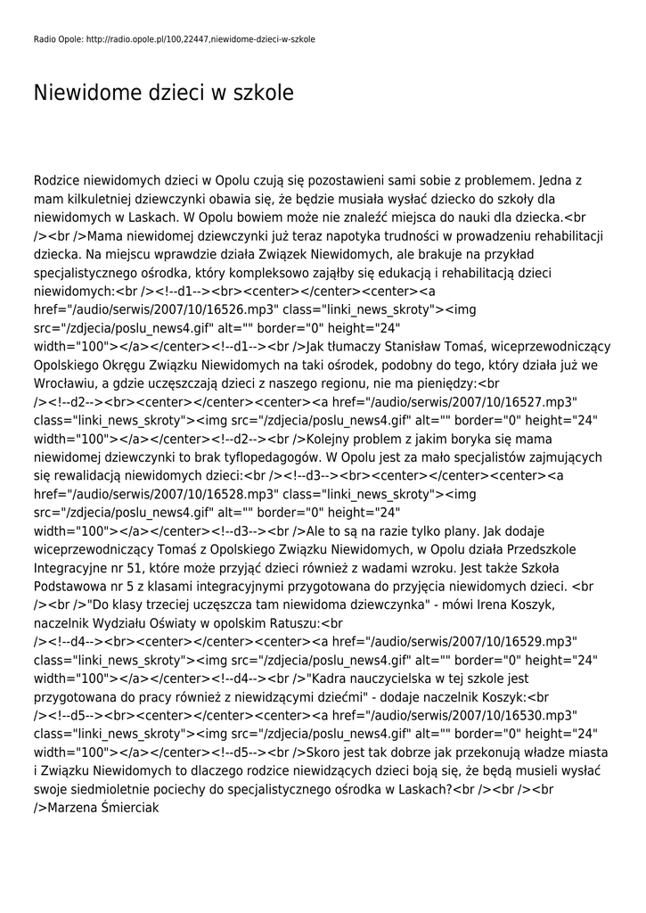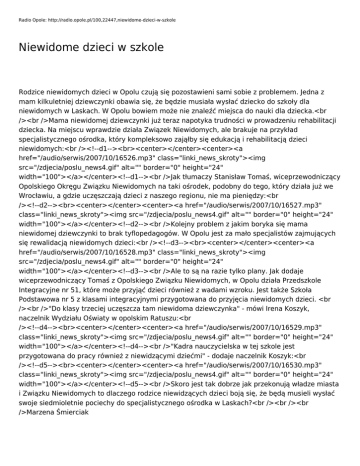 Radio Opole: http://radio.opole.pl/100,22447,niewidome-dzieci-w-szkole Niewidome dzieci w szkole Rodzice niewidomych dzieci w Opolu czują się pozostawieni sami sobie z problemem. Jedna z mam kilkuletniej dziewczynki obawia się, że będzie musiała wysłać dziecko do szkoły dla niewidomych w Laskach. W Opolu bowiem może nie znaleźć miejsca do nauki dla dziecka.<br /><br />Mama niewidomej dziewczynki już teraz napotyka trudności w prowadzeniu rehabilitacji dziecka. Na miejscu wprawdzie działa Związek Niewidomych, ale brakuje na przykład specjalistycznego ośrodka, który kompleksowo zająłby się edukacją i rehabilitacją dzieci niewidomych:<br /><!--d1--><br><center></center><center><a href="/audio/serwis/2007/10/16526.mp3" class="linki_news_skroty"><img src="/zdjecia/poslu_news4.gif" alt="" border="0" height="24" width="100"></a></center><!--d1--><br />Jak tłumaczy Stanisław Tomaś, wiceprzewodniczący Opolskiego Okręgu Związku Niewidomych na taki ośrodek, podobny do tego, który działa już we Wrocławiu, a gdzie uczęszczają dzieci z naszego regionu, nie ma pieniędzy:<br /><!--d2--><br><center></center><center><a href="/audio/serwis/2007/10/16527.mp3" class="linki_news_skroty"><img src="/zdjecia/poslu_news4.gif" alt="" border="0" height="24" width="100"></a></center><!--d2--><br />Kolejny problem z jakim boryka się mama niewidomej dziewczynki to brak tyflopedagogów. W Opolu jest za mało specjalistów zajmujących się rewalidacją niewidomych dzieci:<br /><!--d3--><br><center></center><center><a href="/audio/serwis/2007/10/16528.mp3" class="linki_news_skroty"><img src="/zdjecia/poslu_news4.gif" alt="" border="0" height="24" width="100"></a></center><!--d3--><br />Ale to są na razie tylko plany. Jak dodaje wiceprzewodniczący Tomaś z Opolskiego Związku Niewidomych, w Opolu działa Przedszkole Integracyjne nr 51, które może przyjąć dzieci również z wadami wzroku. Jest także Szkoła Podstawowa nr 5 z klasami integracyjnymi przygotowana do przyjęcia niewidomych dzieci. <br /><br />"Do klasy trzeciej uczęszcza tam niewidoma dziewczynka" - mówi Irena Koszyk, naczelnik Wydziału Oświaty w opolskim Ratuszu:<br /><!--d4--><br><center></center><center><a href="/audio/serwis/2007/10/16529.mp3" class="linki_news_skroty"><img src="/zdjecia/poslu_news4.gif" alt="" border="0" height="24" width="100"></a></center><!--d4--><br />"Kadra nauczycielska w tej szkole jest przygotowana do pracy również z niewidzącymi dziećmi" - dodaje naczelnik Koszyk:<br /><!--d5--><br><center></center><center><a href="/audio/serwis/2007/10/16530.mp3" class="linki_news_skroty"><img src="/zdjecia/poslu_news4.gif" alt="" border="0" height="24" width="100"></a></center><!--d5--><br />Skoro jest tak dobrze jak przekonują władze miasta i Związku Niewidomych to dlaczego rodzice niewidzących dzieci boją się, że będą musieli wysłać swoje siedmioletnie pociechy do specjalistycznego ośrodka w Laskach?<br /><br /><br />Marzena Śmierciak