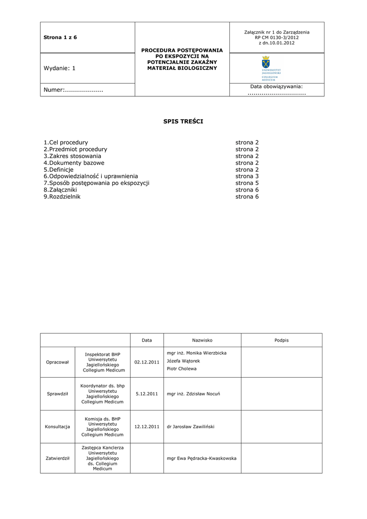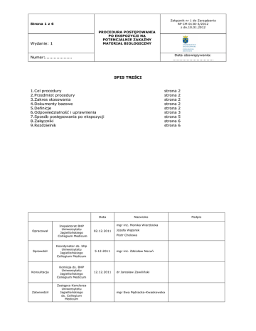 Załącznik nr 1 do Zarządzenia RP CM 0130-3/2012 z dn.10.01.2012 Strona 1 z 6 PROCEDURA POSTĘPOWANIA PO EKSPOZYCJI NA POTENCJALNIE ZAKAŹNY MATERIAŁ BIOLOGICZNY Wydanie: 1 Data obowiązywania: Numer:................... ............................. SPIS TREŚCI 1.Cel procedury 2.Przedmiot procedury 3.Zakres stosowania 4.Dokumenty bazowe 5.Definicje 6.Odpowiedzialność i uprawnienia 7.Sposób postępowania po ekspozycji 8.Załączniki 9.Rozdzielnik Data Opracował Inspektorat BHP Uniwersytetu Jagiellońskiego Collegium Medicum strona strona strona strona strona strona strona strona strona Nazwisko mgr inż. Monika Wierzbicka 02.12.2011 Józefa Wątorek Piotr Cholewa Sprawdził Koordynator ds. bhp Uniwersytetu Jagiellońskiego Collegium Medicum 5.12.2011 Konsultacja Komisja ds. BHP Uniwersytetu Jagiellońskiego Collegium Medicum 12.12.2011 Zatwierdził Zastępca Kanclerza Uniwersytetu Jagiellońskiego ds. Collegium Medicum mgr inż. Zdzisław Nocuń dr Jarosław Zawiliński mgr Ewa Pędracka-Kwaskowska 2 2 2 2 2 3 5 6 6 Podpis Załącznik nr 1 do Zarządzenia RP CM 0130-3/2012 z dn.10.01.2012 Strona 2 z 6 Wydanie: 1 PROCEDURA POSTĘPOWANIA PO EKSPOZYCJI NA POTENCJALNIE ZAKAŹNY MATERIAŁ BIOLOGICZNY Numer:................... Data obowiązywania: ............................. 1. Cel procedury Celem procedury jest wskazanie wytycznych jakie powinny zostać zastosowane w prawidłowej organizacji działań doraźnych, związanych z ekspozycją zawodową na potencjalnie zakaźny materiał biologiczny. Wszystkie działania winny zostać podjęte w celu zapobiegania zakażeniom oraz w celu podjęcia stosownej profilaktyki po ekspozycji. 2. Przedmiot procedury Przedmiotem procedury jest opis sposobu postępowania po ekspozycji na materiał potencjalnie zakaźny. 3. Zakres stosowania Postanowienia zawarte w niniejszej procedurze dotyczą: a) pracowników UJ CM b) studentów UJ CM c) uczestników studiów doktoranckich UJ CM. 4. Dokumenty bazowe 4.1. Rozporządzenie Ministra Nauki i Szkolnictwa Wyższego w sprawie bezpieczeństwa i higieny pracy w uczelniach (Dz. U. Nr 128, poz. 897 z dnia 18.07.2007). 4.2. Ustawa o zaopatrzeniu z tytułu wypadków lub chorób zawodowych powstałych w szczególnych okolicznościach (Dz. U. Nr 199, poz. 1974 z dnia 30.10.2002). 4.3. Ustawa o ubezpieczeniu społecznym z tytułu wypadków przy pracy i chorób zawodowych (Dz. U. Nr 199, poz. 1673 z dnia 30.10.2002). 4.4. Rozporządzenia Ministra Pracy i Polityki Społecznej w sprawie trybu uznawania zdarzenia powstałego w okresie ubezpieczenia wypadkowego za wypadek przy pracy, kwalifikacji prawnej zdarzenia, wzoru karty wypadku i terminu jej sporządzenia (Dz. U. Nr 236, poz. 1992 z dnia 19.12.2002). 4.5. Ustawa z dnia 5 grudnia 2008 r. zapobieganie oraz zwalczanie zakażeń oraz chorób zakaźnych u ludzi (DZ. U. z 2008 r. Nr 234, poz. 1570). 4.6. Rozporządzenie Ministra Zdrowia z dnia 22 kwietnia 2005 r. szkodliwe czynniki biologiczne w środowisku pracy oraz ochrona zdrowia pracowników zawodowo narażonych na te czynniki (Dz. U. z 2005 r., Nr 81, poz. 716, z późn. zm.). 5. Definicje 5.1. Ekspozycja zawodowa – to narażenie na kontakt z materiałem biologicznie potencjalnie zakaźnym (pracowników, studentów, uczestników studiów doktoranckich) związane z wykonywaniem zawodu, zajęciami praktycznymi, nauką zawodu, wywołujące zakażenia. 5.2. Osoba eksponowana – pracownik UJ CM, student UJ CM, uczestnik studiów doktoranckich UJ CM, która została narażona w wyniku kontaktu z materiałem biologicznym potencjalnie zakaźnym, w czasie wykonywania obowiązków służbowych i zadań dydaktycznych. 5.3. Materiał biologiczny potencjalnie zakaźny to: a) krew - najbardziej niebezpieczne źródło zakażenia b) wydaliny i wydzieliny zawierające widoczne domieszki krwi (mocz, kał, ślina, plwocina, wymiociny, wydzielina z nosa, pot, łzy Załącznik nr 1 do Zarządzenia RP CM 0130-3/2012 z dn.10.01.2012 Strona 3 z 6 Wydanie: 1 Numer:................... PROCEDURA POSTĘPOWANIA PO EKSPOZYCJI NA POTENCJALNIE ZAKAŹNY MATERIAŁ BIOLOGICZNY Data obowiązywania: ............................. c) inny potencjalnie infekcyjny materiał (IPIM): płyny: mózgowo-rdzeniowy, opłucnowy, otrzewnowy, osierdziowy, owodniowy, maź stawowa, mleko kobiece, wydzielina pochwowa, nasienie, hodowle tkankowe lub mikrobiologiczne, jakakolwiek oddzielona tkanka lub narząd człowieka żywego lub martwego, pożywki zawierające HBV, HCV, HIV. 5.4. Kontakt z ww. materiałami biologicznymi potencjalnie zakaźnymi może nastąpić przez: a) naruszenie ciągłości skóry poprzez zakłucie, zadrapanie, skaleczenie narzędziem zbrudzonym materiałem biologicznym b) zetknięcie uszkodzonej wcześniej skóry z materiałem biologicznym przez otwartą, niezabezpieczoną ranę, skaleczenie, pękniecie, zadrapanie, otarcie naskórka, zmiany zapalne c) zachlapanie błon śluzowych materiałem biologicznym – jama ustna, spojówki oczu. 5.5. Ekspozycja nie wymagająca szczególnego postępowania obejmuje: a) ekspozycję skóry nieuszkodzonej b) ekspozycję wątpliwą, gdy doszło do powierzchownego skaleczenia igłą lub narzędziami uznanymi za nieskażone krwią lub IPIM c) ekspozycję wątpliwą, gdy wcześniej nabyte skaleczenie lub rana została skażona płynem ustrojowym innym niż krew lub IPIM, a nie zawierająca śladu krwi. 5.6. Ekspozycja prawdopodobna, wymagająca szczególnego postępowania obejmuje: a) śródskórne skaleczenie igłą skażoną krwią lub IPIM b) powierzchowną ranę bez widocznego krwawienia, wywołaną przez narzędzie skażone krwią lub IPIM c) skażenie krwią wcześniej nabytego skaleczenia d) kontakt śluzówek lub spojówek z krwią lub IPIM. 5.7. Ekspozycja ewidentna, wymagająca szczególnego postępowania obejmuje: a) uszkodzenie przenikające skórę igłą skażoną krwią lub IPIM b) wstrzyknięcie krwi c) skaleczenie lub podobną ranę z następstwem krwawienia, wywołane przez narzędzie w spo