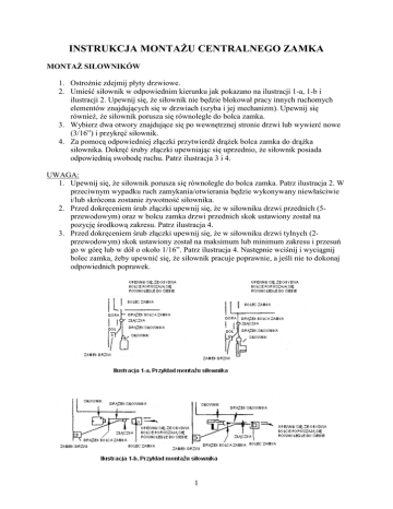 INSTRUKCJA MONTAŻU CENTRALNEGO ZAMKA MONTAŻ SIŁOWNIKÓW 1. Ostrożnie zdejmij płyty drzwiowe. 2. Umieść siłownik w odpowiednim kierunku jak pokazano na ilustracji 1-a, 1-b i ilustracji 2. Upewnij się, że siłownik nie będzie blokował pracy innych ruchomych elementów znajdujących się w drzwiach (szyba i jej mechanizm). Upewnij się również, że siłownik porusza się równolegle do bolca zamka. 3. Wybierz dwa otwory znajdujące się po wewnętrznej stronie drzwi lub wywierć nowe (3/16”) i przykręć siłownik. 4. Za pomocą odpowiedniej złączki przytwierdź drążek bolca zamka do drążka siłownika. Dokręć śruby złączki upewniając się uprzednio, że siłownik posiada odpowiednią swobodę ruchu. Patrz ilustracja 3 i 4. UWAGA: 1. Upewnij się, że siłownik porusza się równolegle do bolca zamka. Patrz ilustracja 2. W przeciwnym wypadku ruch zamykania/otwierania będzie wykonywany niewłaściwie i/lub skrócona zostanie żywotność siłownika. 2. Przed dokręceniem śrub złączki upewnij się, że w siłowniku drzwi przednich (5przewodowym) oraz w bolcu zamka drzwi przednich skok ustawiony został na pozycję środkową zakresu. Patrz ilustracja 4. 3. Przed dokręceniem śrub złączki upewnij się, że w siłowniku drzwi tylnych (2przewodowym) skok ustawiony został na maksimum lub minimum zakresu i przesuń go w górę lub w dół o około 1/16”. Patrz ilustracja 4. Następnie wciśnij i wyciągnij bolec zamka, żeby upewnić się, że siłownik pracuje poprawnie, a jeśli nie to dokonaj odpowiednich poprawek. 1 MONTAŻ PRZEWODÓW 1. Upewnij się, że wszystkie siłowniki zostały zamontowane i podłączone zanim podłączysz czerwony i czarny przewód do zasilania +12V i masy. 2. Podczas podłączania wiązki przewodów do siłowników drzwi przednich (5przewodowych) upewnij się, że przewody zostały połączone według kolorów. Patrz ilustracja 5. Siłownik przedni Biały Brązowy Czarny Niebieski Zielony } Sterowanie } Silnik Wiązka Biały (1) Brązowy (1) Czarny Niebieski Zielony a. Podłączenie białego przewodu siłownika do brązowego (1) przewodu z wiązki przewodów (lub niebieskiego do zielonego) spowoduje automatyczne podnoszenie się i opuszczanie siłownika. b. (1) Biały i czarny przewód siłownika 5-przewodowego zostają ze sobą połączone gdy siłownik znajduje się w pozycji wysuniętej. (2) Brązowy i czarny przewód siłownika 5-przewodowego zostają ze sobą połączone gdy siłownik znajduje się w pozycji schowanej. 2 c. (1) Siłownik zostanie wysunięty jeśli jego niebieski i zielony przewód zostaną podłączone do zasilania +12V i masy odpowiednio. (2) Siłownik zostanie schowany jeśli jego niebieski i zielony przewód zostaną podłączone do masy i zasilania +12V odpowiednio. 3. Podczas podłączania wiązki przewodów do siłowników drzwi tylnych (2przewodowych) upewnij się, że przewody zostały połączone według kolorów. Jeśli wysuwanie/chowanie (otwieranie/zamykanie) siłowników drzwi tylnych nie jest ustawione tak samo jak siłowników drzwi przednich, to należy zamienić ze sobą niebieski i zielony przewód (niebieski przewód siłownika do zielonego przewodu z wiązki). UWAGA: Upewnij się, że przewody zostały zamontowane tak, by nie były przyciśnięte przez mechanizm szyby lub śruby, ponieważ może to spowodować zwarcie i awarię zamka. 4. Wciśnij i podnieś bolec zamka w przednich drzwiach (siłownik 5-przewodowy), żeby sprawdzić czy wszystkie siłowniki działają i poruszają się w tą samą stronę. (Jeśli któryś z siłowników będzie poruszał się w przeciwną stronę, to należy zamienić ze sobą niebieski i zielony przewód jak wyjaśniono w punkcie 3). Ilustracja 5. Schemat przewodów 3 ROZWIĄZYWANIE PROBLEMÓW PROBLEM 1. NIE DZIAŁAJĄ SIŁOWNIKI 2. BEZPIECZNIK CAŁY CZAS SIĘ PRZEPALA 3. SIŁOWNIK DRZWI PRZEDNICH NIE DZIAŁA 4. SIŁOWNIK WYSUWA SIĘ I CHOWA AUTOMATYCZNIE ROZWIĄZANIE a. Sprawdź podłączenie przewodów +12V i masy oraz bezpiecznik. b. Sprawdź podłączenie przewodów do sterownika zamka. c. Sprawdź działanie sterownika zamka. Przyłóż do masy biały(1) i brązowy(1) przewód z wiązki przewodów. Spowoduje to zmianę położenia siłowników. (Po zwarciu do masy białego(1) i brązowego(1) przewodu z wiązki przewodów ze sterownika powinien być słyszalny „pstryk”. Istnieje zwarcie w obwodzie. a. Odsuń wiązkę przewodów od złącz siłowników. b. Jeśli bezpiecznik nadal przepala się po przyłożeniu do masy białego lub brązowego przewodu z wiązki przewodów to może to oznaczać, że wiązka przewodów została uszkodzona śrubą lub mechanizmem opuszczania szyby. c. Jeśli wiązka przewodów jest zwarta to sprawdź po kolei każdy siłownik odłączając jeden za każdym razem i sprawdzając czy bezpiecznik się przepala. a. Sprawdź podłączenie siłownika (Ilustr. 5) b. Sprawdź czy złącza siłowników są odpowiednio zabezpieczone. c. Sprawdź czy wszystkie części mechaniczne są solidnie przykręcone. d. Sprawdź i wyreguluj skok siłownika (Ilustracja 1, 2 i 4) e. Sprawdź zasilanie siłownika +12V i przyłóż do masy niebieski i zielony przewód siłownika, żeby sprawdzić czy jest on sprawny czy uszkodzony. (Odłącz siłownik od wiązki przewodów zanim zaczniesz sprawdzać jego działanie) a. Najpierw odłącz zasilanie +12V od siłownika. b. Upewnij się, że biały, brązowy, niebieski i zielony przewód siłownika jest podłączony do przewodów z wiązki odpowiedniego koloru. c. Jeśli kolory się zgadzają, zamień ze sobą biały i brązowy lub niebieski i zielony przewód. 4 5. SIŁOWNIK DRZWI TYLNYCH NIE DZIAŁA 6. ZAMYKANIE/OTWIERANIE DRZWI TYLNYCH NIE JEST ZSYNCHRONIZOWANE Z DRZWIAMI PRZEDNIMI a. Sprawdź podłączenie wszystkich siłowników. b. Sprawdź czy złącza siłowników są odpowiednio zabezpieczone. c. Jak w punkcie 3-c (powyżej) d. Jak w punkcie 3-d (powyżej) e. Jak w punkcie 3-e (powyżej) a.