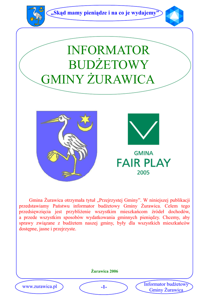 „Skąd mamy pieniądze i na co je wydajemy” INFORMATOR BUDśETOWY GMINY śURAWICA Gmina śurawica otrzymała tytuł „Przejrzystej Gminy”. W niniejszej publikacji przedstawiamy Państwu informator budŜetowy Gminy śurawica. Celem tego przedsięwzięcia jest przybliŜenie wszystkim mieszkańcom źródeł dochodów, a przede wszystkim sposobów wydatkowania gminnych pieniędzy. Chcemy, aby sprawy związane z budŜetem naszej gminy, były dla wszystkich mieszkańców dostępne, jasne i przejrzyste. śurawica 2006 www.zurawica.pl -1- Informator budŜetowy Gminy śurawica „Skąd mamy pieniądze i na co je wydajemy” Co to jest „BudŜet Gminy”? BudŜet to roczny plan działalności finansowej gminy. W budŜecie zestawia się przewidywane dochody i wydatki związane z działalnością gminy. Określa się wysokość kwot na poszczególne zadania i dziedziny Ŝycia gminy. BudŜet gminy jest aktem prawnym, którego projekt przygotowuje wójt, a uchwala na kaŜdy rok kalendarzowy rada gminy. Co oznaczają pojęcia związane z budŜetem? subwencje – bezzwrotna kwota pieniędzy przeznaczana z budŜetu państwa dla gminy. Subwencje mają na celu wyrównywania niewystarczających dochodów własnych gminy. Otrzymane z budŜetu państwa subwencje ogólne mogą być swobodnie wykorzystywane. udziały w podatkach dochodowych (CIT i PIT) – podatki (od dochodu) płacone przez mieszkańców i firmy wpływają w całości najpierw do budŜetu państwa, a następnie są dzielone i ich część trafia do budŜetu gminy. dotacje – pieniądze otrzymywane przez gminę na realizację zadań zleconych oraz na dofinansowanie zadań własnych. zadania zlecone - są to zadania wykonywane przez gminę, które są zlecone przez organy wyŜszego rzędu. Do zadań zleconych naleŜy np.: pomoc społeczna, część kosztów utrzymania administracji. dochody z podatków i opłat – są to pieniądze wpływające do kasy gminnej w związku z obowiązkowymi opłatami określonymi przez państwo w ustawach lub lokalnie przez radę gminy. NaleŜą do nich np.: podatek od nieruchomości, od środków transportowych, leśny, rolny, od spadków i darowizn, opłaty skarbowe. dochody majątkowe – kwoty uzyskiwane ze sprzedaŜy lub udostępnienia majątku gminy, np.: ze sprzedaŜy gruntów, budynków, lokali, z wpływów za dzierŜawę, najem, uŜytkowanie wieczyste. pozostałe dochody – to pieniądze z opłat ustalonych przez radę gminy za usługi świadczone przez jednostki samorządowe, np.: opłaty za wydane zezwolenia, odsetki od kwot zgromadzonych na kontach bankowych, odsetki naliczane od nieterminowych wpłat z tytułu podatków itd. nadwyŜka budŜetowa - kwota, o którą wpływy do budŜetu przewyŜszają wydatki poniesione w danym okresie rozliczeniowym. deficyt budŜetowy - kwota, o którą wydatki z budŜetu przewyŜszają dochody budŜetowe poniesione w danym okresie rozliczeniowym. www.zurawica.pl -2- Informator budŜetowy Gminy śurawica „Skąd mamy pieniądze i na co je wydajemy” Skąd biorą się pieniądze w budŜecie gminy? Pieniądze do gminnego budŜetu wpływają z róŜnych źródeł co prezentujemy poniŜej. Ogólnie moŜna je podzielić na 2 grupy. Jedna to dochody własne, a druga to wszystkie pieniądze, które gmina otrzymuje z budŜetu państwa i z innych źródeł zewnętrznych. BudŜet Gminy Dotacje Subwencje Pozostałe dochody Udział w podatkach CIT i PIT Gospodarka mieszkaniowa Dochody z podatków i opłat Na co gmina wydaje pieniądze? Zadania, na które gmina wydaje pieniądze są określone w ustawie o samorządzie gminnym. Gmina śurawica najwięcej pieniędzy przeznacza na szkolnictwo, gospodarkę komunalną, ochronę środowiska oraz pomoc społeczną. Te grupy wydatków stanowią blisko 80 % całego gminnego budŜetu. Realizujemy równieŜ tzw. zadania zlecone, na które dostaje fundusze z budŜetu państwa. Bezpieczeństwo Transport i łączność Oświata Gospodarka mieszkaniowa Administracja publiczna Gospodarka komunalna i ochrona środowiska Pomoc społeczna Kultura www.zurawica.pl Ochrona zdrowia -3- Informator budŜetowy Gminy śurawica „Skąd mamy pieniądze i na co je wydajemy” Plan budŜetu Gminy śurawica na 2006 r. W kaŜdym roku kalendarzowym, najpóźniej do 15 listopada, wójt ma obowiązek przedłoŜyć projekt budŜetu radzie gminy oraz regionalnej Izbie Obrachunkowej w Rzeszowie. Plan dochodów i wydatków naszej gminy zakłada: dochody na poziomie 25 572 554 zł wydatki na poziomie 27 963 605 zł deficyt budŜetowy -2 391 051 zł Deficyt budŜetowy zostanie pokryty preferencyjnymi poŜyczkami i kredytami i zostanie zmniejszony jeśli gmina otrzyma dotacje inwestycyjne. Dlaczego gmina więcej wydaje niŜ zarabia? Gmina śurawica wydaje więcej pieniędzy niŜ zarabia, poniewaŜ inwestujemy, aby zapewnić rozwój gminy i podnieść standard Ŝycia mieszkańców. Dzisiaj, większość inwestycji wymaga zaangaŜowania w krótkim czasie duŜych pieniędzy, których gmina nie jest w stanie na bieŜąco wygenerować. Zamiast więc nakładać wysokie podatki na mieszkańców i przedsiębiorców, zakłada się deficyt, który jest częścią wydatków bez pokrycia w dochodach. Deficyt musi być jednak pod kontrolą i nie moŜe przekroczyć 60% dochodów gminy. Deficyt w 2006 r. wynika z budowy oczyszczalni ścieków w śurawicy i sfinansujemy go biorąc preferencyjną poŜyczkę z Narodowego Funduszu Ochrony Środowiska, która jest umarzana w wysokości od 15% do 50 %. Kto decyduje o tym, na co gmina wyda swoje pieniądze? Zadania, które naleŜą do gminy, są określone w ustawach. Są to zadania własne jak i zlecone. Obejmują one następujące dziedziny: oświata, ochrona zdrowia, utrzymanie dróg, zapewnienie bezpieczeństwa, pomoc społeczna, działalność kulturalna, ochrona środowiska. Propozycje przeznaczenia pieniędzy na konkretne zadania składa radzie gminy wójt. Kieruje się on potrzebami gminy w zakresie realizacji zadań ustawow