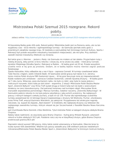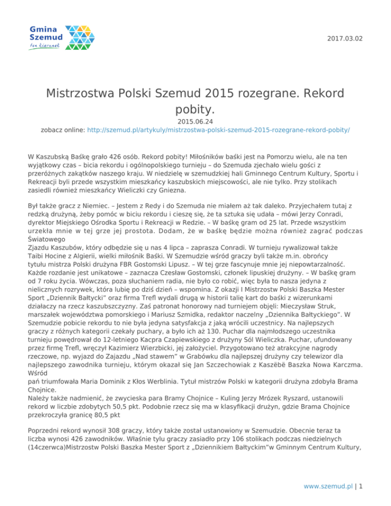 2017.03.02 Mistrzostwa Polski Szemud 2015 rozegrane. Rekord pobity. 2015.06.24 zobacz online: http://szemud.pl/artykuly/mistrzostwa-polski-szemud-2015-rozegrane-rekord-pobity/ W Kaszubską Baśkę grało 426 osób. Rekord pobity! Miłośników baśki jest na Pomorzu wielu, ale na ten wyjątkowy czas – bicia rekordu i ogólnopolskiego turnieju – do Szemuda zjechało wielu gości z przeróżnych zakątków naszego kraju. W niedzielę w szemudzkiej hali Gminnego Centrum Kultury, Sportu i Rekreacji byli przede wszystkim mieszkańcy kaszubskich miejscowości, ale nie tylko. Przy stolikach zasiedli również mieszkańcy Wieliczki czy Gniezna. Był także gracz z Niemiec. – Jestem z Redy i do Szemuda nie miałem aż tak daleko. Przyjechałem tutaj z redzką drużyną, żeby pomóc w biciu rekordu i cieszę się, że ta sztuka się udała – mówi Jerzy Conradi, dyrektor Miejskiego Ośrodka Sportu i Rekreacji w Redzie. – W baśkę gram od 25 lat. Przede wszystkim urzekła mnie w tej grze jej prostota. Dodam, że w baśkę będzie można również zagrać podczas Światowego Zjazdu Kaszubów, który odbędzie się u nas 4 lipca – zaprasza Conradi. W turnieju rywalizował także Taibi Hocine z Algierii, wielki miłośnik Baśki. W Szemudzie wśród graczy byli także m.in. obrońcy tytułu mistrza Polski drużyna FBR Gostomski Lipusz. – W tej grze fascynuje mnie jej niepowtarzalność. Każde rozdanie jest unikatowe – zaznacza Czesław Gostomski, członek lipuskiej drużyny. – W baśkę gram od 7 roku życia. Wówczas, poza słuchaniem radia, nie było co robić, więc była to nasza jedyna z nielicznych rozrywek, która lubię po dziś dzień – wspomina. Z okazji I Mistrzostw Polski Baszka Mester Sport „Dziennik Bałtycki” oraz firma Trefl wydali drugą w historii talię kart do baśki z wizerunkami działaczy na rzecz kaszubszczyzny. Zaś patronat honorowy nad turniejem objęli: Mieczysław Struk, marszałek województwa pomorskiego i Mariusz Szmidka, redaktor naczelny „Dziennika Bałtyckiego”. W Szemudzie pobicie rekordu to nie była jedyna satysfakcja z jaką wrócili uczestnicy. Na najlepszych graczy z różnych kategorii czekały puchary, a było ich aż 130. Puchar dla najmłodszego uczestnika turnieju powędrował do 12-letniego Kacpra Czapiewskiego z drużyny Sól Wieliczka. Puchar, ufundowany przez firmę Trefl, wręczył Kazimierz Wierzbicki, jej założyciel. Przygotowano też atrakcyjne nagrody rzeczowe, np. wyjazd do Zajazdu „Nad stawem” w Grabówku dla najlepszej drużyny czy telewizor dla najlepszego zawodnika turnieju, którym okazał się Jan Szczechowiak z Kaszëbë Baszka Nowa Karczma. Wśród pań triumfowała Maria Dominik z Kłos Werblinia. Tytuł mistrzów Polski w kategorii drużyna zdobyła Brama Chojnice. Należy także nadmienić, że zwycieska para Bramy Chojnice – Kuling Jerzy Mrózek Ryszard, ustanowili rekord w liczbie zdobytych 50,5 pkt. Podobnie rzecz się ma w klasyfikacji drużyn, gdzie Brama Chojnice przekroczyła granicę 80,5 pkt Poprzedni rekord wynosił 308 graczy, który także został ustanowiony w Szemudzie. Obecnie teraz ta liczba wynosi 426 zawodników. Właśnie tylu graczy zasiadło przy 106 stolikach podczas niedzielnych (14czerwca)Mistrzostw Polski Baszka Mester Sport z „Dziennikiem Bałtyckim”w Gminnym Centrum Kultury, www.szemud.pl | 1 2017.03.02 Sportu i Rekreacji w Szemudzie. Imprezę współorganizowałDziennik Bałtycki. Gracze rywalizowali w kilku kategoriach: drużynowej, par oraz indywidualnej. Puchary przygotowano również m.ni. dla najmłodszego uczestnika oraz dla najlepszych drużyn w powiecie. Na zwycięzców czekałobardzo wiele atrakcyjnych nagród: dla najlepszego zawodnika telewizor, najlepsza drużyna pojedzie na wyjazd do Zajazdu nad Stawem w Grabówku. Laureaci otrzymali też porcelanę z Łubiany. Charakter MistrzostwPolskiw baśkę podkreśliła m.in. wydana przez „Dziennik Bałtycki” druga w historii talia kart do kaszubskiej baśki z wizerunkami działaczy na rzecz kaszubszczyzny. Partnerem wydania talii była firma Trefl. Prezes Trefla, Kazimierz Wierzbickibył z nami podczas bicia baśkarskiego rekordu. Osobiście wręczył puchar dla najmłodszego zawodnika, 12-letniego Kacpra Czapiewskiego z Soli Wieliczki. Obecny był teżMieczysław Struk,marszałek województwapomorskiego. – Ustanowiliście rekord! Gratuluję! – mówiłMieczysław Struk.- To rekord pobity dzięki Kaszubom i miłośnikom baski. A odtąd Szemud jest stolicą baśki. Nagrody wręczali: Aleksandra Perz, przewodnicząca Rady Gminy Szemud, Dariusz Męczykowski, radny wojewódzki, Tomasz Niski,prezesPolska Press sp. z o.o. oddział Prasa Bałtycka oraz Mariusz Szmidka, redaktor naczelny Dziennika Bałtyckiego. Imprezę od początku do końca poprowadził Adam Plutowski, szef m.in. kościerskiego oddziału DB. Organizatorzy nie zapomnieli o poczęstunku dla grających. Podczas tzw. przerwy obiadowej każdemu graczowi przysługiwał talerz grochówki, były też kiełbaski z grilla. Zaś panie z KGW Łebieńska Huta przygotowały słodki poczęstunek: oprócz ciast były nawet koktajle ze świeżych truskawek. W poniedziałek 15 czerwca w „Dzienniku Bałtyckim” ukaże się zdjęcie wszystkich uczestników. O baśce będziemy tez pisali we wtorkowym wydaniu DB oraz w piątkowych tygodnikach lokalnych. Joanna Kielas – Dziennik Bałtycki Pełna lista wyników do pobrania – kliknij TUTAJ. Wyniki – kategoria drużynowa 1 Brama Chojnic 80,5 2 MARWoje Gdańsk 79,0 3 Chojny Chojnice 70,5 4 Białogóra 68,0 5 Gniew Zamek 67,5 6 Bałtyk Władysławowo 65,5 7 Tornado Lębork 65,0 8 Algieria Gniezno 65,0 9 Bętk Sierakowice 65,0 10 Zantyr II Sztum 64,5 11 Szpela Władysławowo 64,5 12 Szpela II Władysławowo 65 www.szemud.pl | 2 2017.03.02 13 PKA Gdynia 63,0 14 Toro Trans Chojnice 63,0 15 Kaszëbë Baszka Nowa Karczma 63 Wyniki – kategoria indywidualna panowie 1 Szczechowiak Jan – Kaszëbë Baszka Nowa Karczma 