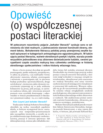 HORYZONTY POLONISTYKI Opowieść (o) współczesnej postaci literackiej Hanna Gosk W potocznym rozumieniu pojęcie „bohater literacki” zyskuje sens w odniesieniu do istot realnych, a jednocześnie stanowi konstrukt słowny, element tekstu. Bohaterowie literaccy polskiej prozy powojennej zwykle bywali opisywani w kategoriach antropologiczno-egzystencjalnych. W takim ujęciu postać literacka, wytwór określonych poetyk i stylów, wyraża przede wszystkim jednostkowe oraz zbiorowe doświadczenie ludzkie, swoimi perypetiami często uosabia matrycę losu człowieka uwikłanego w historię określonego społeczeństwa i mikro-historię własnego losu. Skoro o bycie postaci decyduje jej sposób postrzegania, punkt widzenia, perspektywa, w jakiej się pojawia, a jej nadrzędne formy aktywności stanowią właśnie postrzeganie i mówienie o postrzeganiu tak, że pierwsza buduje podwaliny opowieści/historii, druga zaś dyskursu, istotne jest, jakie elementy rze czywistości pojawiają się w polu widzenia bohaterów tej prozy, jeśli przyjąć, iż zarów no nadawca tekstu, jak i stworzone przezeń postacie oraz czytelnik dostrzegają – odpo wiednio w świecie przedstawionym w literatu rze i przestrzeni realnej – to, co o nich wiedzą. Kim (czym) jest bohater literacki? Tradycyjnie funkcję bohatera literackiego określało się wobec wszystkich aspektów dzieła, w którym występował (m.in. narra cyjnych oraz temporalno-przestrzennych jako szczególnie istotnych), a czyniło się to po zdefiniowaniu jego dominanty osobowo ściowej, pozycji w utworze (pierwszo- lub dalszoplanowej), statusu jako składnika mo delu świata lub nośnika orientacji ideowej. Dookreślało się również jego pozycję wobec postaci z innych utworów literackich, z któ rymi mógł wchodzić w znaczące związki in tertekstualne, aktualizować pola znaczenio we tradycji literackiej oraz sensy wzorów osobowościowych istniejących w świadomoś ci potocznej lub naukowej. Wreszcie odno siło się go do rzeczywistości pozaliterackiej. Ta ostatnia relacja uwzględniała ustalenie psychologiczno-obyczajowej reprezentatyw ności bohatera literackiego wobec zbiorowoś ci realnych. Tak analizowana postać zawie rała wartości konstrukcyjne, obrazowe, po znawczo-oceniające, postulatywne. Bohater literacki jest jednak przede wszyst kim faktem historyczno-literackim, katego rią poetyki historycznej, a więc typem dys kursu, w którym, jak powiada Edward Kas 1 E. Kasperski, Między poetyką i antropologią pos taci. Szkic zagadnień, w: Postać literacka. Teoria i historia, pod red. E. Kasperskiego i B. Pawłow skiej-Jądrzyk, Warszawa 1998, s. 9-41. polonistyka HORYZONTY POLONISTYKI perski, można wyróżnić trzy płaszczyzny: go nie wykazuje, a co wydaje się typowe dla mówienie postaci, mówienie o postaci i mó kultury epoki. wienie postacią. Dodałabym, iż płaszczyzny W znanej pracy Henryka Markiewicza po owe, jakkolwiek możliwe do wyłowienia święconej bohaterowi literackiemu mówi się w konstrukcji każdego bohatera, z różnym o degradacji i redukcji postaci w literaturze nasileniem dają o sobie znać w przypadkach współczesnej, o jej instrumentalnym wyko indywidualnych, kiedy to zawsze któraś rzystaniu do ukazywania uniwersalnych pro z nich okazuje się płaszczyzną nadającą ton cesów oraz mechanizmów psychicznych, o nadaniu jej statusu składnika parabolicz całemu dyskursowi. Postać traktowana jako figura tekstu (prze nego modelu sytuacji człowieka w świecie, pływ aktów językowej prezentacji lub/i auto a nawet ograniczeniu do wymiaru tworzywa prezentacji z istoty swej następczych) oraz eksperymentu formalnego. W XX-wiecznej po jako figura świata przedstawionego (tu wieści pojawia się bo Ranga znaczenia bohatera czasowość zawiera się hater o dwu lub więcej literackiego zależy od jego w jej opowiedzianej obliczach (Lolita Na zdolności przemiany w uniwersalny historii) wykazuje wła bokova, Blaszany bę znak wartości. sności i pełni funkcje benek Grassa, Baku semantyczne znaku nowy faktor Bartha). zapośredniczonego jednak w swych sensach Towarzyszy temu uniwersalizacja temporal przez myślenie o człowieku, z jego ideałami na, odrzucenie przyczynowości i wielkiej hi etyczno-estetycznymi, sposobami mówienia storii zdarzeniowej na rzecz cyklicznych na wrotów czasu i mitu zastępującego tak rozu i myślenia. mianą historię. Wizerunek bohatera nabiera Klasyfikacja postaci cech archetypu. Bywa, że w prozie XXBadacze zagadnienia przypominają utrwa -wiecznej określenia typizujące, dotyczące lone w historii próby klasyfikacji ogólnej pos płci, wieku, charakteru, wykształcenia, wyz taci: według postaw – introwertyk, ekstra nania, profesji, przynależności społecznej, wertyk; typów charakterologicznych – me narodowości postaci literackiej, które wcze lancholik, flegmatyk, pyknik, sangwinik; ka śniej służyły budowaniu uporządkowanej tegorii socjologicznych – artysta, chłop, wizji świata, spychają zasady mimetyczności mieszczanin, inteligent etc.; według katego w jej odbiorze na margines i odwołują się rii antropologicznych – homo faber, homo do kultury literackiej odbiorcy, do znanych naturalis, homo loquens – czy według zasady mu norm społeczno-obyczajowych epoki, funkcjonalności – bohaterowie pierwszo-, co nie oznacza jednak, że w rekonstrukcji drugoplanowi, zaznaczając, iż postać należy sensu wizerunku postaci nie warto koncen zwykle do kilku klas równocześnie, i to klas trować się na wykrywaniu podstawowych o zatartych granicach. W analizie figury se kategorii myślowych, charakterystycznych mantycznej, jaką stanowi, bierze się pod uwa dla obyczajowości i typu kultury, z którą gę konwencjonalne dane wynikające z posta dana postać zdaje się być związana. Pozwa ciowania bezpośredniego (personalia, wy la to bowiem wydobyć determinanty mo gląd zewnętrzny, ocenę cech osobowości) dyfikujące w owej kulturz