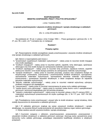 Dz.U.03.72.655 ROZPORZĄDZENIE MINISTRA GOSPODARKI, PRACY I POLITYKI SPOŁECZNEJ1) z dnia 1 kwietnia 2003 r. w sprawie przechowywania i używania środków strzałowych i sprzętu strzałowego w zakładach górniczych (Dz. U. z dnia 29 kwietnia 2003 r.) Na podstawie art. 78 ust. 2 ustawy z dnia 4 lutego 1994 r. - Prawo geologiczne i górnicze (Dz. U. Nr 27, poz. 96, z późn. zm.2)) zarządza się, co następuje: Rozdział 1 Przepisy ogólne § 1. Rozporządzenie określa szczegółowe zasady przechowywania i używania środków strzałowych oraz sprzętu strzałowego w zakładach górniczych. § 2. Ilekroć w rozporządzeniu jest mowa o: 1) "przedmiotach wypełnionych materiałem wybuchowym" - należy przez to rozumieć środki inicjujące oraz środki zapalające; 2) "środkach inicjujących" - należy przez to rozumieć spłonki, zapalniki, lonty detonujące, opóźniacze detonujące oraz inne środki służące do zainicjowania materiału wybuchowego; 3) "środkach zapalających" - należy przez to rozumieć lonty prochowe, zapalacze lontowe, zapalniki elektryczne nieostre i inne środki służące pośrednio do zainicjowania materiału wybuchowego; 4) "sprzęcie strzałowym" - należy przez to rozumieć przyrządy, przybory oraz urządzenia służące do bezpiecznego: przewożenia, przenoszenia i przechowywania środków strzałowych, sporządzania, wprowadzania materiałów wybuchowych, wprowadzania ładunków materiału wybuchowego, konstruowania i sprawdzania obwodów strzałowych, a także urządzenia służące do odpalania ładunków materiałów wybuchowych; 5) "ładunku materiału wybuchowego" - należy przez to rozumieć materiał wybuchowy uzbrojony środkiem inicjującym lub zapalającym; 6) "rzeczoznawcy" - należy przez to rozumieć rzeczoznawcę do spraw ruchu zakładu górniczego; 7) "osobie dozoru ruchu górniczego" - należy przez to rozumieć osobę dozoru ruchu o specjalnościach górniczych: techniczna eksploatacja złóż lub technika strzałowa; 8) "ustawie o materiałach wybuchowych" - należy przez to rozumieć ustawę z dnia 21 czerwca 2002 r. o materiałach wybuchowych przeznaczonych do użytku cywilnego (Dz. U. Nr 117, poz. 1007 i Nr 238, poz. 2019). § 3. Przedsiębiorca może przechowywać i używać tylko te środki strzałowe i sprzęt strzałowy, które zostały dopuszczone do stosowania w zakładzie górniczym. § 4. 1. W zakładzie górniczym znajduje się wykaz używanych środków strzałowych i sprzętu strzałowego, na używanie których wydał pozwolenie lub zezwolenie właściwy organ nadzoru górniczego. 2. Wykaz zawiera warunki używania środków i sprzętu strzałowego. § 5. 1. Czynności związane z odbiorem, przechowywaniem, przewożeniem, przenoszeniem i używaniem środków strzałowych w zakładzie górniczym wykonują i dozorują osoby upoważnione przez kierownika ruchu zakładu górniczego, posiadające odpowiednie kwalifikacje określone w odrębnych przepisach. 2. Osoba dozoru ruchu górniczego może wyznaczyć do pomocy przy przenoszeniu materiału wybuchowego pracowników przeszkolonych w zakresie postępowania z materiałami wybuchowymi. 3. Odbiorca środków strzałowych, któremu wyznaczono do pomocy przy przenoszeniu materiału wybuchowego pracowników, o których mowa w ust. 2, sprawuje nadzór nad tymi pracownikami. § 6. W miejscach, w których znajdują się środki strzałowe, w ich otoczeniu oraz podczas wykonywania czynności związanych bezpośrednio ze środkami strzałowymi niedozwolone jest używanie ognia, palenie tytoniu ani stosowanie materiałów i urządzeń mogących być źródłem iskrzenia, zdolnego do zainicjowania środków strzałowych. § 7. Środki strzałowe i zapalarki zabezpiecza się w sposób uniemożliwiający dostęp do nich osobom nieupoważnionym. § 8. Każda osoba zatrudniona w ruchu zakładu górniczego powinna być zapoznana z wyglądem środków strzałowych, a także poinformowana o: 1) niebezpieczeństwie, które może wystąpić przy niewłaściwym obchodzeniu się ze środkami strzałowymi; 2) sposobach zachowania się przy wykonywaniu robót strzałowych; 3) znaczeniu sygnałów i znaków ostrzegawczych stosowanych w zakładzie górniczym, w związku z wykonywaniem robót strzałowych. § 9. 1. Osoby zatrudnione w ruchu zakładu górniczego powinny: 1) zachować szczególną ostrożność przy wykonywaniu czynności związanych z środkami strzałowymi; 2) bez zbędnej zwłoki informować najbliższą osobę dozoru ruchu o każdym stwierdzonym przypadku braku środków strzałowych i zapalarek, w szczególności będącym następstwem kradzieży lub zgubienia, o przypadkach znalezienia oraz pozostawienia bez dozoru środków strzałowych, a także o innych faktach i okolicznościach, które mogą spowodować niebezpieczeństwo wybuchu środków strzałowych. 2. Osoba dozoru ruchu, która otrzymała informację o przypadkach określonych w ust. 1 pkt 2, przekazuje ją niezwłocznie kierownikowi ruchu zakładu górniczego; kierownik ruchu zakładu górniczego o zaistniałych przypadkach zawiadamia właściwy organ nadzoru górniczego i najbliższą jednostkę Policji. 3. Przepisu ust. 2 nie stosuje się w przypadku znalezienia środków strzałowych w urobku, w ciągu technologicznym. § 10. Kierownik ruchu zakładu górniczego, dla każdego miejsca wykonywania robót strzałowych, ustala bezpieczny sposób: 1) przewożenia i przenoszenia środków strzałowych; 2) przechowywania i zabezpieczania środków strzałowych w pobliżu miejsca wykonywania robót strzałowych; 3) wykonywania prac przygotowawczych, poprzedzających wykonywanie właściwych robót strzałowych; 4) ochrony ludzi i mienia przed skutkami robót strzałowych; 5) utrzymania ciągłości ruchu zakładu górniczego podczas wykonywania robót strzałowych. Rozdział 2 Przechowywanie środków strzałowych i sprzętu strzałowego § 11. 1. Z zastrzeżeniem § 22, środki strzałowe przechowuje się w zakładzie gór