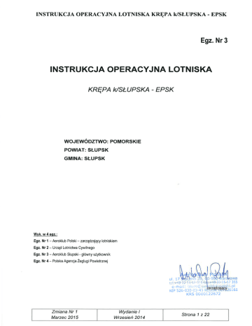 INSTRUKCJA OPERACYJNA LOTNISKA KRĘPA k/SŁUPSKA - EPSK Spis treści STRONA Spis treści 2 Karta uzgodnień i karta podpisów 3-4 Tabela zmian 5 CZĘŚĆ 1. Informacje ogólne 7-17 CZĘŚĆ 2. Dane dotyczące lotniskowych procedur operacyjnych i środków bezpieczeństwa 18-21 CZĘŚĆ 3. Informacje dodatkowe 22 Załączniki: Załącznik nr 1: Szkic - z naniesionymi elementami lotniska Załącznik nr 1a: Szkic - z naniesionymi ograniczeniami ruchu na lotnisku Załącznik nr 1b: Schemat układu świateł drogi startowej przeznaczonej do lotów nocnych + Instrukcja Załącznik nr 2: Plan umiejscowienia lotniska na mapie w skali 1:500 000 Załącznik nr 3: Kręgi nadlotniskowe Załącznik nr 4: Plan powierzchni ograniczających w skali 1:25 000 - tylko na potrzeby PAŻP Załącznik nr 5 Trasy dolotowe i odlotowe Załącznik nr 6 Książka kontroli lotniska (4 strony) Zmiana nr 1 marzec 2015 Wydanie I wrzesień 2014 Strona 2 / 22 INSTRUKCJA OPERACYJNA LOTNISKA KRĘPA k/SŁUPSKA - EPSK TABELA ZMIAN ZMIANA 1 Marzec 2015 OPIS ZMIANY DATA / PODPIS str. 2 – Załącznik 1B str. 6 pkt. 1.2 ppkt b) str. 8 pkt 1.5 str. 12 pkt 1.17.4 str. 14 pkt 1.18 ppkt b) str. 15 pkt 1.19 str. 18 pkt 2.2.2 ; 2.3 str. 19 pkt 2.3 ; 2.3.2 Załącznik Nr 6 2 3 4 5 6 7 8 9 10 Zmiana nr 1 marzec 2015 Wydanie I wrzesień 2014 Strona 4 / 22 INSTRUKCJA OPERACYJNA LOTNISKA KRĘPA k/SŁUPSKA - EPSK Procedura wprowadzania zmian: Projekt zmiany do Instrukcji powinien być zatwierdzony przez Prezesa Urzędu Lotnictwa Cywilnego oraz uzgodniony przez Prezesa Polskiej Agencji Żeglugi Powietrznej. Projekt zmiany musi obowiązkowo zawierać 5 stronę Instrukcji i strony podlegające zmianie z wykazanym numerem zmiany oraz datą obowiązywania. Zmiana nr 0 Wydanie I wrzesień 2014 Strona 5 / 22 INSTRUKCJA OPERACYJNA LOTNISKA KRĘPA k/SŁUPSKA - EPSK CZĘŚĆ 1. INFORMACJE OGÓLNE 1.1 Cel i zakres Instrukcji Operacyjnej Lotniska. Instrukcja Operacyjna Lotniska została opracowana celem zapewnienia bezpiecznego wykonywania operacji lotniczych statków powietrznych na tym lotnisku. Zakres Instrukcji ograniczony jest do urządzeń lotniskowych, służb, wyposażenia oraz procedur. Niniejsza Instrukcja podlega zatwierdzeniu przez Prezesa Urzędu Lotnictwa Cywilnego po uzgodnieniu przez Prezesa Polskiej Agencji Żeglugi Powietrznej. 1.2 Warunki użytkowania lotniska: a) lotnisko użytku wyłącznego; b) czynne w dzień i w nocy przez cały rok, (o ile w okresie zimowym na płycie lotniska nie zalega pokrywa śnieżna – informacja u Głównego użytkownika). Godziny pracy: Zarządzający Aeroklub Polski dni robocze: 8.00– 16:00 LMT Główny użytkownik Aeroklub Słupski dni robocze: 8.00 – 16.00 LMT Przyloty w godzinach pracy lotniska należy uzgodnić z Głównym użytkownikiem lotniska na minimum 24h godziny przed planowanym przylotem. Przyloty poza godzinami pracy lotniska oraz w dni świąteczne, należy uzgodnić z Głównym użytkownikiem lotniska z wyprzedzeniem 72 h. c) tel. kontaktowe w razie przylotów: tel/fax (059) 84 61 686 (Biuro Aeroklubu na lotnisku); 532 611 502 (Dyrektor Aeroklubu), 602 449 116 (Kierownik Szkolenia Aeroklubu). d) Użytkownicy bazujący na stałe na lotnisku: główny użytkownik: Aeroklub Słupski, 76-200 Słupsk ul. Jana Kilińskiego 11; : tel/fax (059) 84 61 686; 532 611 502. Zmiana nr 1 marzec 2015 Wydanie I wrzesień 2014 Strona 6 / 22 INSTRUKCJA OPERACYJNA LOTNISKA KRĘPA k/SŁUPSKA - EPSK e) warunki współpracy w wykorzystywaniu lotniska między użytkownikami (sekcja spadochronowa, samolotowa, szybowcowa i inni użytkownicy) Każdorazowo uzgadniane z Dyrektorem lub Szefem Wyszkolenia Aeroklubu Słupskiego, f) zasady użytkowania lotniska w przypadku kilku użytkowników jednocześnie. Wszystkie operacje lotnicze muszą zostać uzgodnione z Głównym użytkownikiem – Aeroklubem Słupskim, który jest koordynatorem każdego rodzaju ruchu na lotnisku, określającym zasady wspólnego korzystania z lotniska dla bezpiecznego wykonywania lotów przez jego użytkowników. g) możliwość hangarowania, tankowania i typ paliwa jaki jest dostępny na lotnisku, dostępność obsługi technicznej: - hangarowanie samolotów, szybowców po wcześniejszym uzgodnieniu, postój na płycie, - tankowanie paliwa: brak możliwości; - obsługa techniczna: brak, h) informacje o planowanych lotach (Plany Lotów) powinny być przekazywane zgodnie z obowiązującymi procedurami i przepisami do: Biuro Odpraw Załóg GDAŃSK/ Rębiechowo czynne 24H tel.: +48-58-348-1156 , +48-22-574-7484 faks.: +48-58-340-7489 e-mail: [email protected] lub Biuro Odpraw Załóg SZCZECIN/Goleniów (05:00-21:00) tel.: +48-91-469-7959; +48-91-469-7934 Telefaks.: +48-91-418-2445 Wszelkie informacje dotyczące składania planów lotu dostępne są na www.ais.pansa.pl, w tym formularze do składania (wysyłania ) FPL drogą e-mail. Zgodnie z Aneksem 2 ICAO (pkt 3.3.1) warunkiem zapewnienia służby informacji powietrznej i służby alarmowej dla lotów VFR w przestrzeni powietrznej niekontrolowanej jest złożenie planu lotu. 1.3 Nazwa lotniska i kod lotniska według ICAO: KRĘPA k/Słupska – EPSK 1.4 Kod referencyjny lotniska: 1(ze względu na nawierzchnię naturalną obowiązuje jedynie cyfra kodu ICAO). Zmiana nr 0 Wydanie I wrzesień 2014 Strona 7 / 22 INSTRUKCJA OPERACYJNA LOTNISKA KRĘPA k/SŁUPSKA - EPSK 1.5 Znak wywoławczy i częstotliwość lotniska: KRĘPA RADIO: 118,250 MHz 1.6 Dane telefoniczne i adresowe Zarządzający lotniskiem Aeroklub Polski, ul. 17 Stycznia 39, 00-906 Warszawa tel.: +48 22 826 76 70; faks: +48 22 826 02 43 tel/faks +48 22 826 88 91 e-mail: [email protected] Główny użytkownik lotniska Aeroklub Słupski ul. Jana Kilińskiego 11, 76-200 Słupsk tel/fax. (59) 846 16 86, 532 611 502. e-mail: [email protected]łupski.pl 1.7 Dane telefoniczne i adresowe osoby odpowiedzialnej za bezpieczeństwo operacji na lotnisku. Dyrektor Aeroklubu Słupskiego, tel. – 532 611 502, 1.8 Lokalizacja lotniska w odniesieni